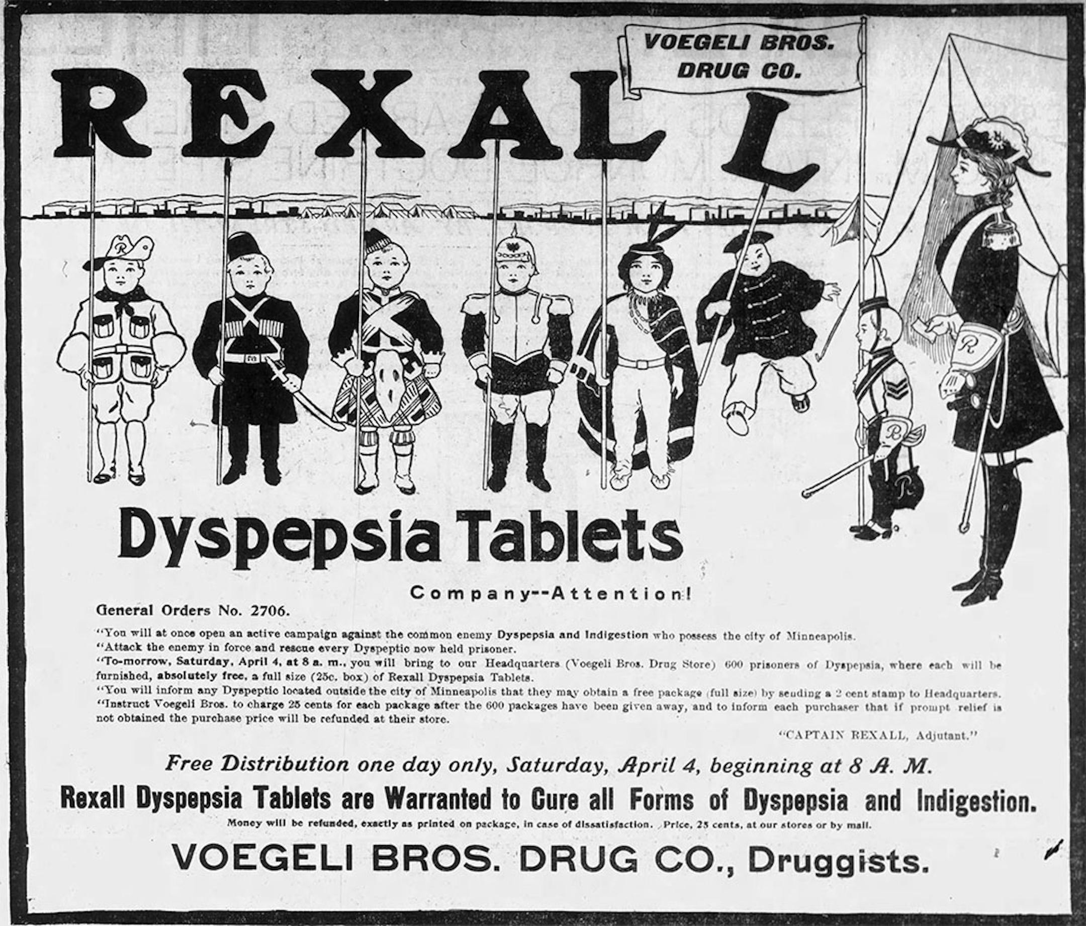 The future of the independents can be summed up in a 1903 ad campaign sponsored by a Minneapolis drugstore, Voegeli Bros. Drug Co. To drum up public excitement for a new dyspepsia pill, it took out a series of ads for Rexall.