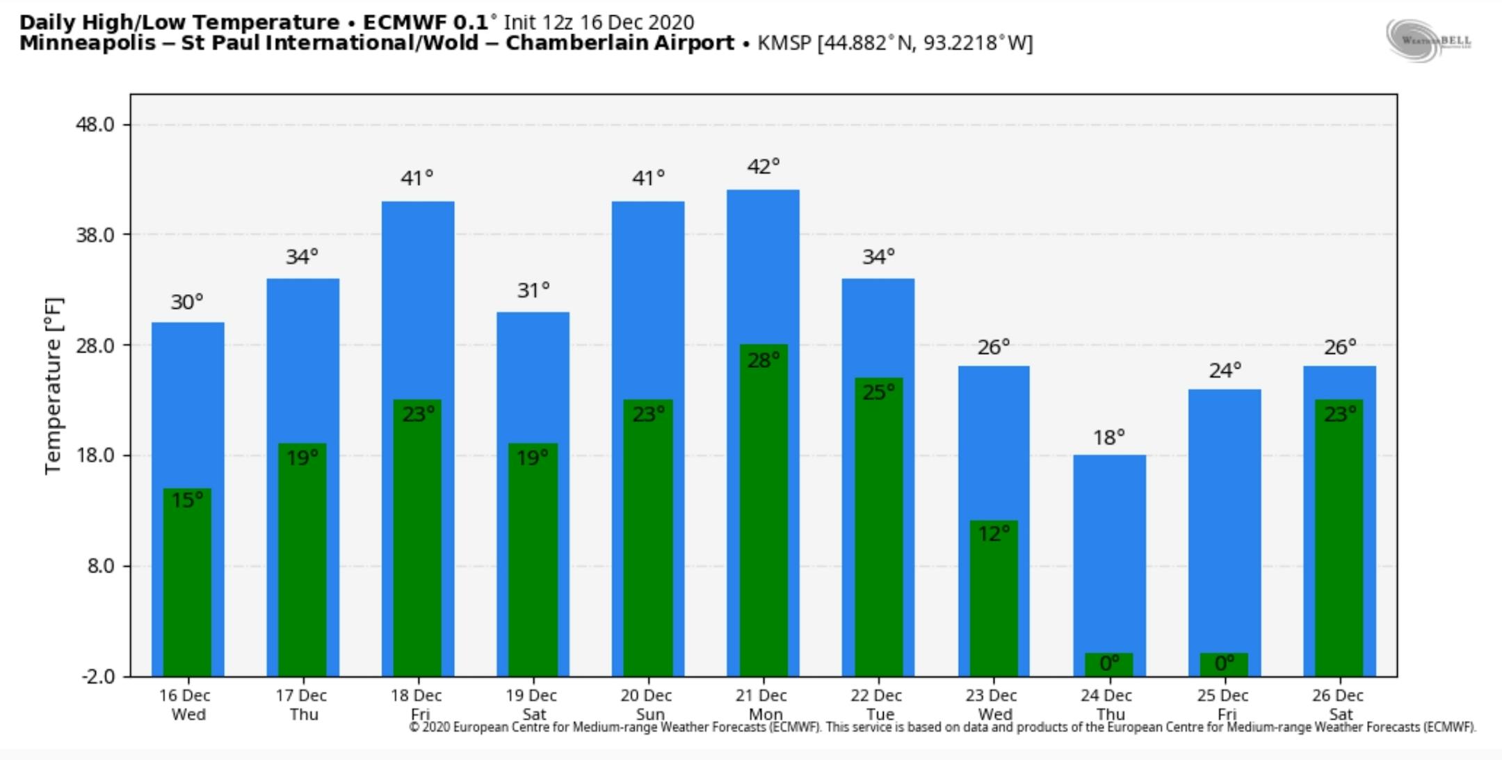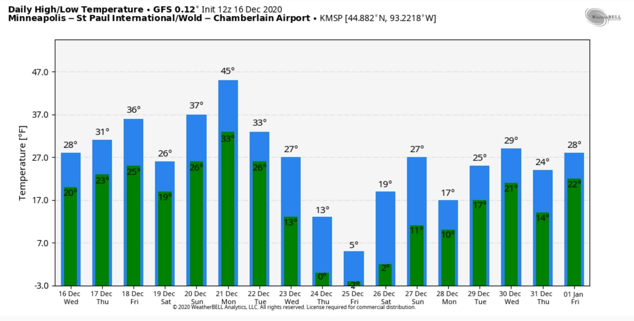 Christmas Chill. A white Christmas is in doubt, but at least there's a chance of some snow next Tuesday-Wednesday ahead of a noticeable shot of Canadian air just in time for Christmas. Highs hold in single digits and teens by the end of next week with some moderation expected the last week of 2020.