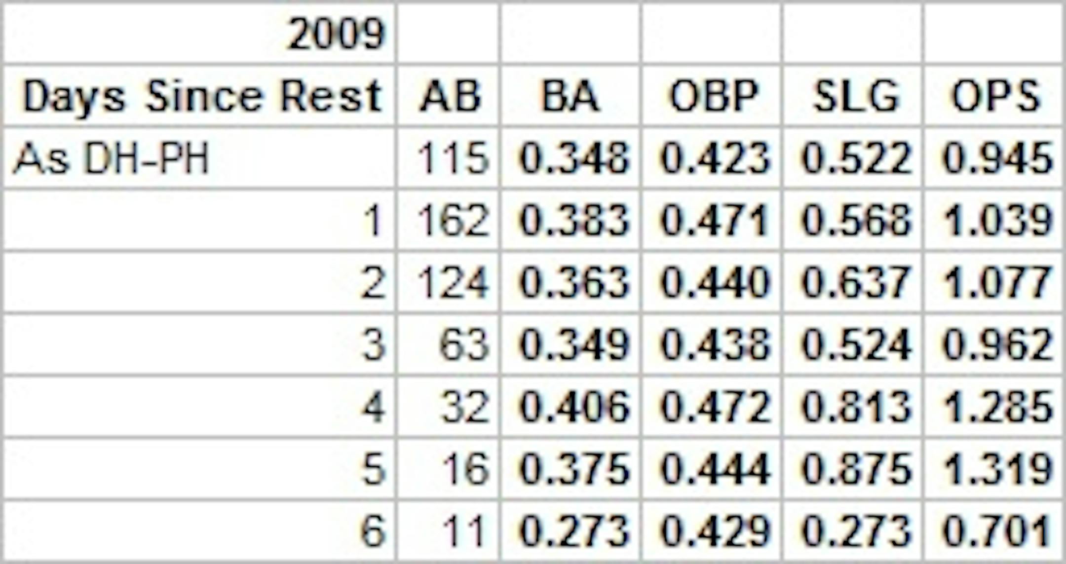 Hmm. I feel a rant about the Twins organization's ability to manage injuries coming on…. How many times have we had similar complaints or questions recently? Last year there was Neshek's hand. Mauer's heel. Hardy's wrist. Wasn't there some stuff with Hudson and Punto being out for a long time before going on the DL, too? This year we wait a week for Morneau to come back only to find out his neck is sore? We wait another week to put Delmon Young on the DL when we know he has a rib injury? Cuddyer has a slow start because a wart wasn't taken care of before spring training? Mauer tries to play through leg weakness by starting two consecutive night-day games in the first two weeks? Who the hell is managing this stuff? Dr. Leo Spaceman? Eh. Doing that rant justice requires a little more research than I have in me tonight, so let's get back to Mauer… A couple of weeks ago, I looked at Mauer's 2010 season, and we found that he hit a lot better soon after he either was rested or was the designated hitter. Here were the numbers:
