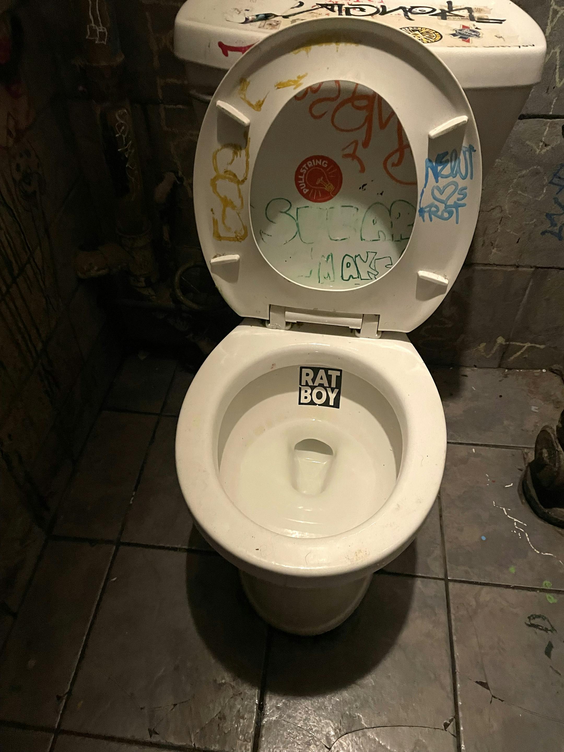 Ratboy’s name is everywhere — even on a sticker inside a toilet bowl at Minneapolis’ unabashedly grungy Caffetto Coffee Shop.