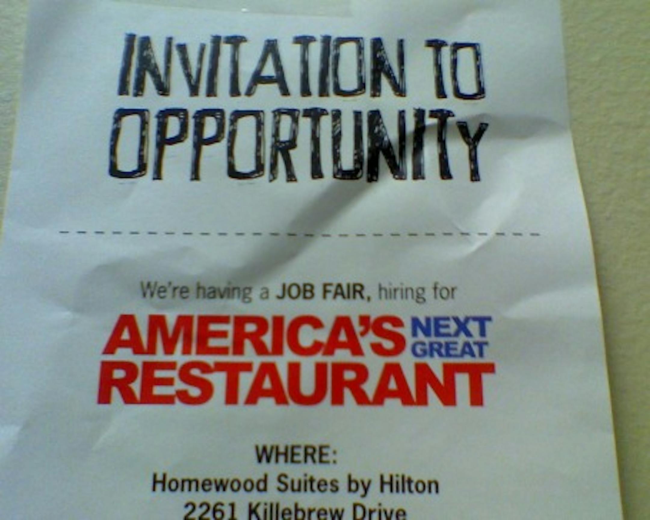 That's because the employer will be the winner of the TV reality show "America's Next Great Restaurant," and won't be announced until May 1 on the final NBC show -- and not a day before, we're told.