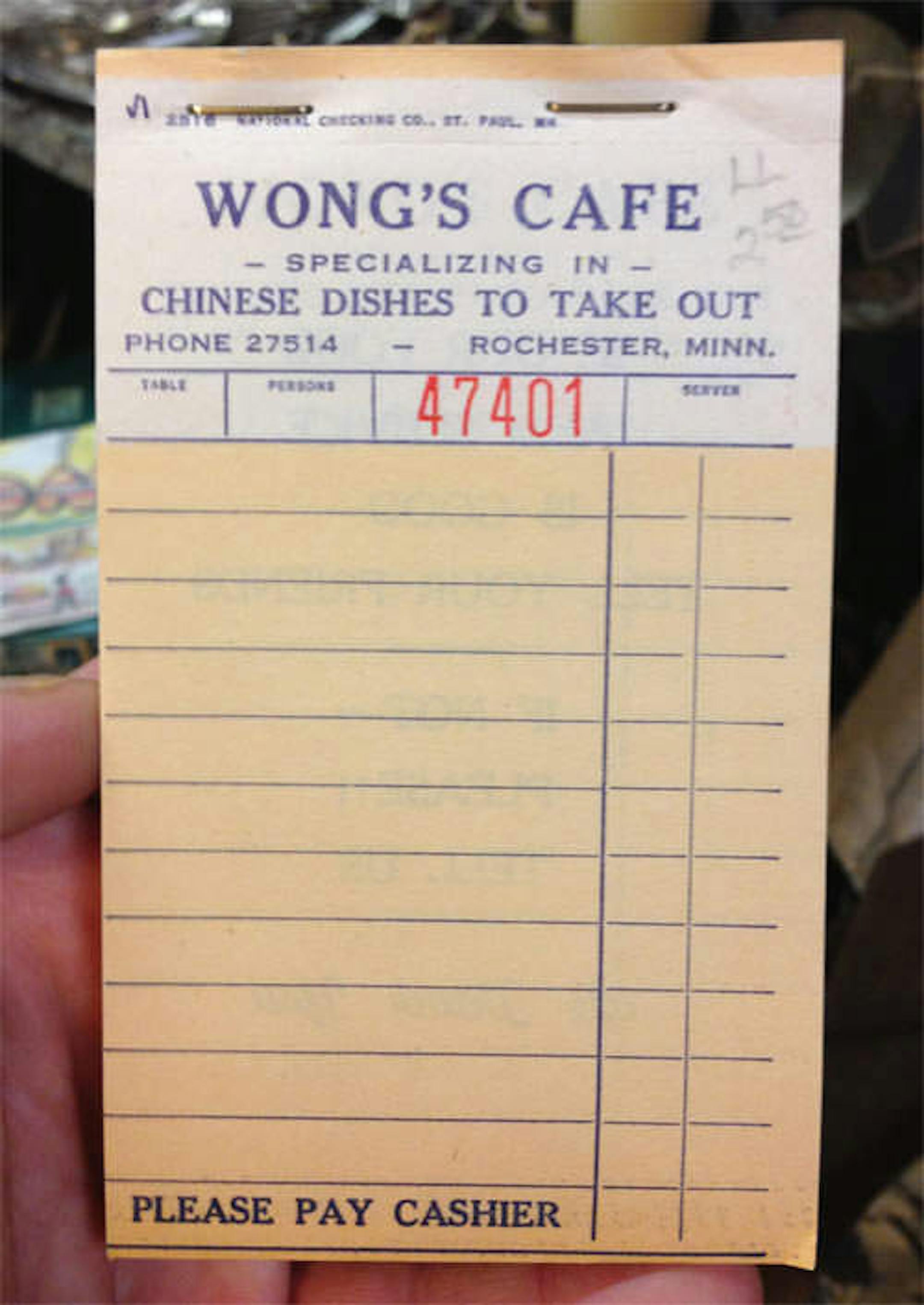 This one seems to work: an old guest-check pad from Wong's Cafe in Rochester.