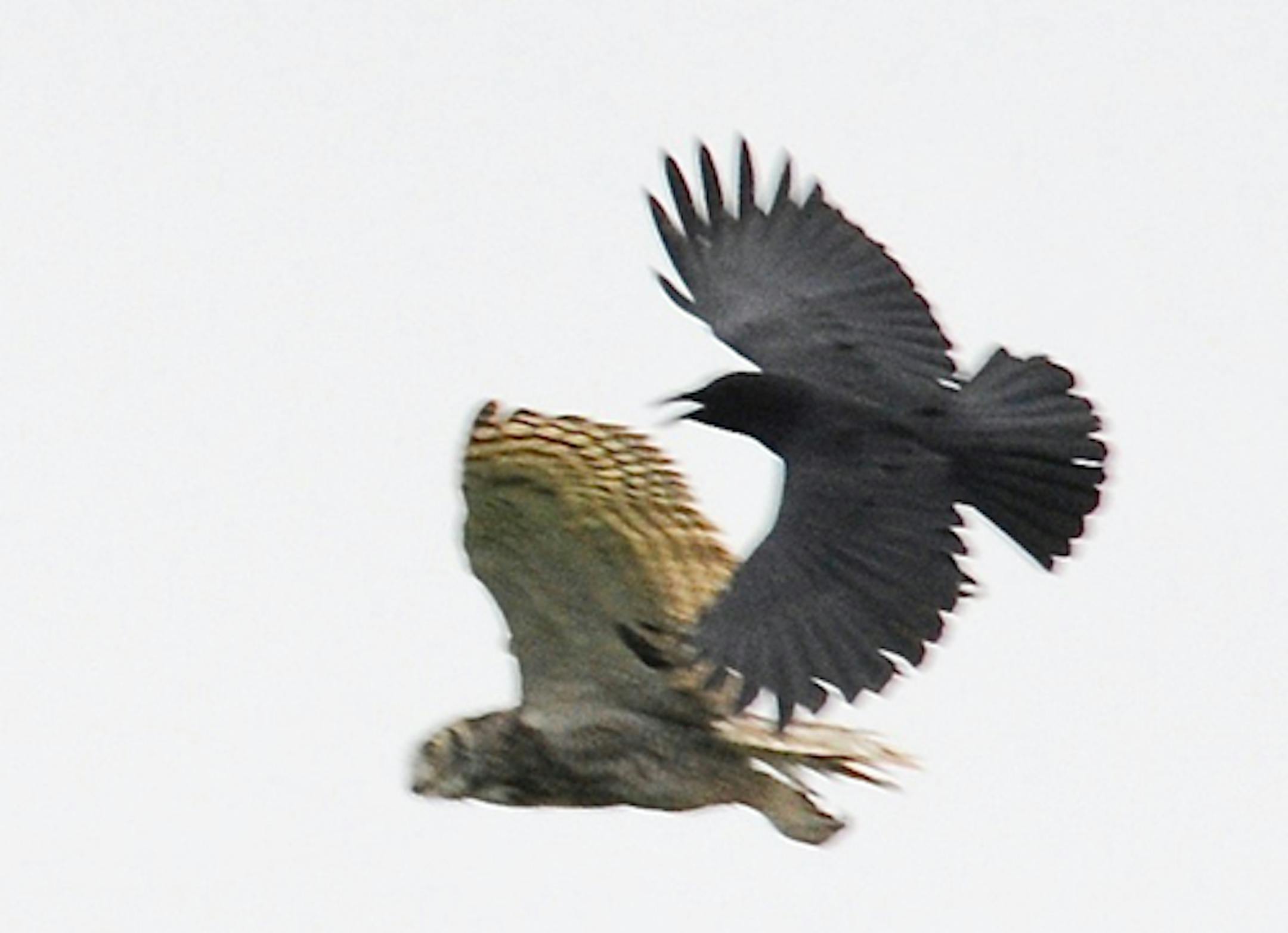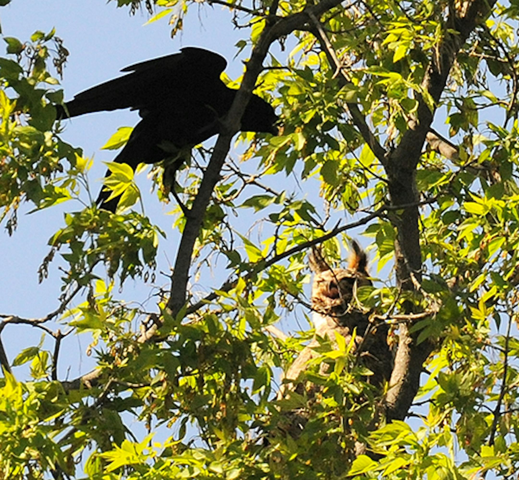 Crows defend themselves from raptors by persistent hazing called mobbing. One crow spots the perching enemy, raises the alarm with loud calls, organizing other crows with hearing distance. The crows call and call, and fly buzz-by attacks until they exhaust the patience of the enemy, driving it to flee.
