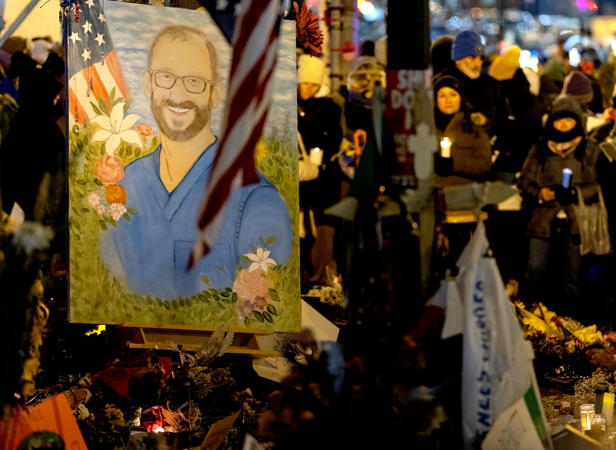 At Pretti’s memorial site at 26th Street and Nicollet Avenue, people spelled out “Long Live Alex Pretti” with pine cones in the snow. Fragrant incense and candles burned. Some handwritten signs thanked Pretti for his service as a nurse. People have placed mounds of bouquets at the site. Other signs denounced ICE and demanded justice.