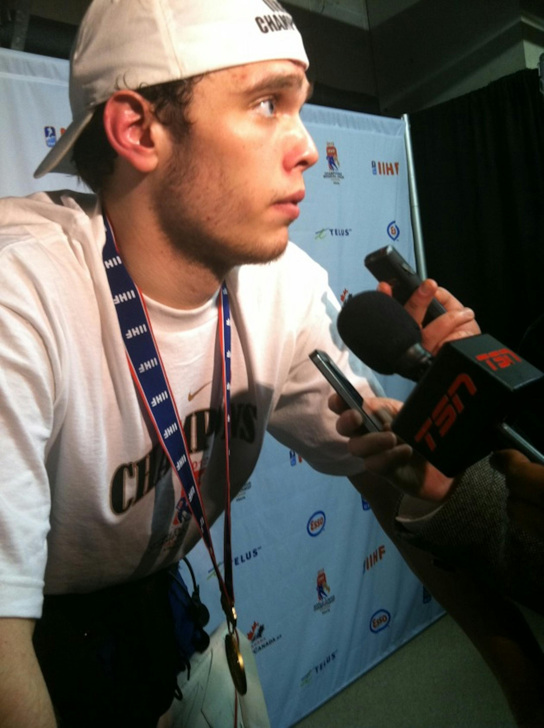 That's a picture I took of Johan Gustafsson in the media mixed zone after backstopping Team Sweden to gold at the world juniors in Calgary in January.