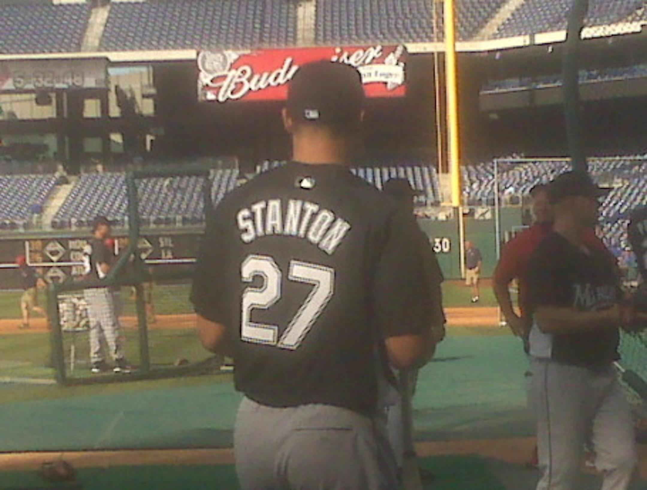 Coming to you live from Citizens Bank Park's press box, where I'm taking in slugger Mike Stanton's major-league debut for the Florida Marlins tonight against the Phillies. There's not exactly the hoopla here as Stephen Strasburg's debut in DC, but this guy will be a star.
