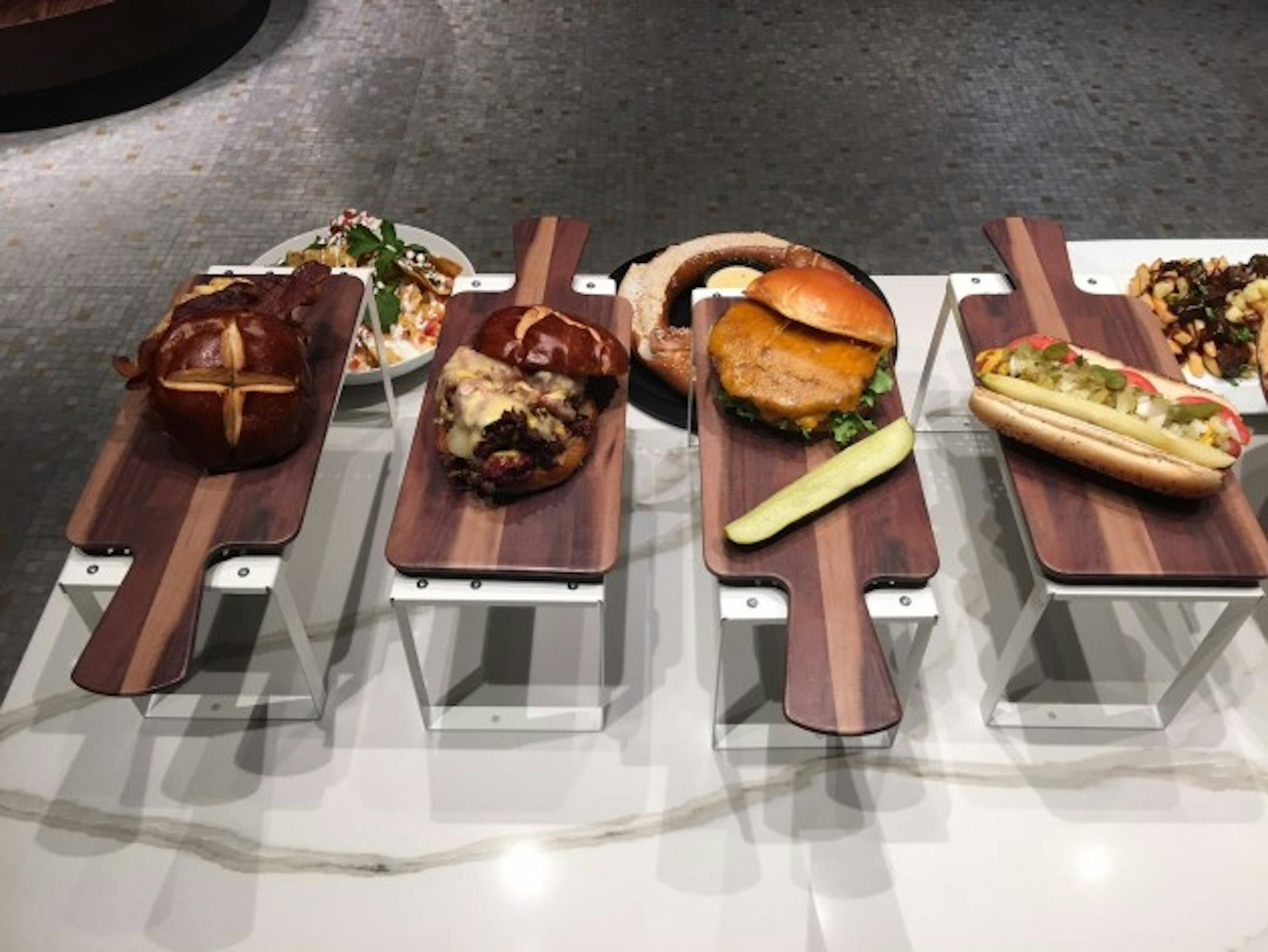 Food selections are grab and go or served within a few minutes-- spicy diavolo meat pizza, prosciutto and arugula pizza ($4.75/slice), hot turkey or pastrami sandwiches, and in a nod to Minnesota and our northern neighbors, shortrib poutine ($12) with short ribs, Wisconsin cheese curds and fries topped blanketed in dark, rich gravy. There's classic fare too-- cheeseburger ($10), fries ($6), a plate-sized Bavarian pretzel ($11), wings ($12). and nachos ($12).