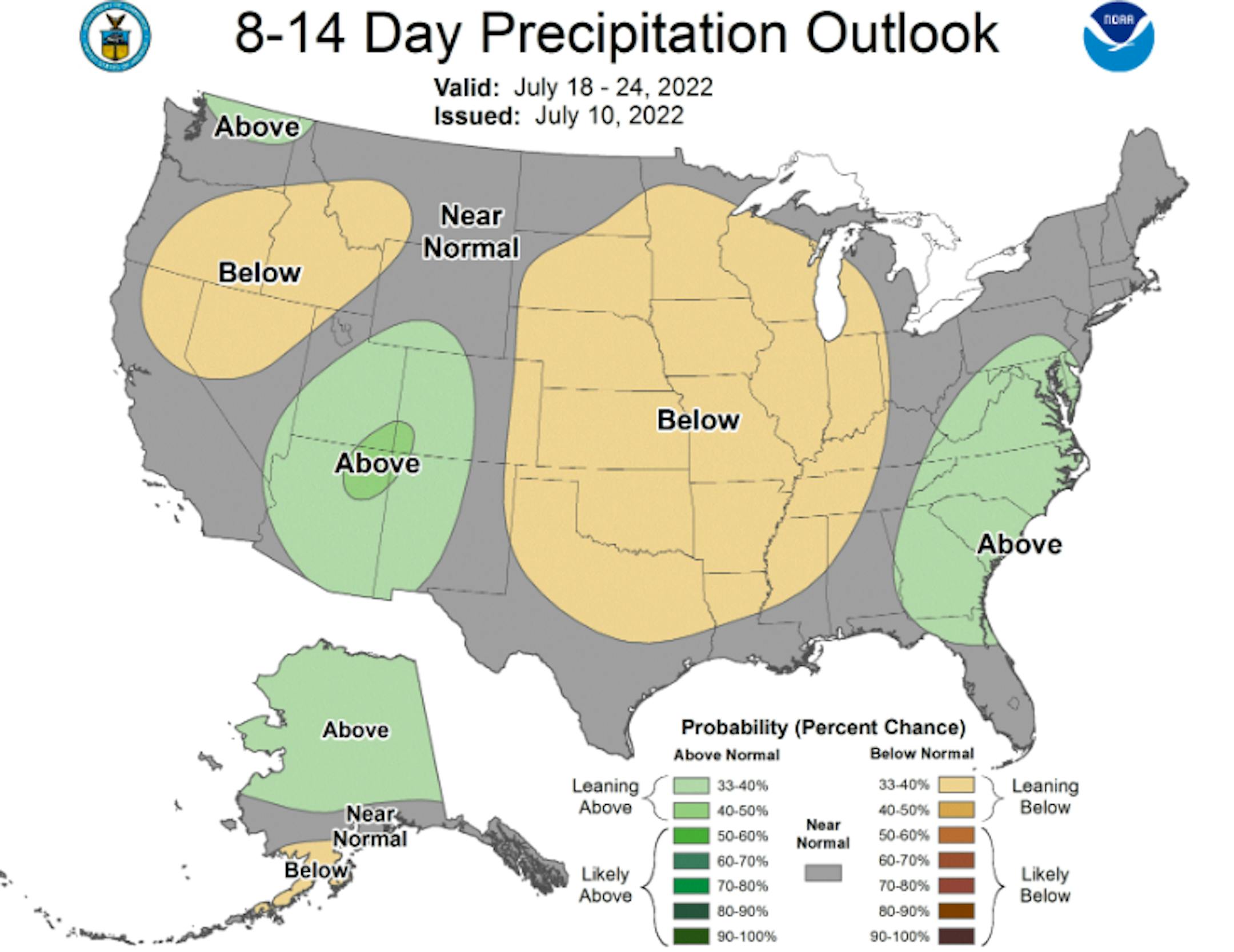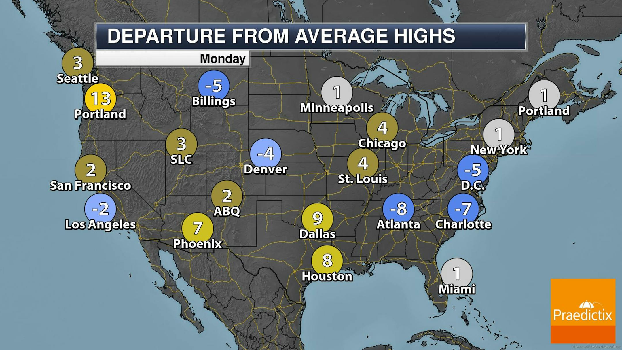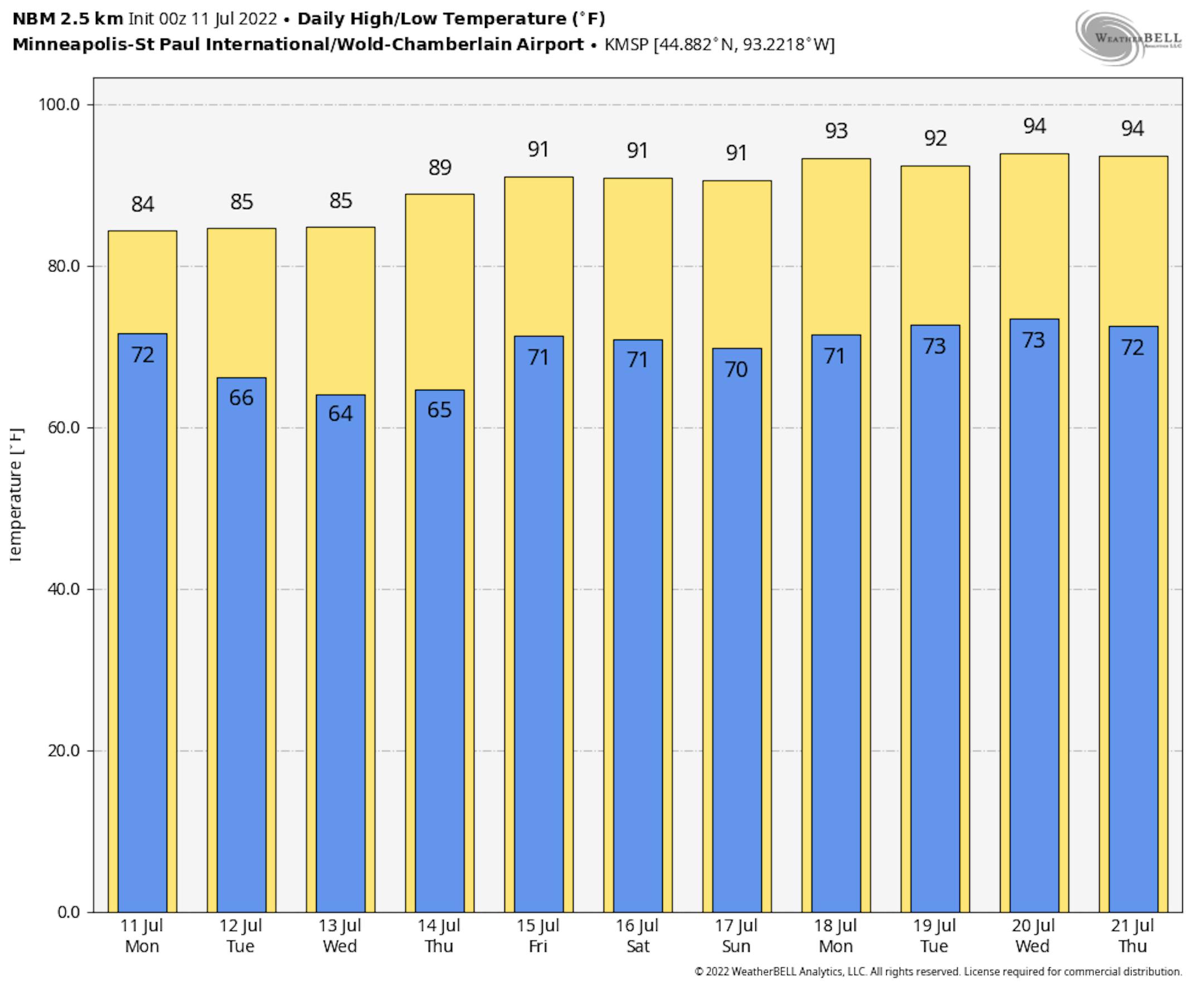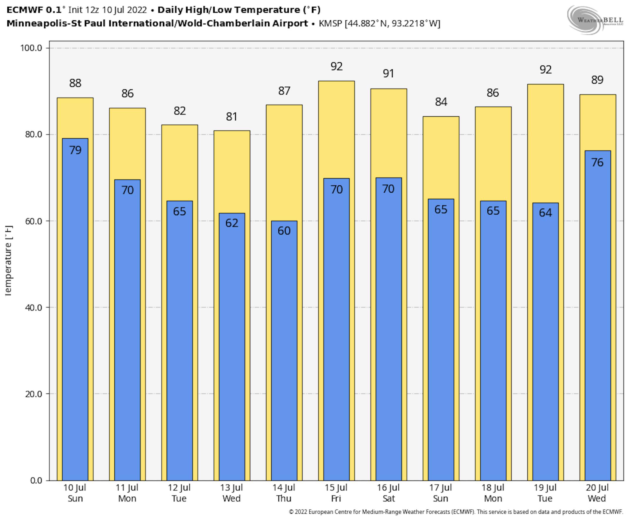 The extended temperature outlook for Minneapolis shows near average temperatures in the Twin Cities metro through midweek. Temps later in the week will warm into the 90s, which will be nearly +5F to +10F above average.