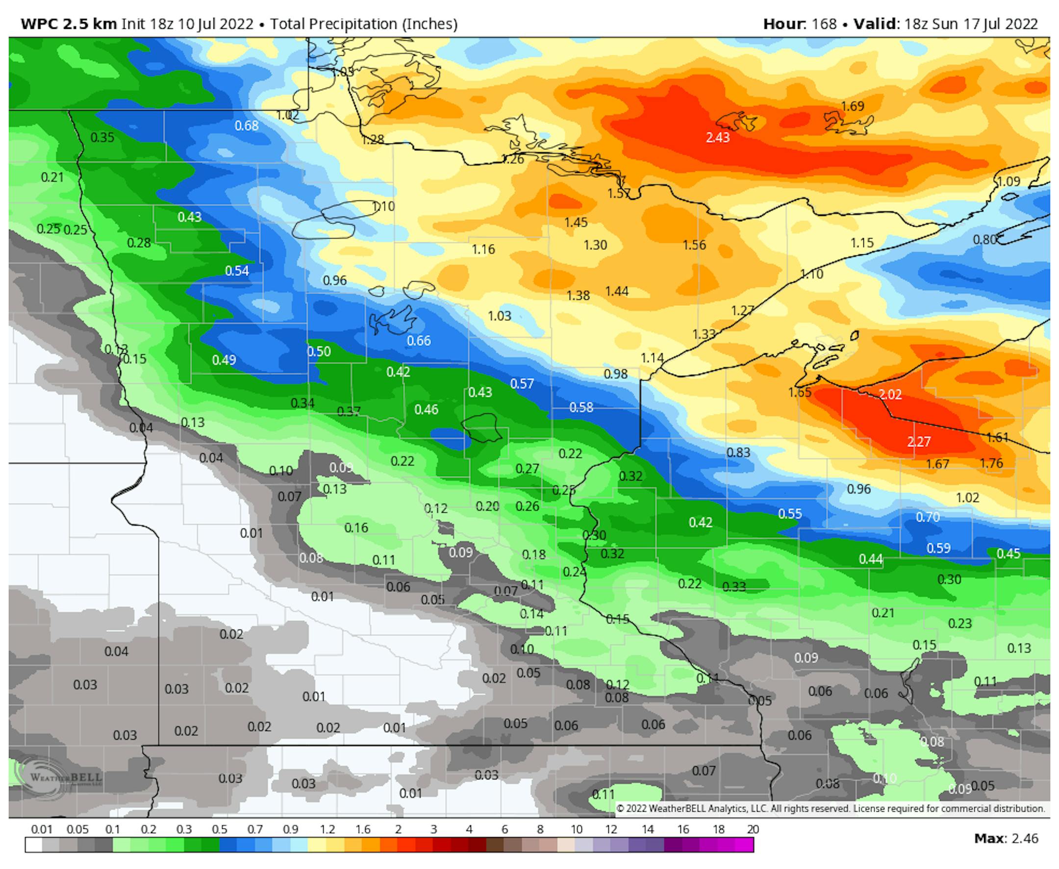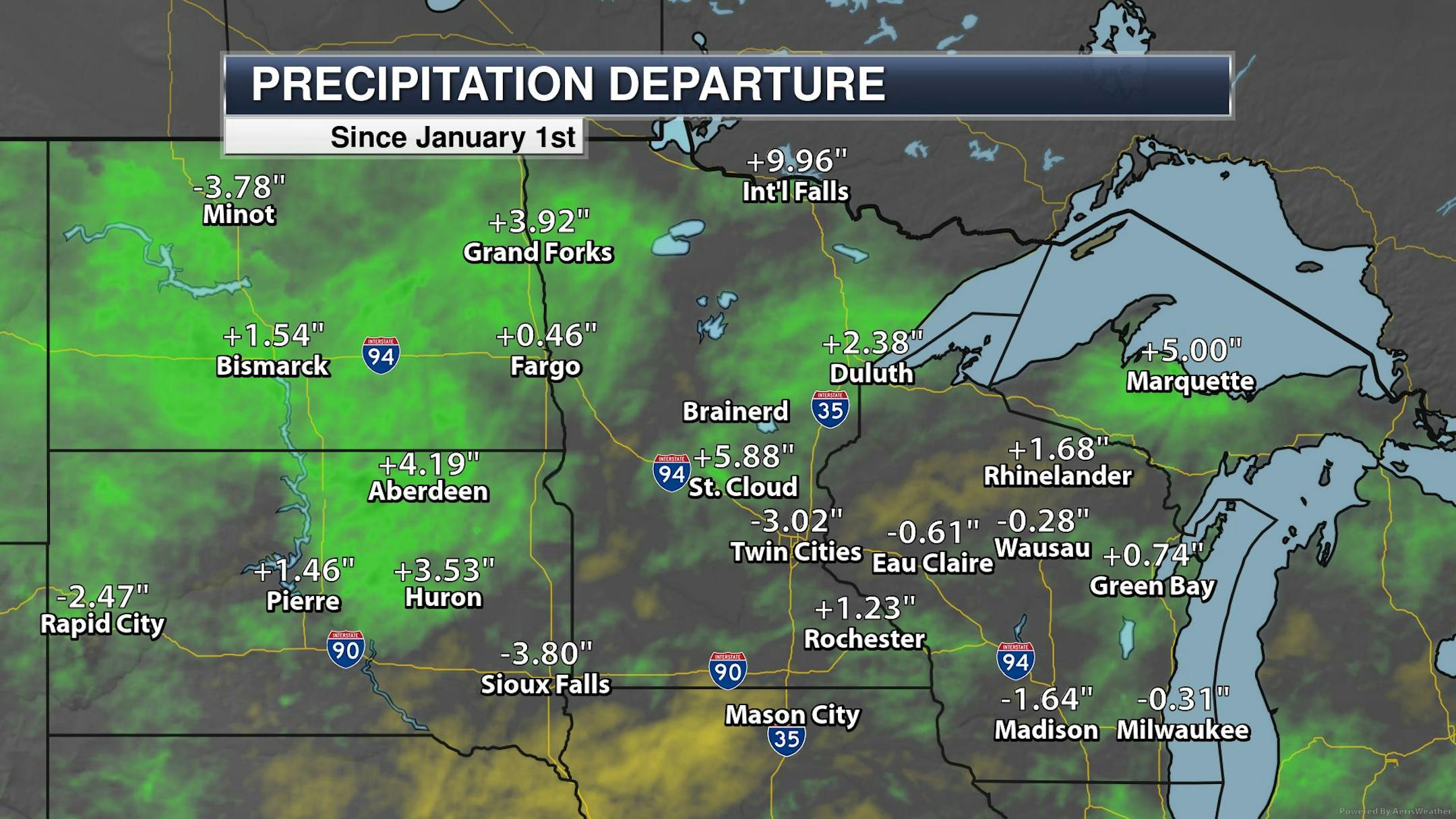 Here's the precipitation departure from average so far this year. Note the Twin Cities is nearly -3.00" below average so far this year, but just an hour north, St. Cloud is nearly +6.00" above average, which is good enough for the 13th wettest start to any year on record there.