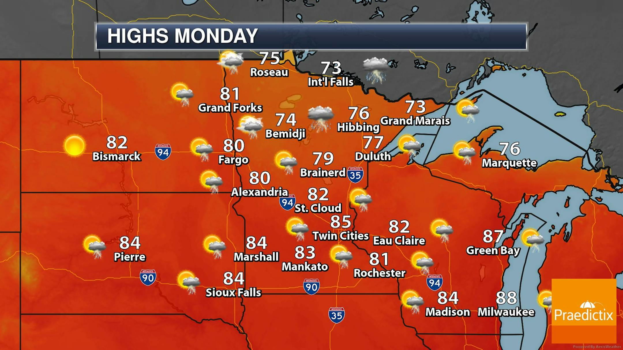 The weather outlook for Minneapolis on Monday shows temps warming into the mid 80s with spotty showers and storms possible. Winds will be a bit breezy with gusts approaching 30mph late in the day.