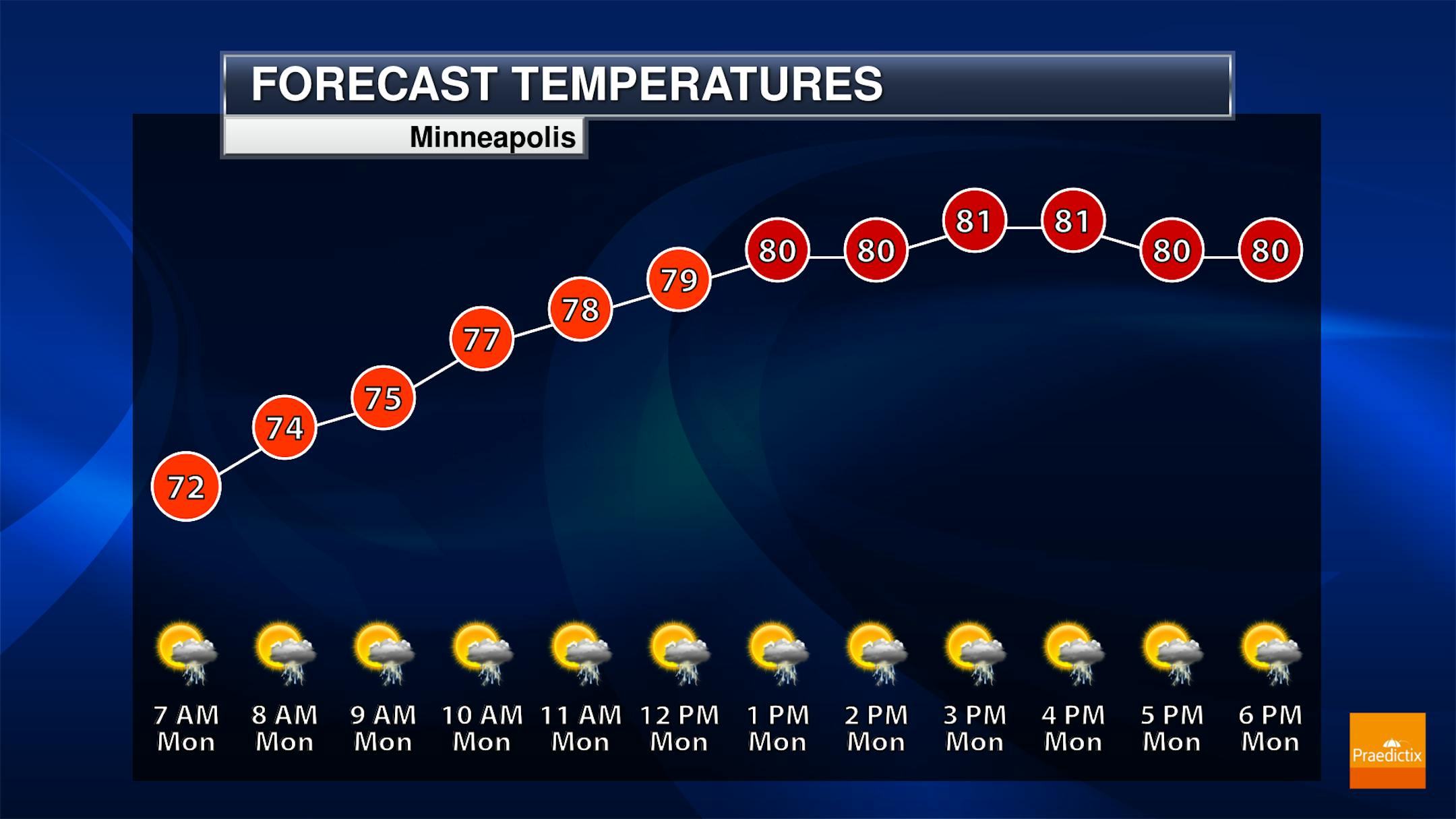 The hourly temps for Minneapolis on Monday shows temperatures starting in the lower 70s and warming to low/mid 80s by the afternoon. Isolated showers and storms will be possible through the day as well, but we're not expecting anything severe. WNW winds will increase through the day and become gusty later with wind speeds near 30mph.