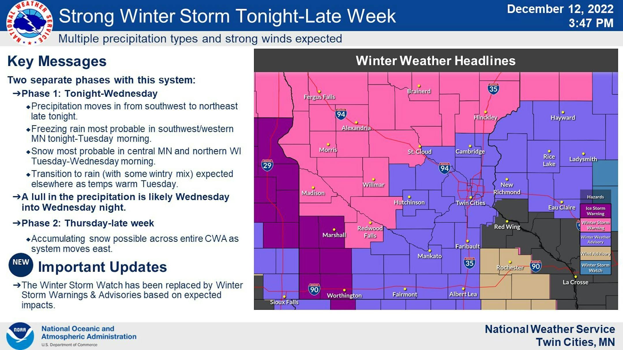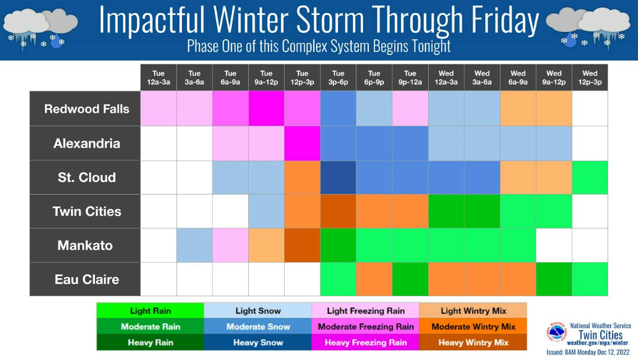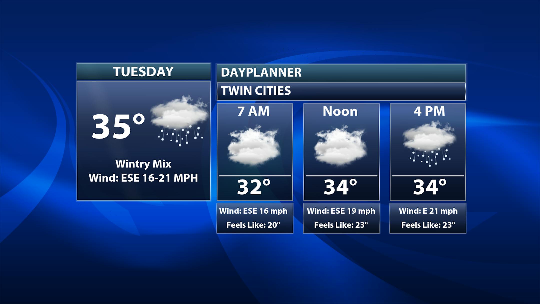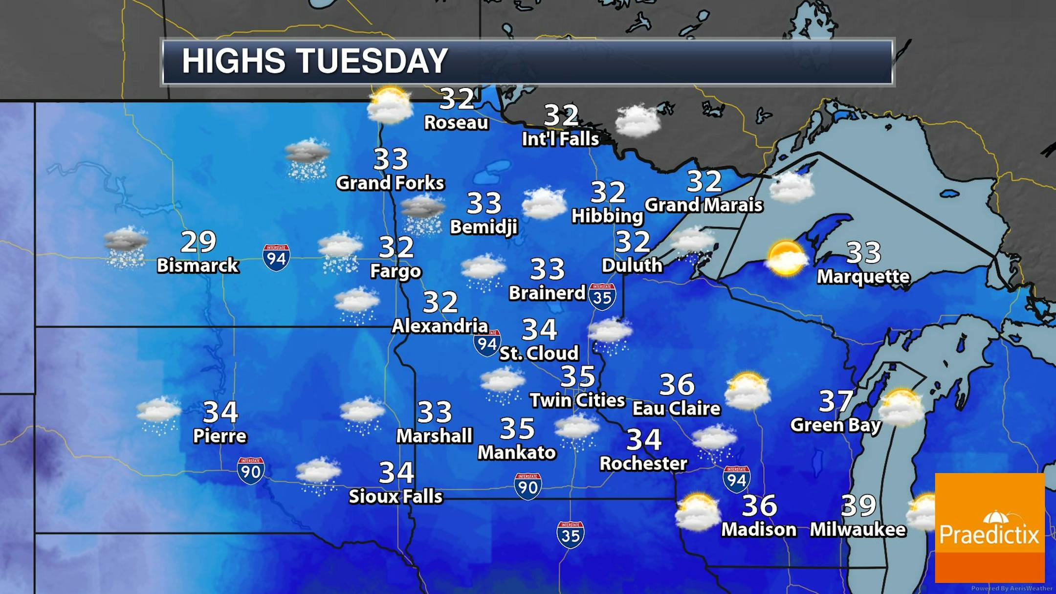 Here's a broken down chart for timing and precipitation types for select cities across the region. For the Twin Cities, there could be wintry mixed precipitation (heavy at times) through much of the midday/afternoon times frame. Precipitation could eventually switch to all rain at some point late Tuesday into Wednesday before a lull in the precipitation during the day Wednesday. Meanwhile, folks in western Minnesota could see a brief period of freezing rain before snow arrives. Areas of heavier snowfall maybe possible across central MN later Tuesday into Tuesday Night, before tapering into AM Wednesday.