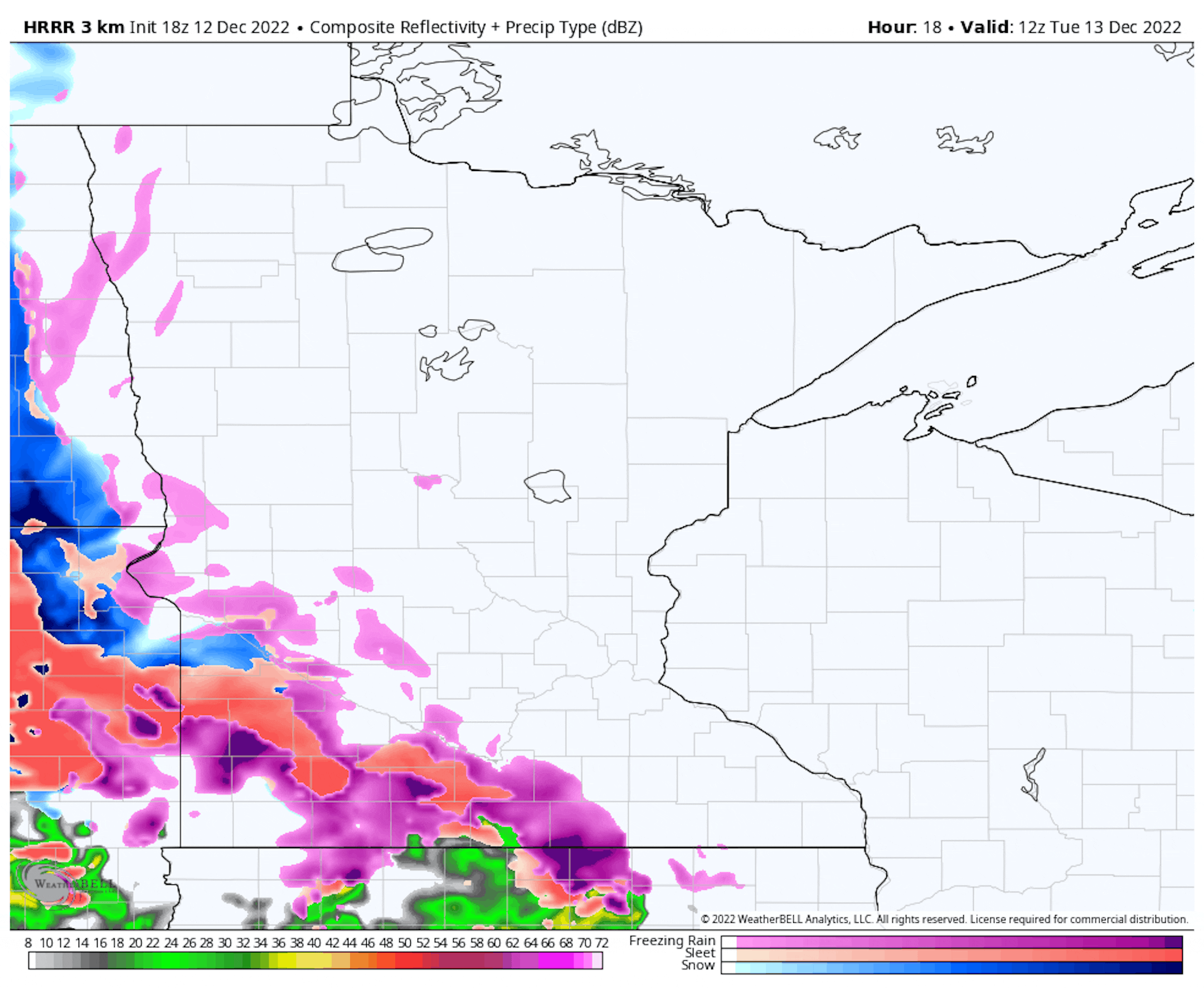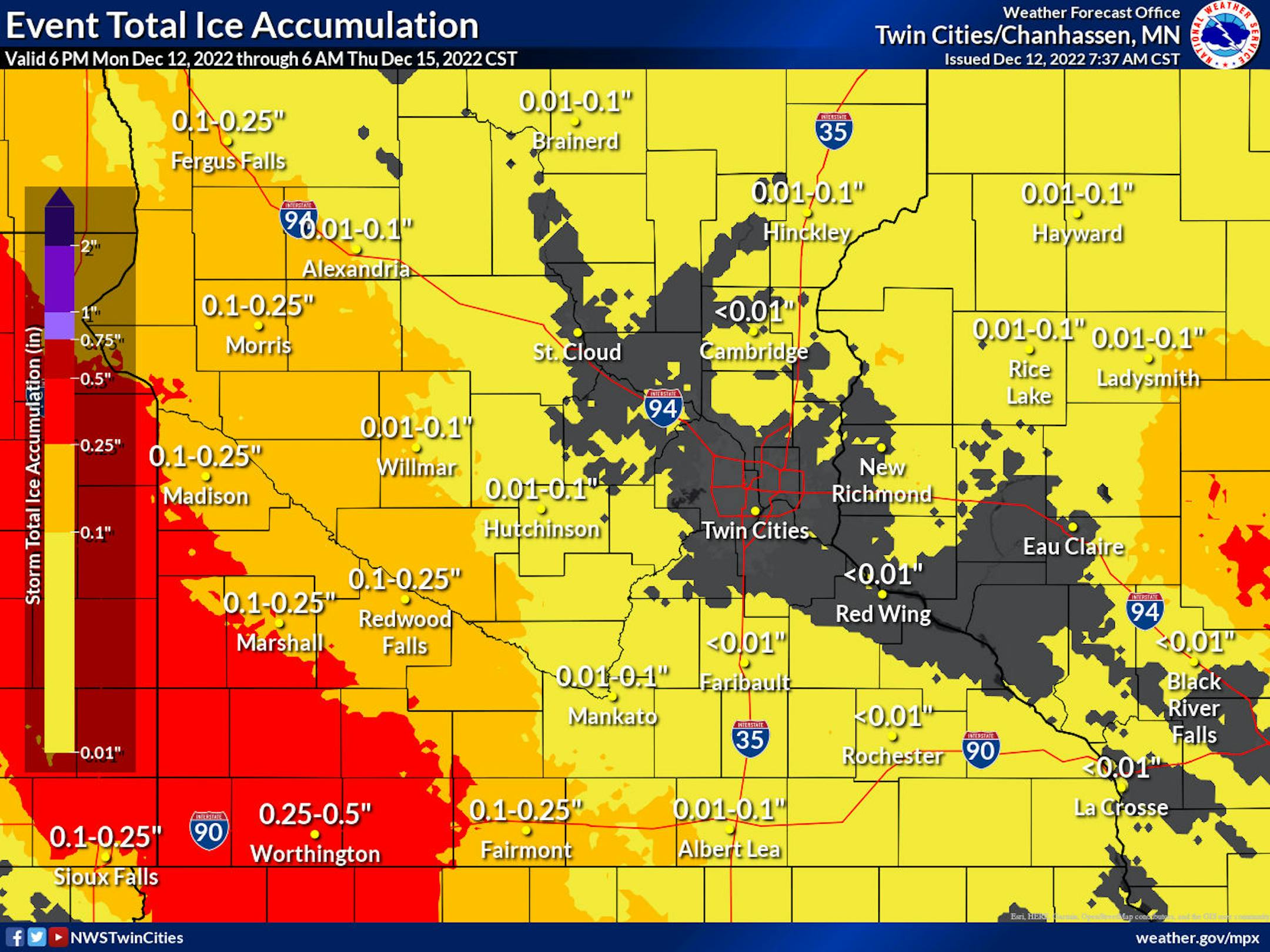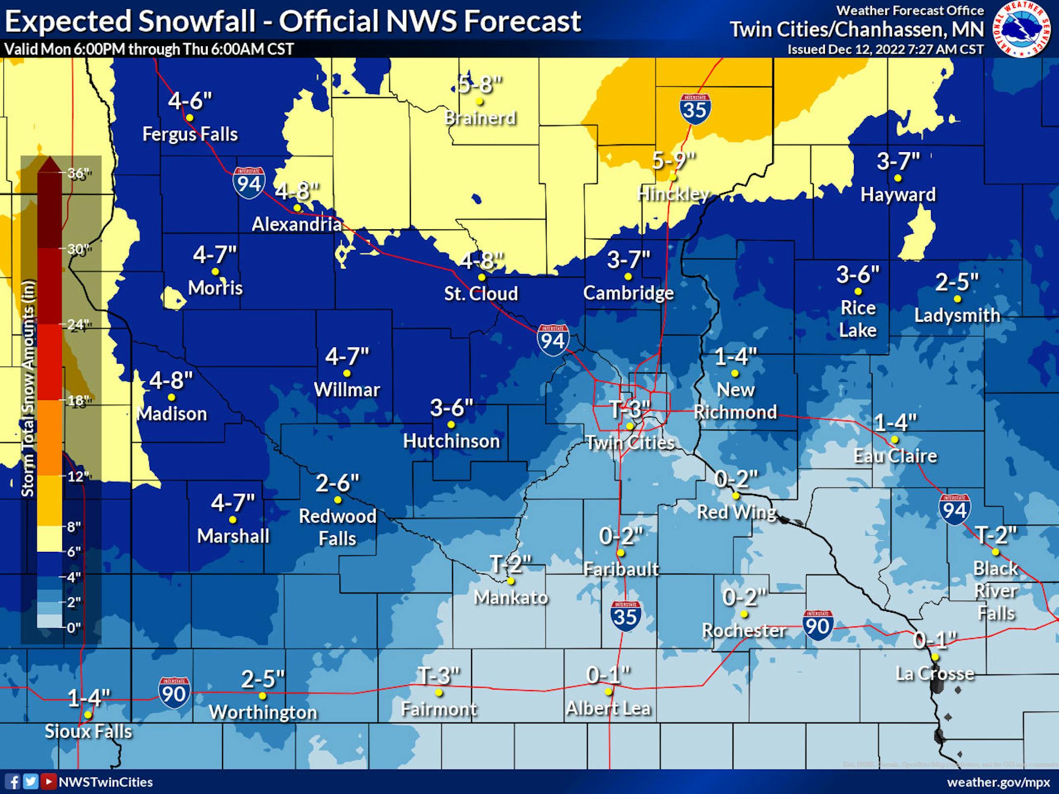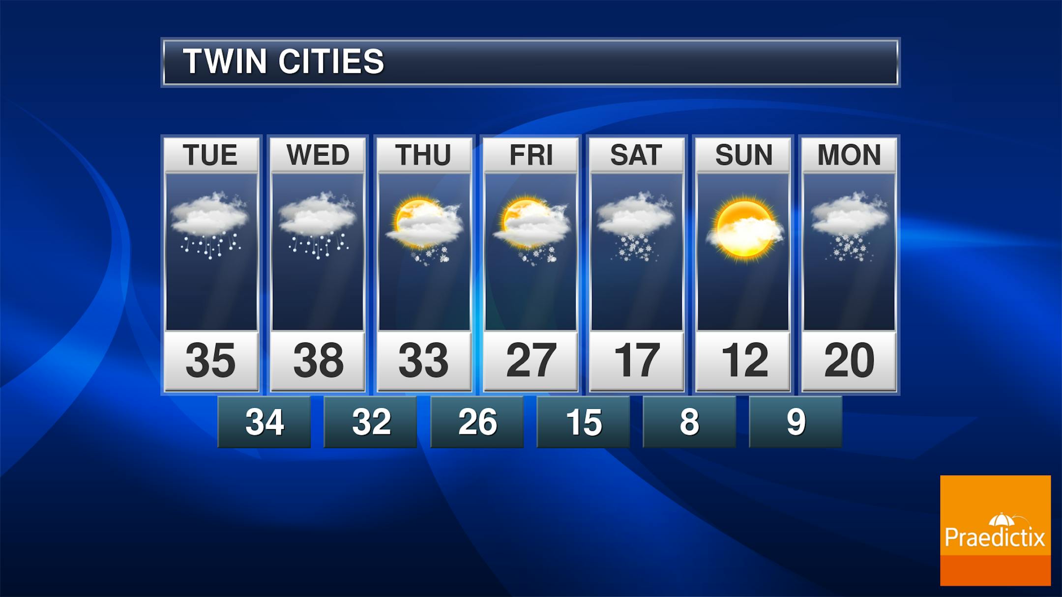 Here's a broken down chart for timing and precipitation types for select cities across the region. For the Twin Cities, there could be wintry mixed precipitation (heavy at times) through much of the midday/afternoon times frame. Precipitation could eventually switch to all rain at some point late Tuesday into Wednesday before a lull in the precipitation during the day Wednesday. Meanwhile, folks in western Minnesota could see a brief period of freezing rain before snow arrives. Areas of heavier snowfall maybe possible across central MN later Tuesday into Tuesday Night, before tapering into AM Wednesday.