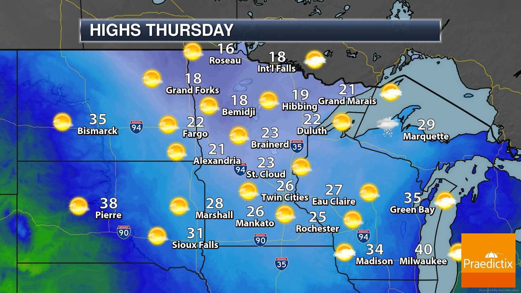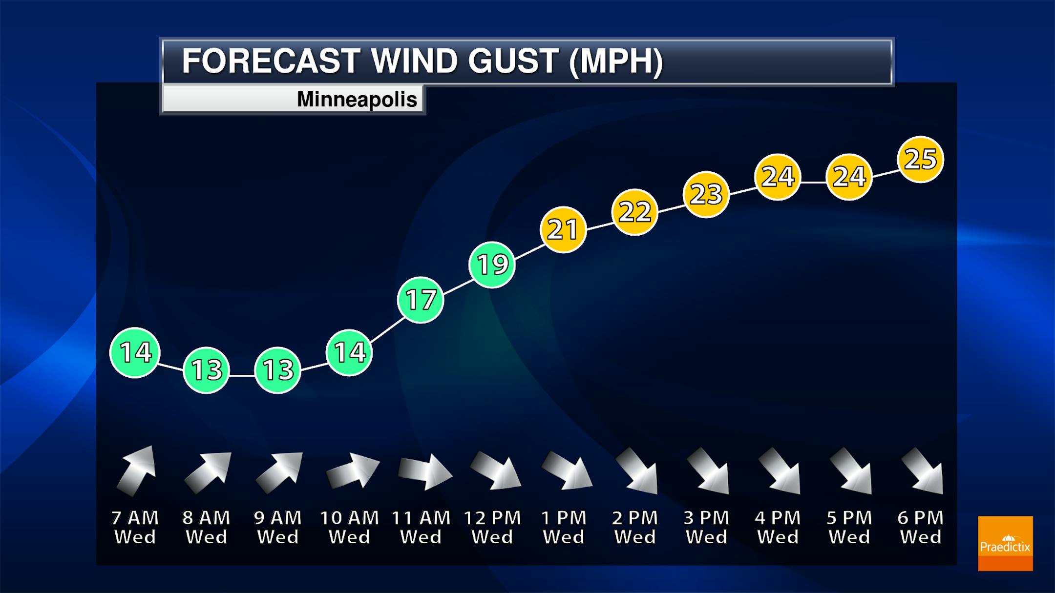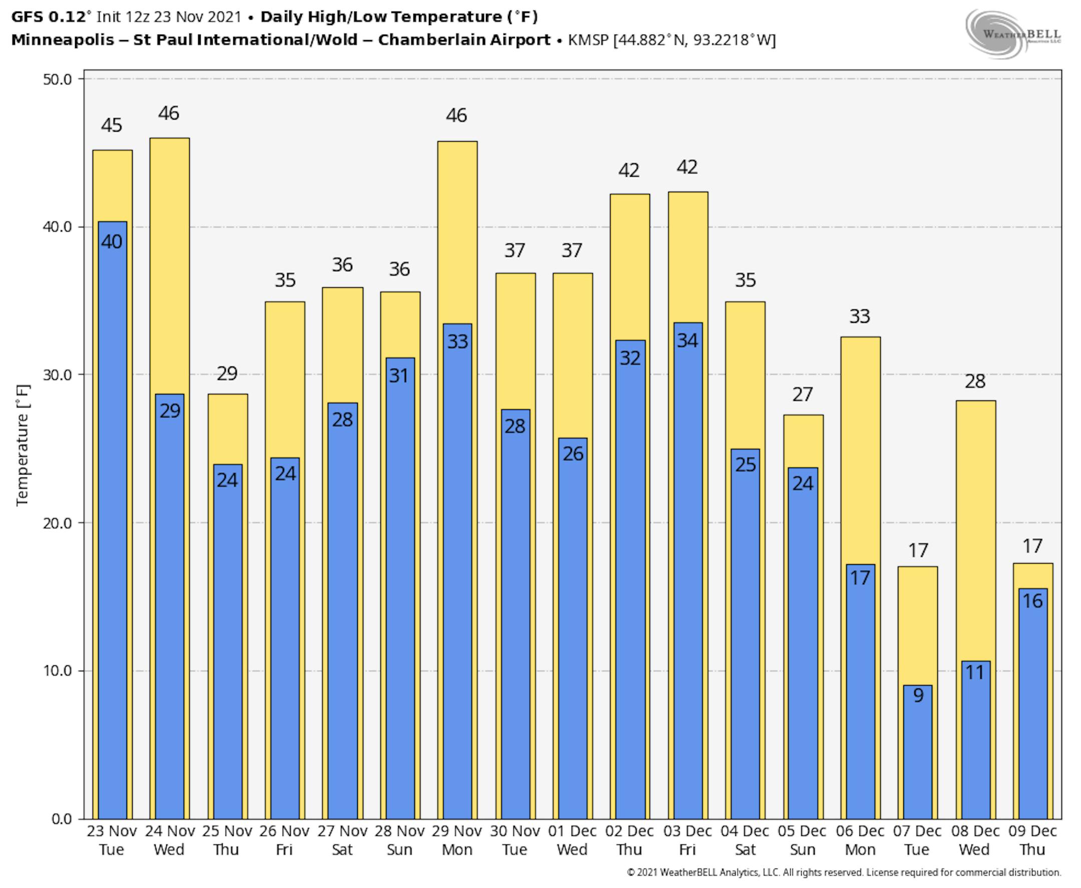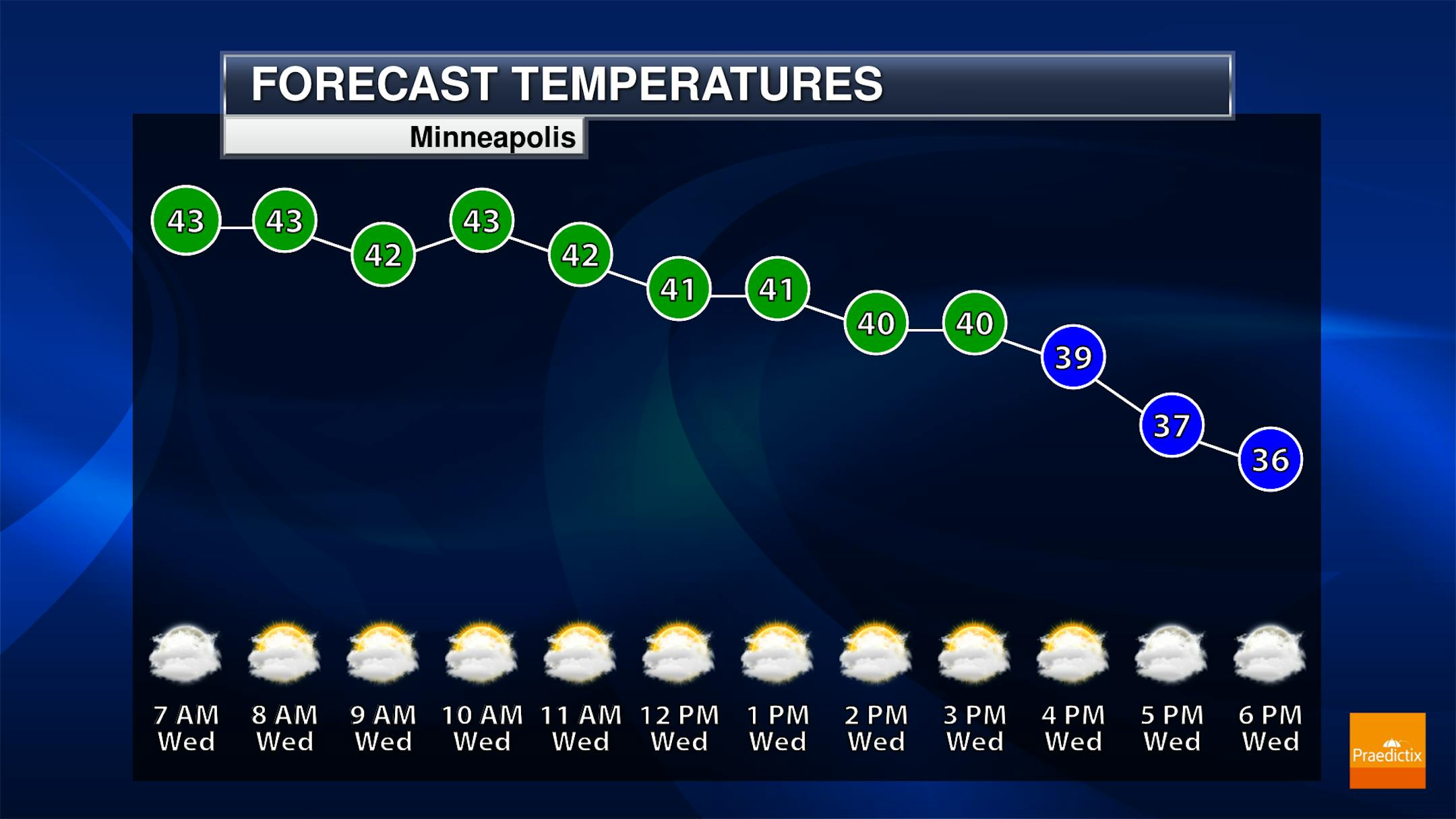 Here's the weather outlook for Minneapolis on Thanksgiving Day Thursday. Note that temps will be quite chilly through the day with temps only warming into the 20s by midday. With gusty northwesterly winds, feels like temps will only be in the teens, which will be quite chilly.