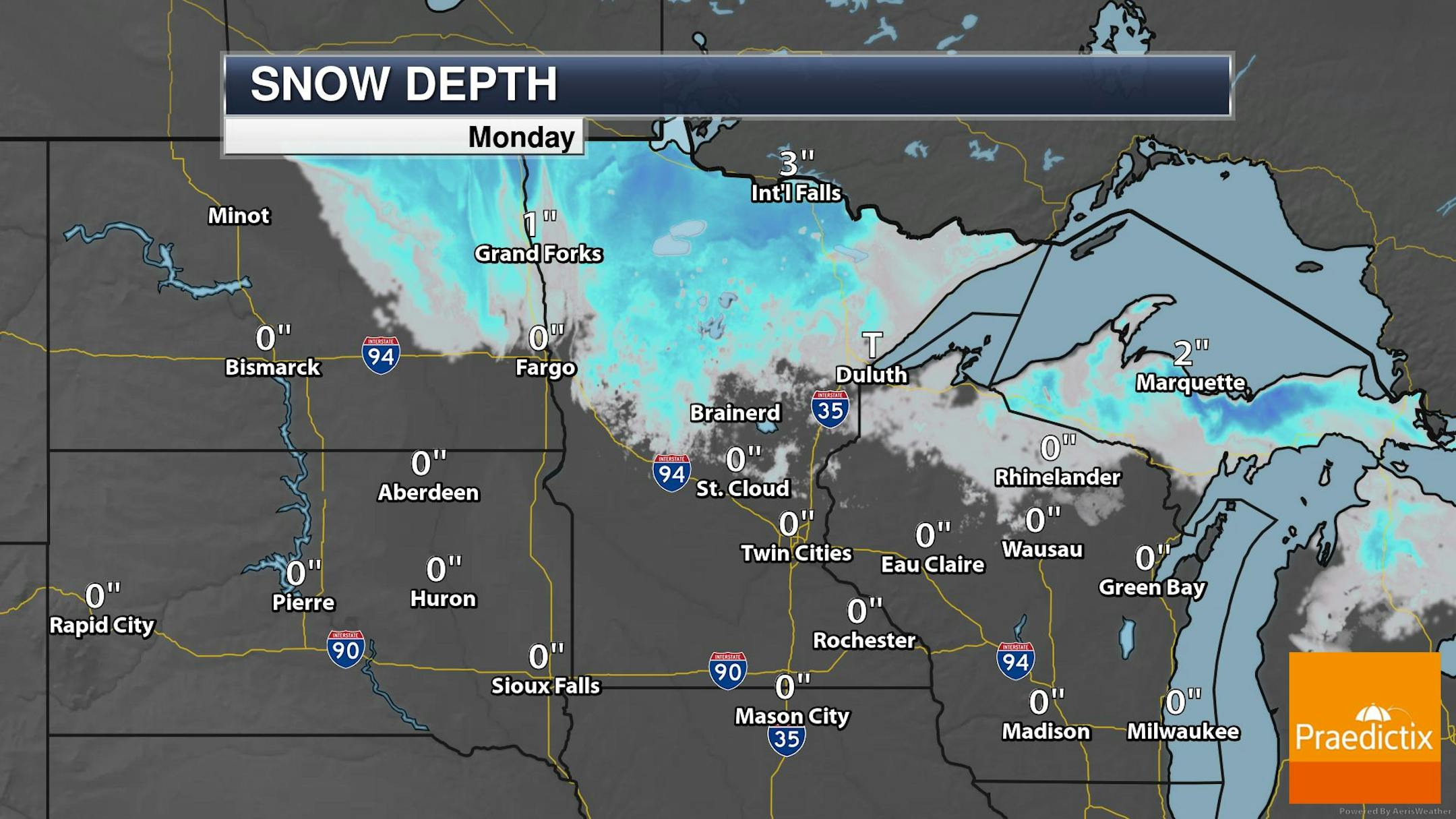 Here's a look at snow depth across the region from earlier in the week, which shows minimal snow cover across the northern third of the state. The greatest snow depth was reported in International Falls, where 3" was on the ground. Meanwhile, folks in the southern two-thirds of the state are snow free.