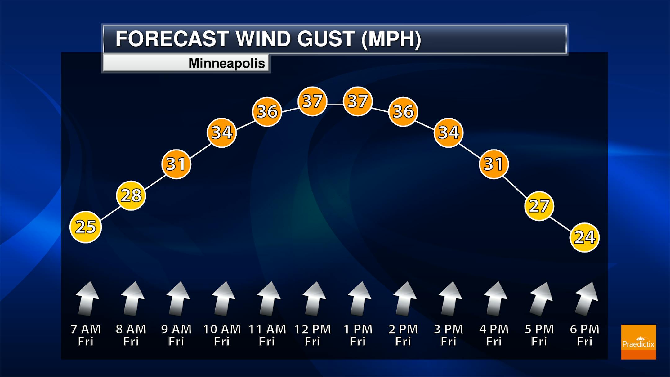 Winds will be strong out of the south throughout the day across the state. Wind gusts could peak between about 35-40 mph in the Twin Cities during the midday and early afternoon hours before decreasing toward sunset.