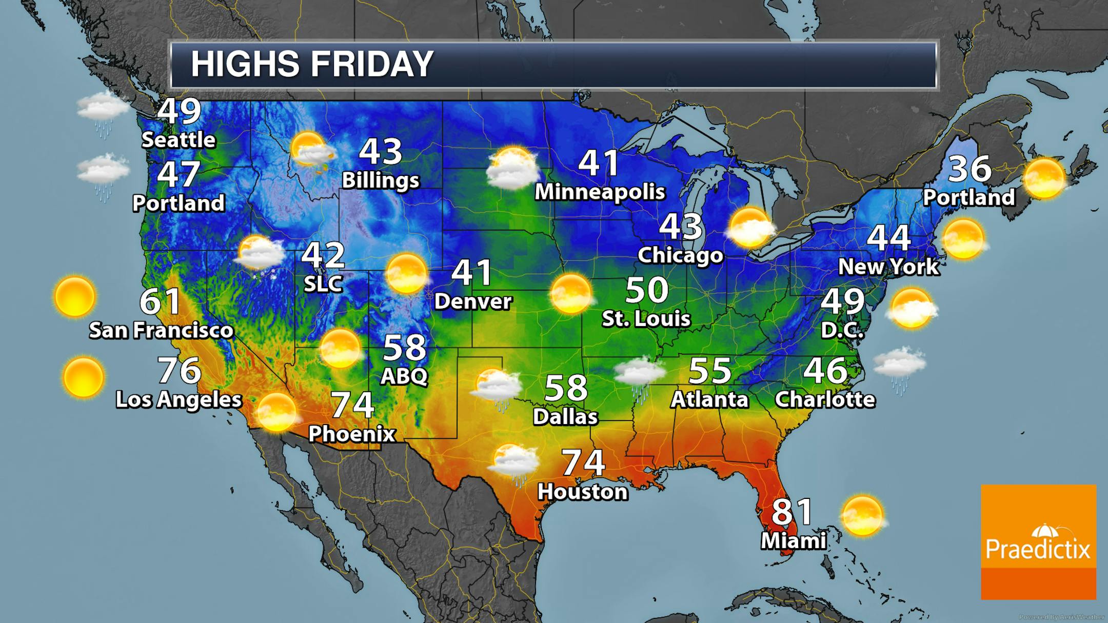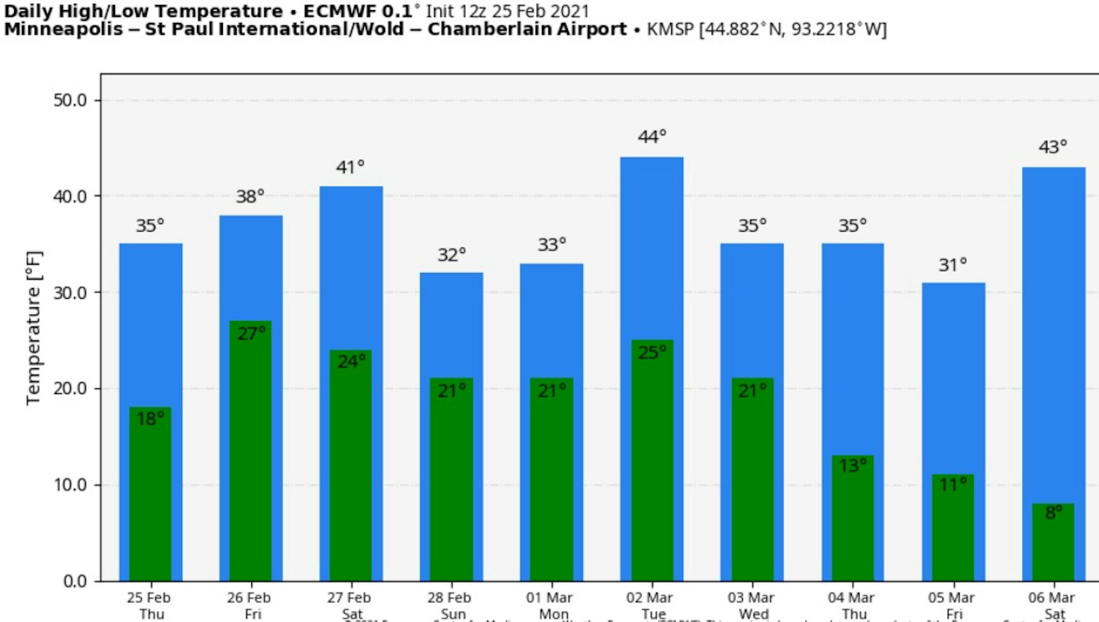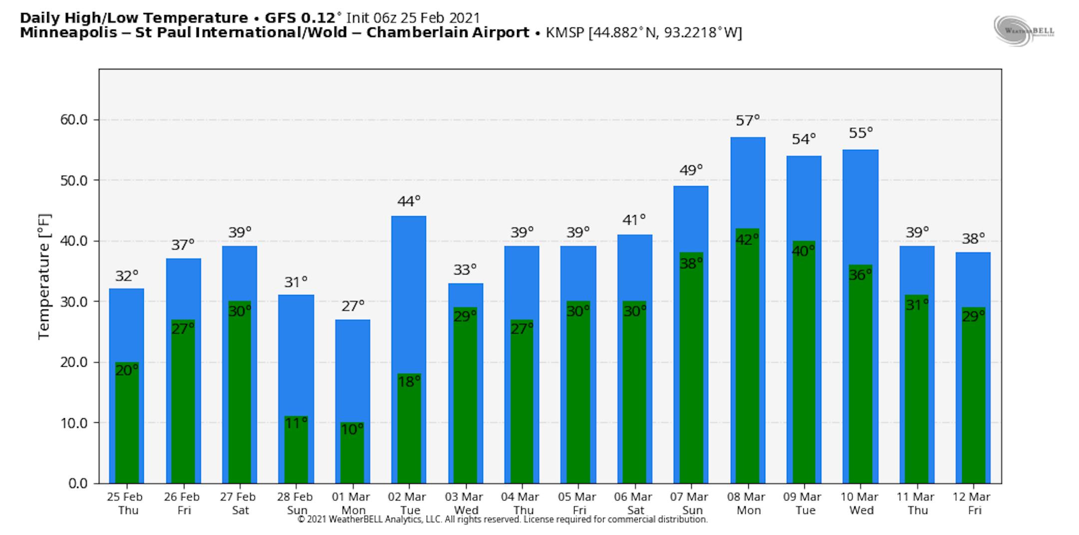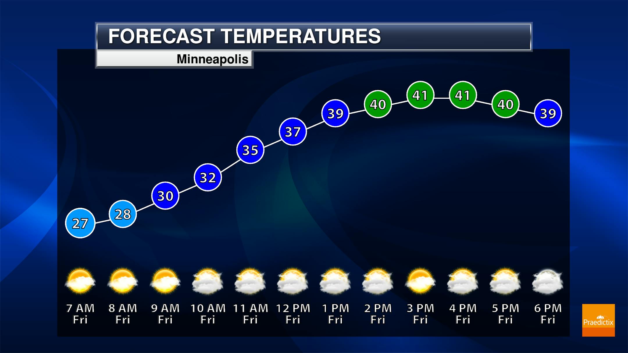 Another very nice day is expected on Friday here in the Twin Cities, as morning temperatures start off in the mid-20s, climbing to around 40F for a high. Skies are likely to be fairly cloudy during the day, and I can't rule out some sprinkles during the afternoon hours. We will also see strong winds out of the south up to 20 mph sustained with 35 mph wind gusts.