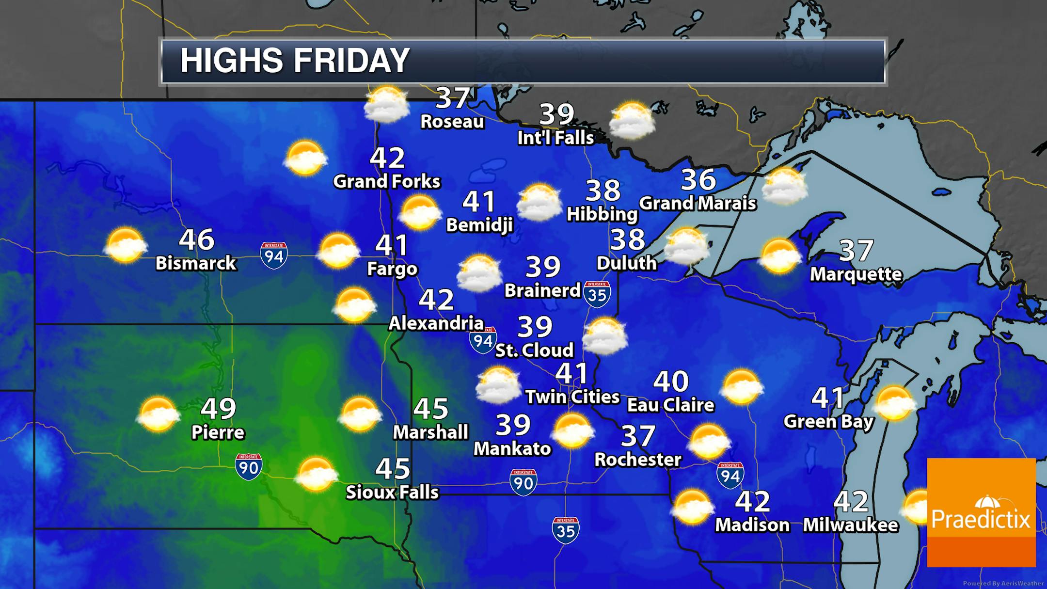 A mainly cloudy day is expected across much of the state Friday. The best chance of sun peaking through the clouds will be in the morning in the eastern portions of the state, and later in the afternoon in western Minnesota. A few sprinkles could be possible at times. Highs will be in the 30s to low 40s across the state, about 5-15F degrees above average.
