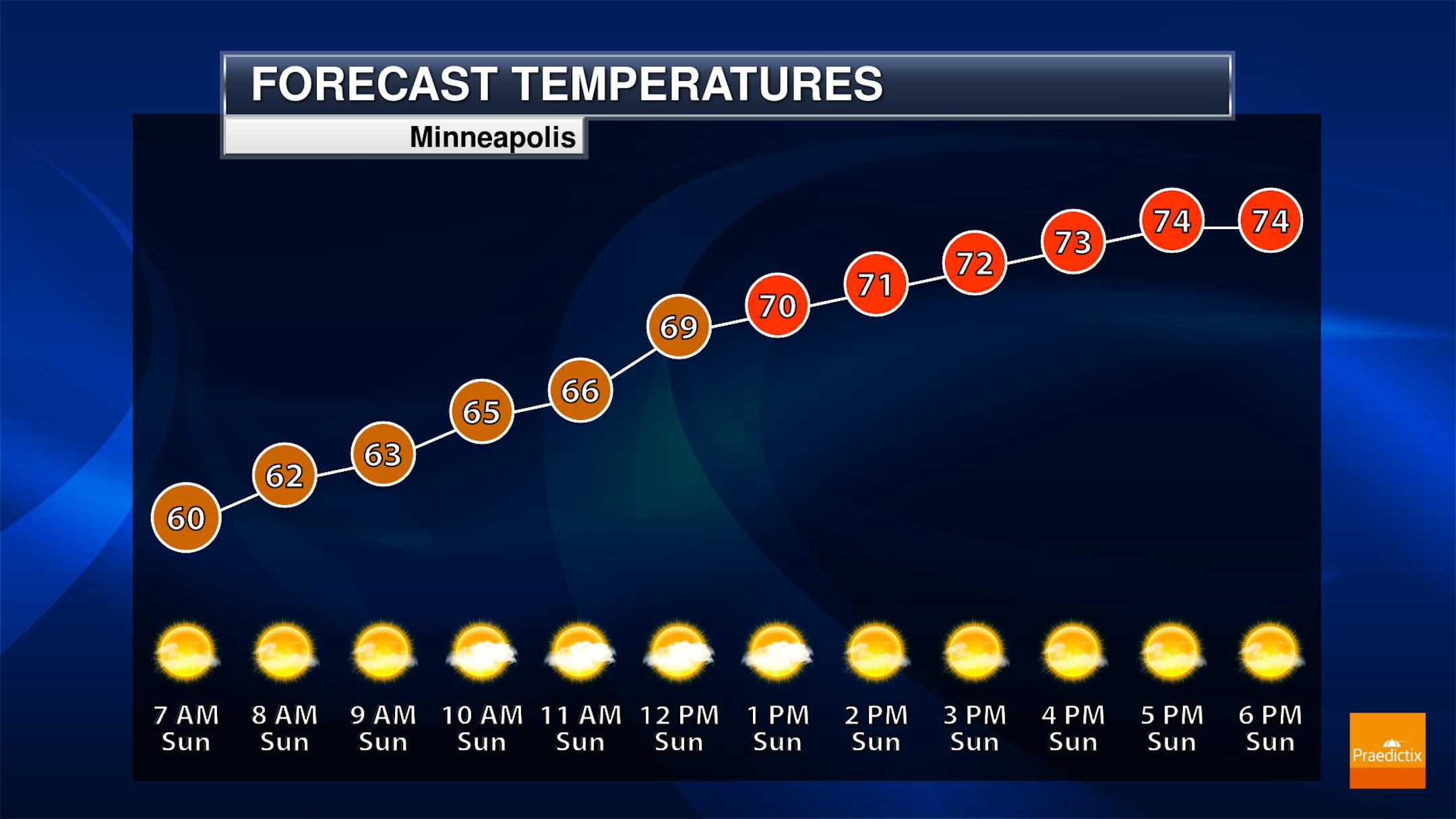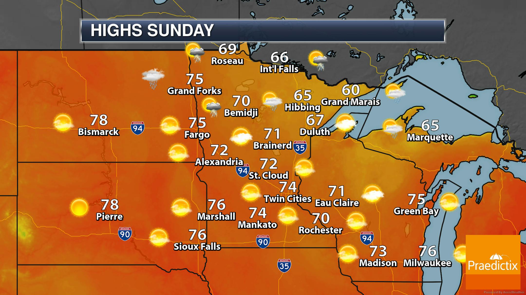 While it will be sunny here across central and southern Minnesota, we will watch for occasional passing showers and storms up across northern areas of the state - but by no means will it be an all-day washout. Cooler than average temperatures are expected across the state on Sunday, with highs in the 60s in northern Minnesota and in the 70s elsewhere.