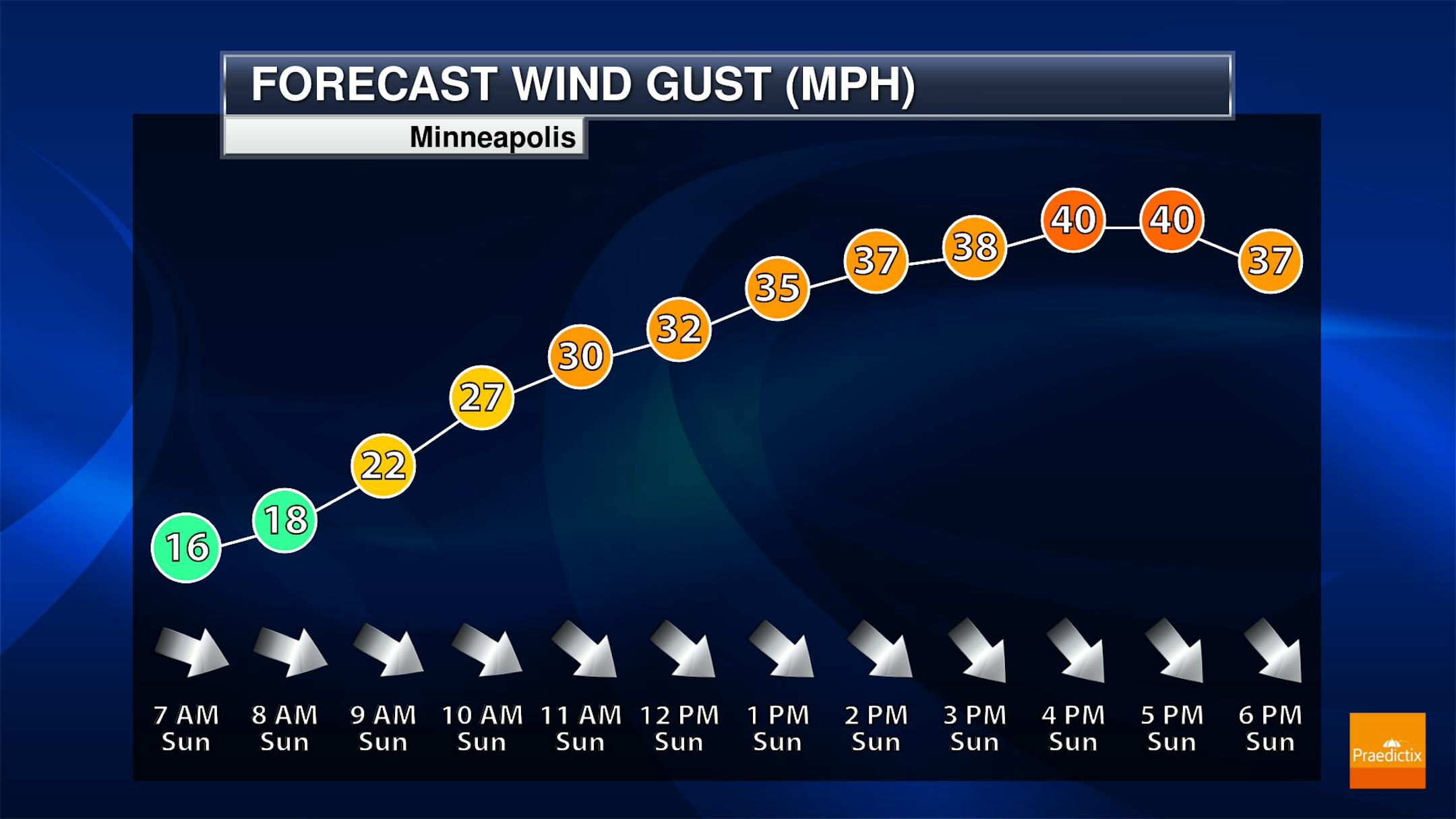 Here's the hourly wind gusts & direction meteogram for Minneapolis on Sunday. Winds in the morning will already be breezy, but they will continue to increase through the day with near 40mph gusts possible in the afternoon. Uffda!
