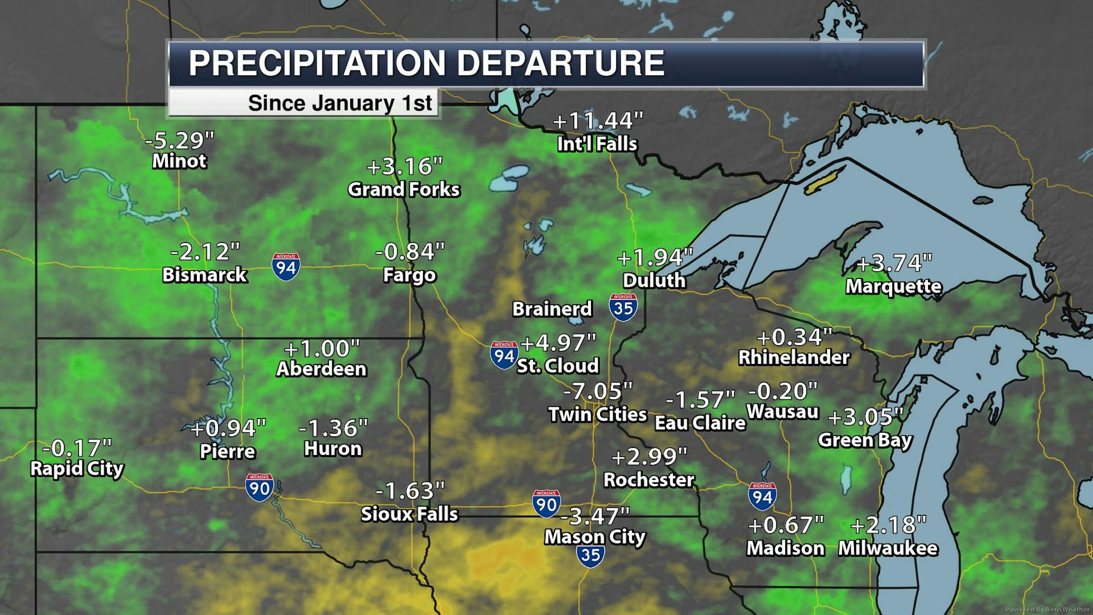 If we take a look at the year as a whole, rainfall has been hit or miss around the region as well. Minneapolis is nearly -7" below average (27th driest start to any year on record), but 75 miles north of the MSP in St. Cloud, there is a +5" surplus, which is the 20th wettest start to any year on record. Meanwhile, International Falls is nearly +11.50" above average and is currently sitting at the wettest start to any year on record!