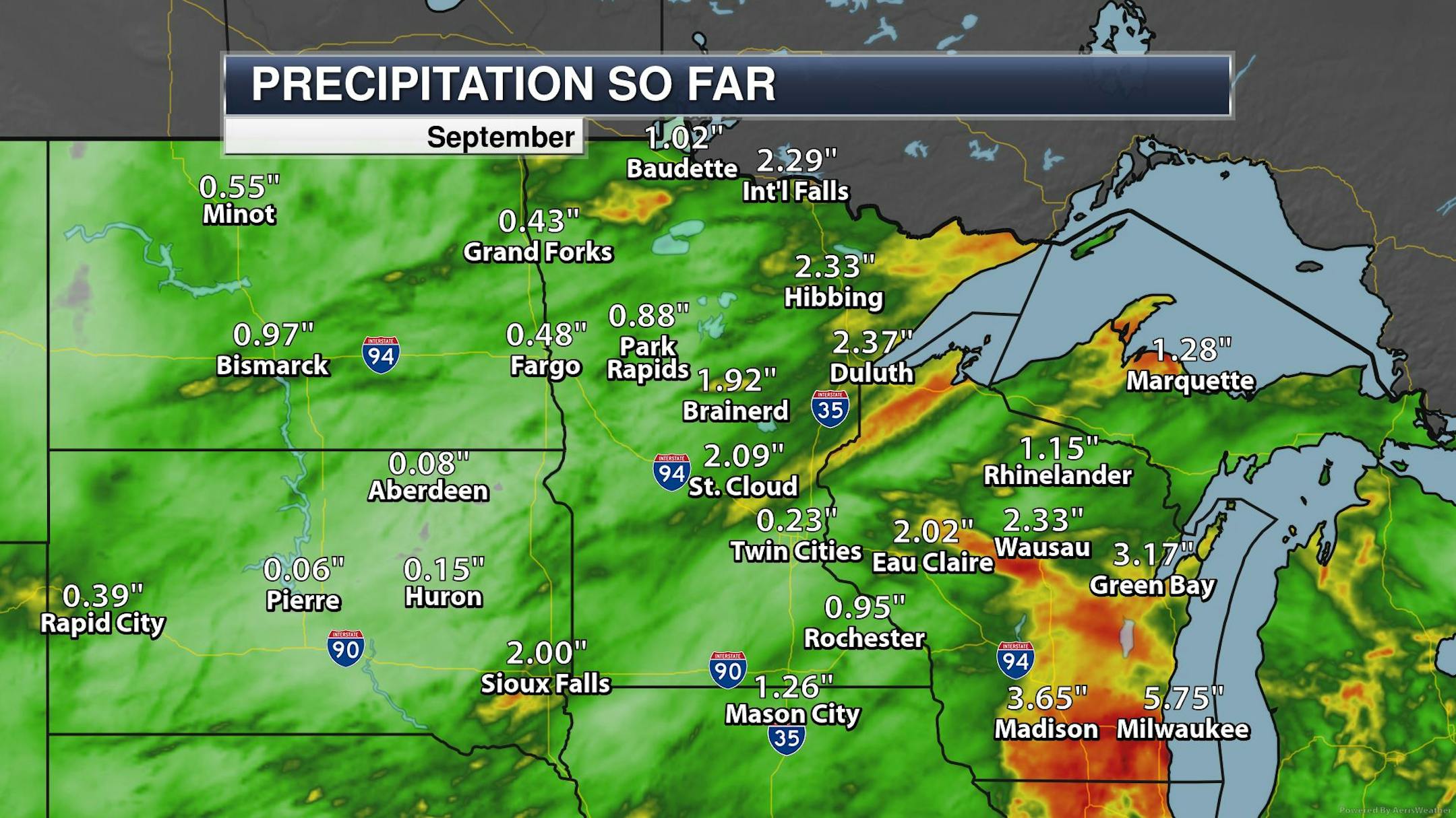 Here's how much rain has fallen across the region through the first 3 weeks of the month. Despite a few pockets of heavy rain here and there, September has been a fair dry month for many. The most widespread heavy rain has fallen across parts of Wisconsin, where Milwaukee has seen 5.75" of rain and is at their 17th wettest September on record.