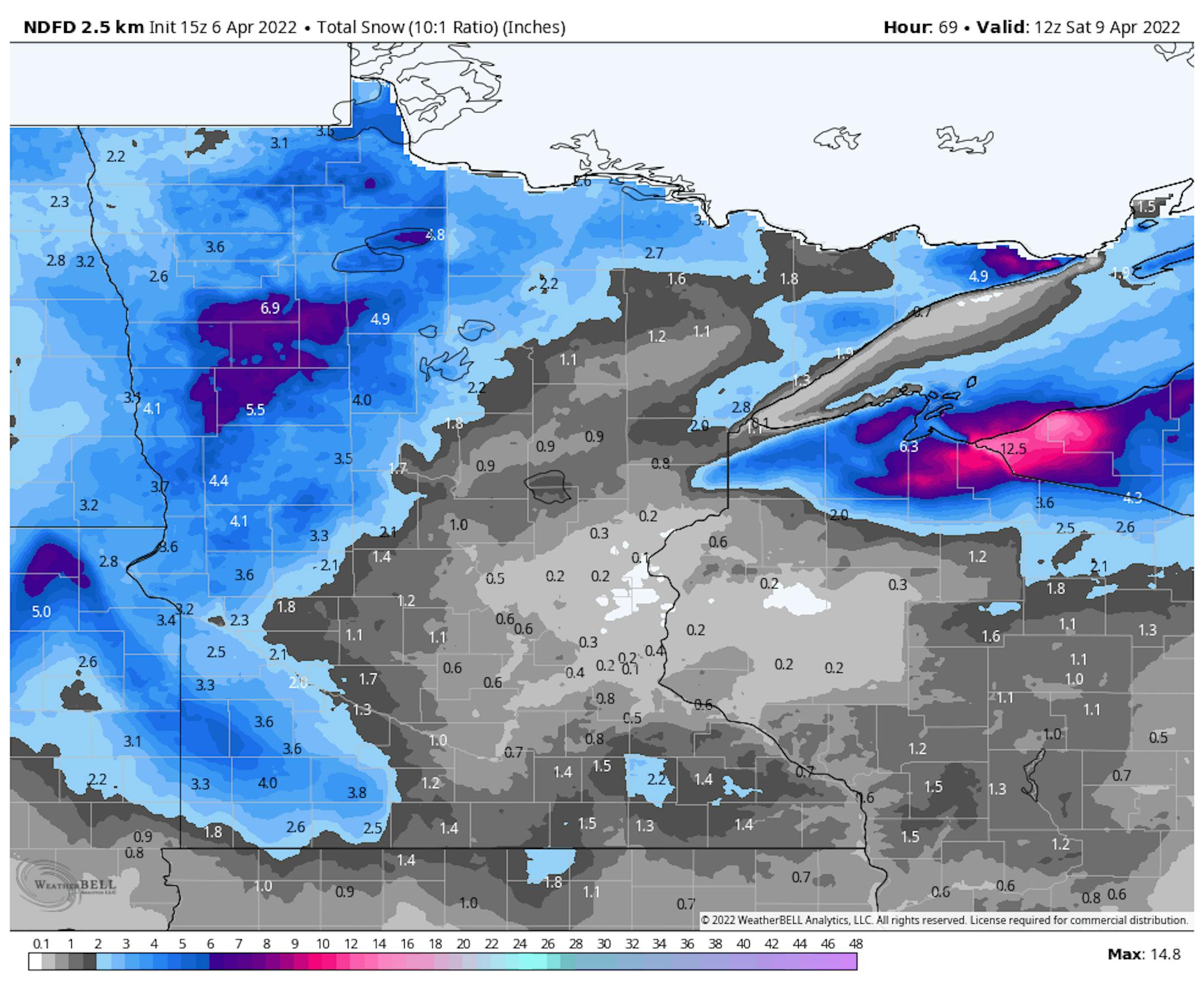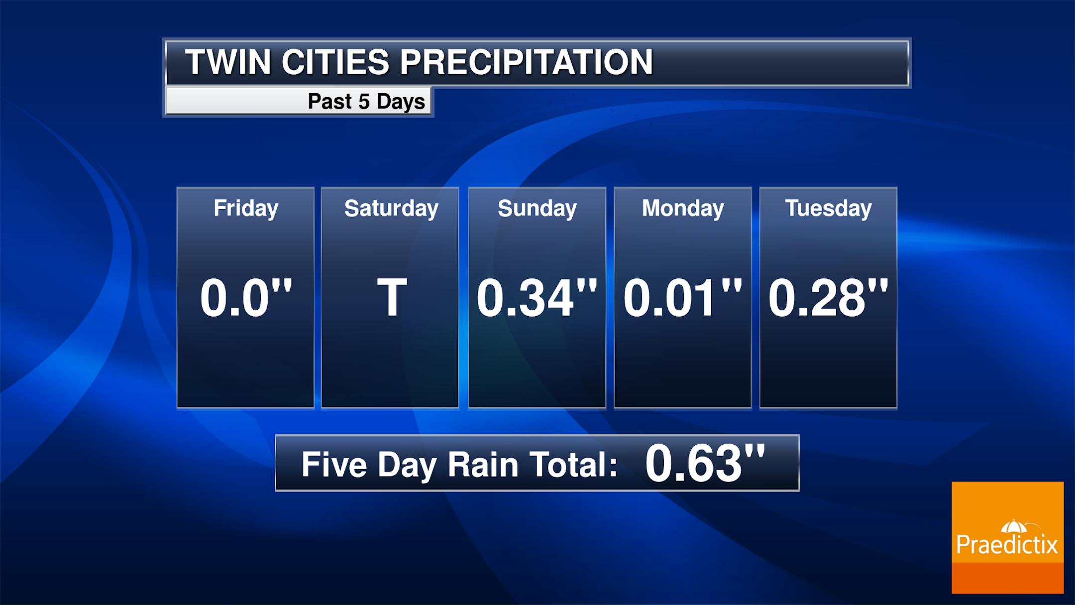 We've continued our wet and somewhat snowy streak over the first few days of April so far. From April 1st (Friday) through April 5th (Tuesday), we picked up a total of 0.63" of liquid precipitation and 1" of snow at MSP.
