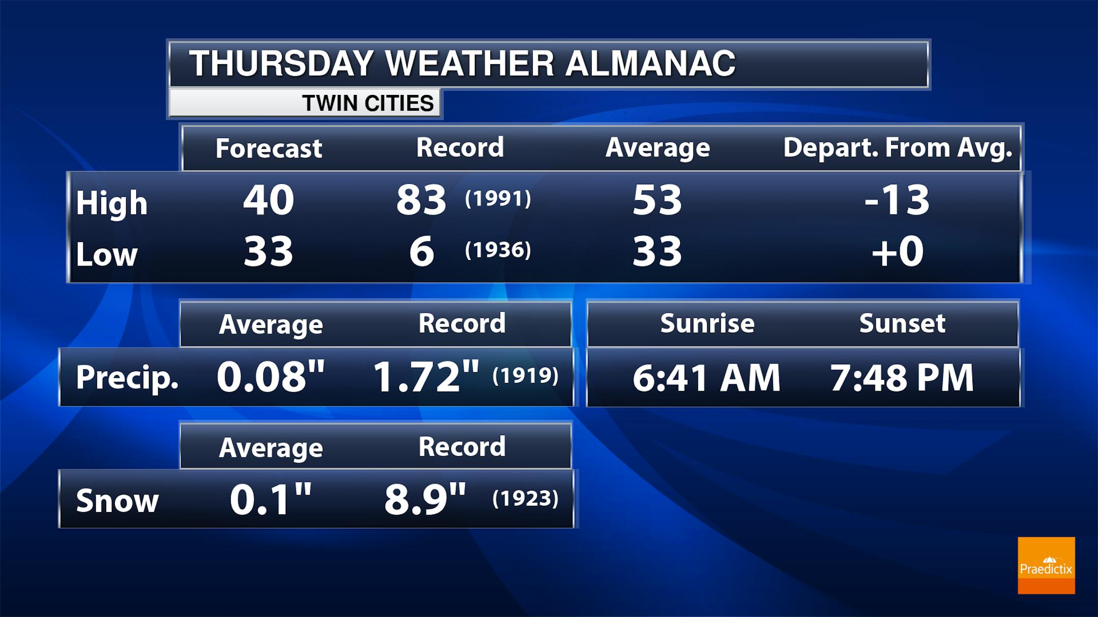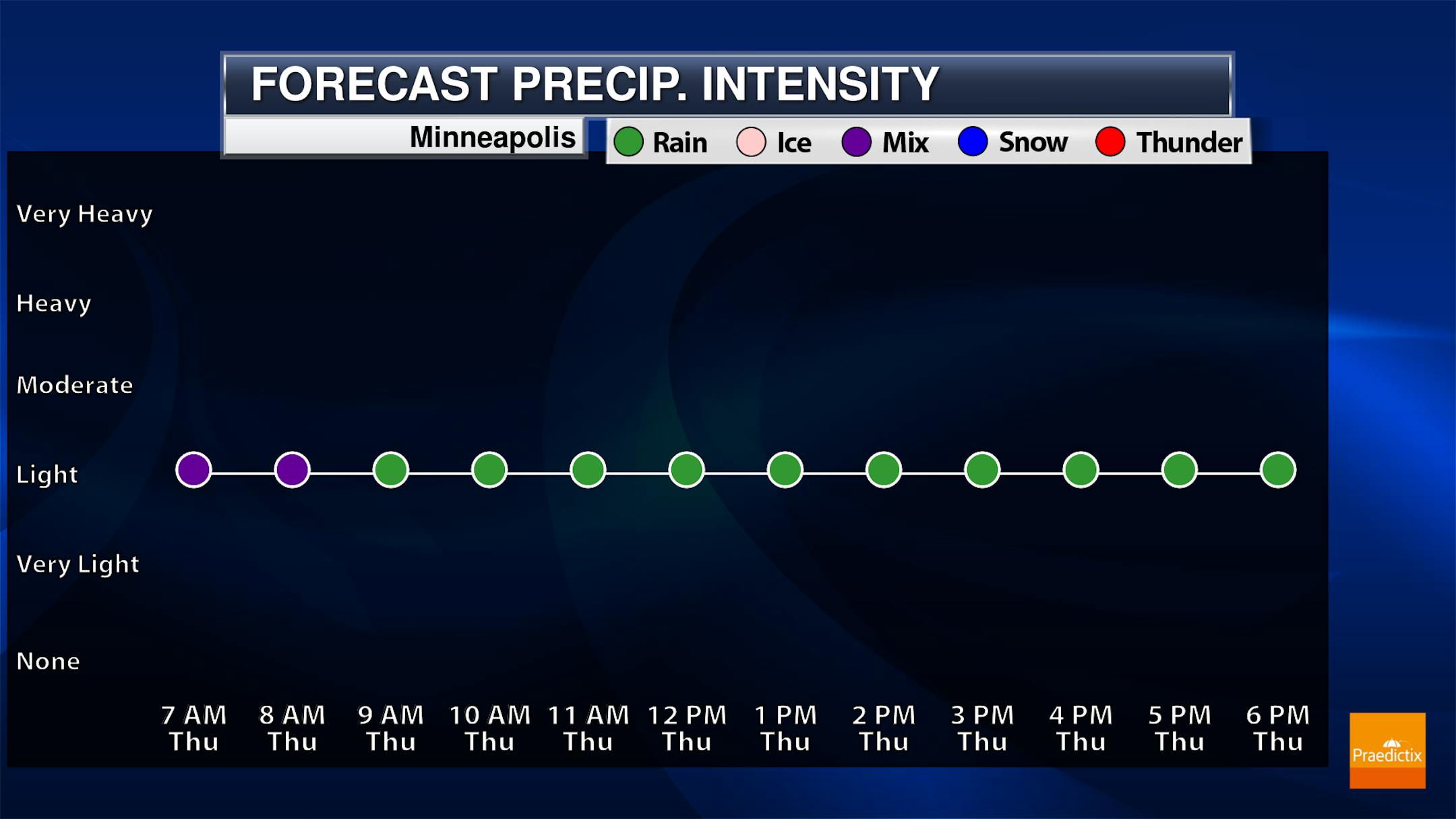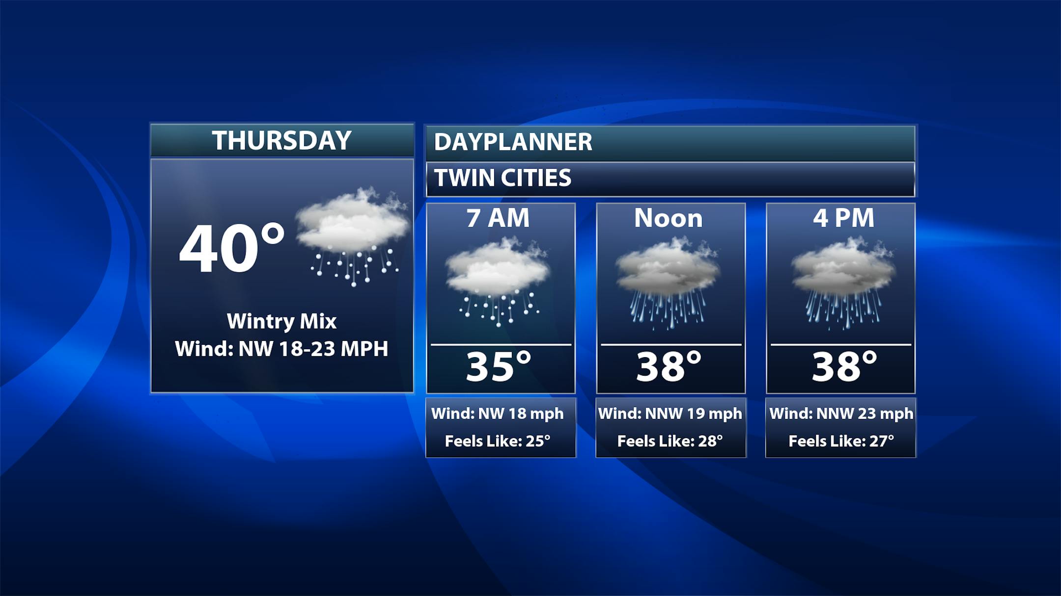 As we look at the metro, precipitation will start off the day as a mix and/or light snow before changing over to rain during the morning hours. We'll start off in the low to mid-30s and only climb to around 40F for a high. A stiff northwest breeze will make it feel like the 20s throughout much of the day.