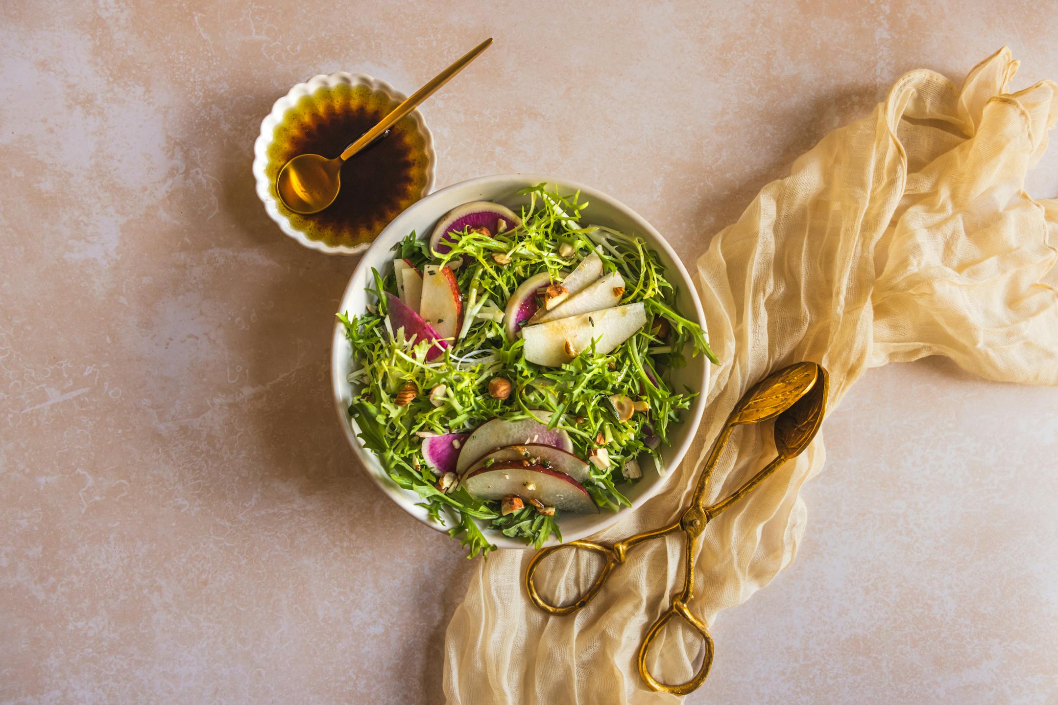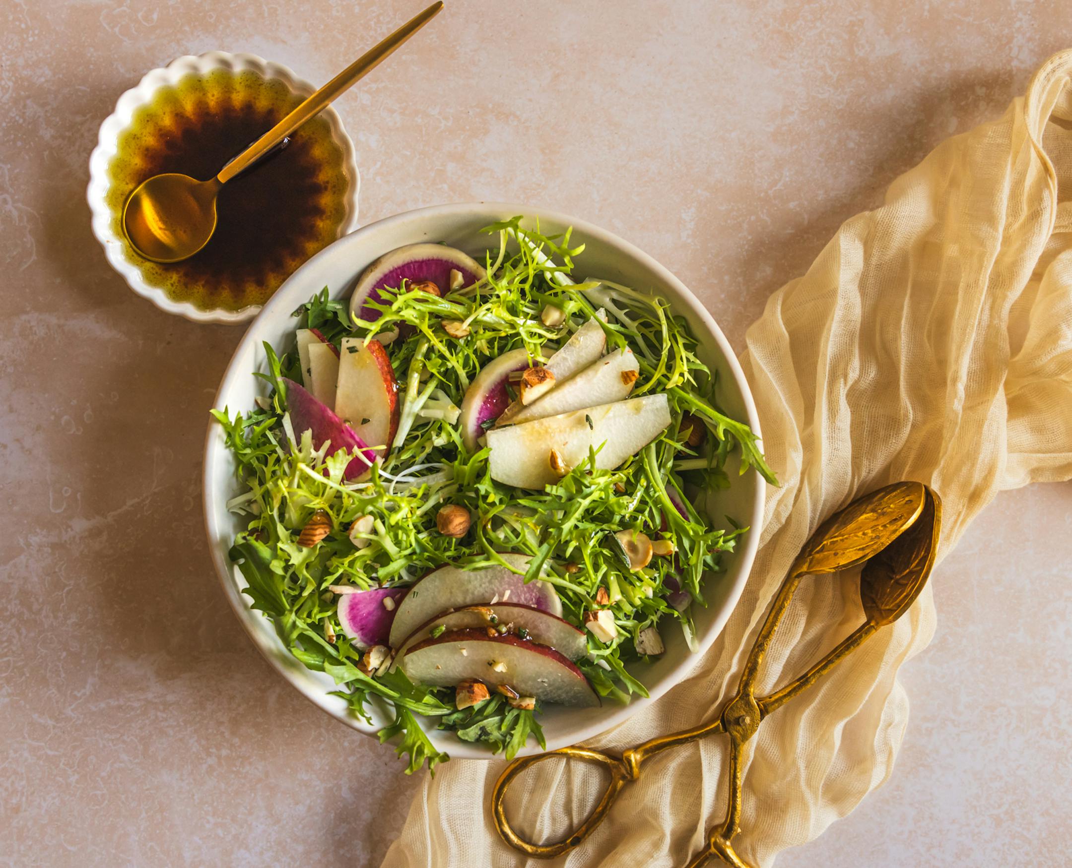 Here’s a cheery winter salad of curly endive, winter pears and crisp nuts, the perfect companion to a warming soup or stew. You’ll have extra dressing to keep on hand for future use. Store it in a covered container in the refrigerator for up to three weeks. From Beth Dooley.