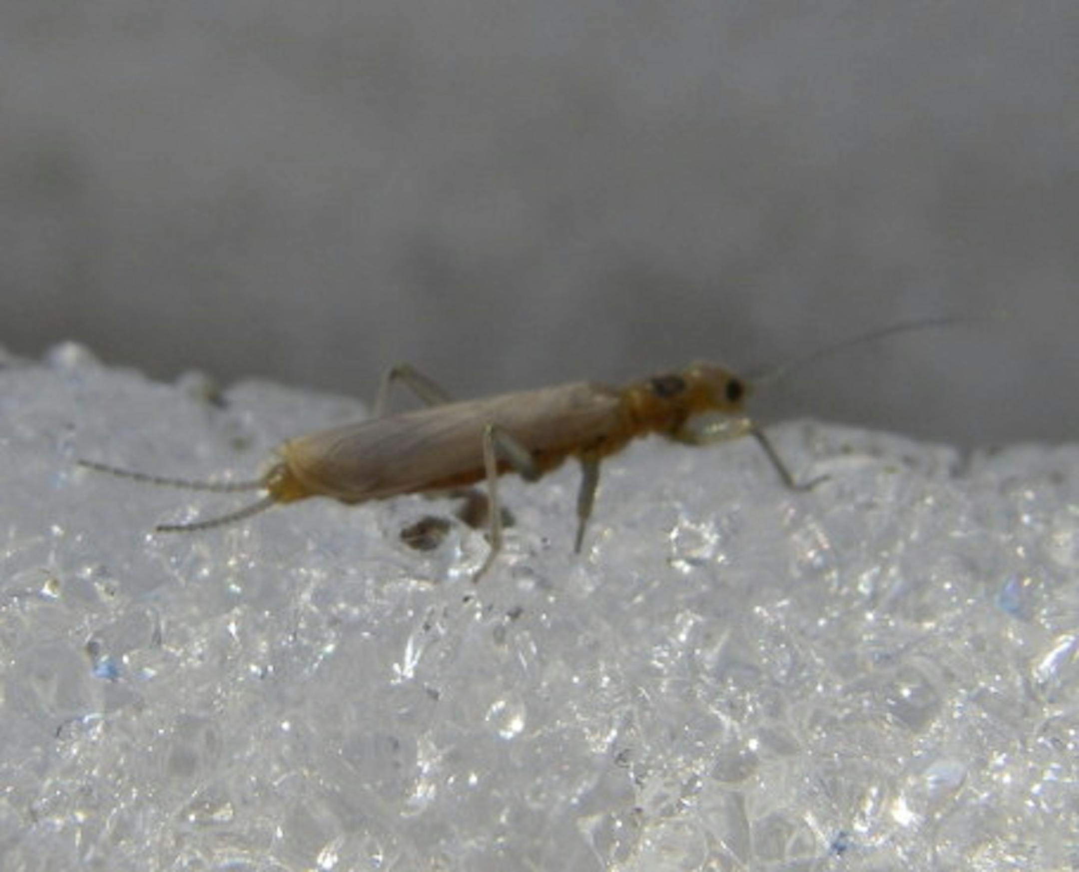 The fly in the photo is an adult stonefly. It starts out as an egg, turns into a growing nymph for most of it's life and finally emerges from the water as an egg laying adult for a short period of time before it passes. I call all the stoneflies I see this time of year Winter Stoneflies. I'll find them from mid January to mid March. They are usually black in color and range in size from #22 to #18. The fly in the photo is a dark amber color about size 18. This is the first time I have seen them this color during this time of the year.