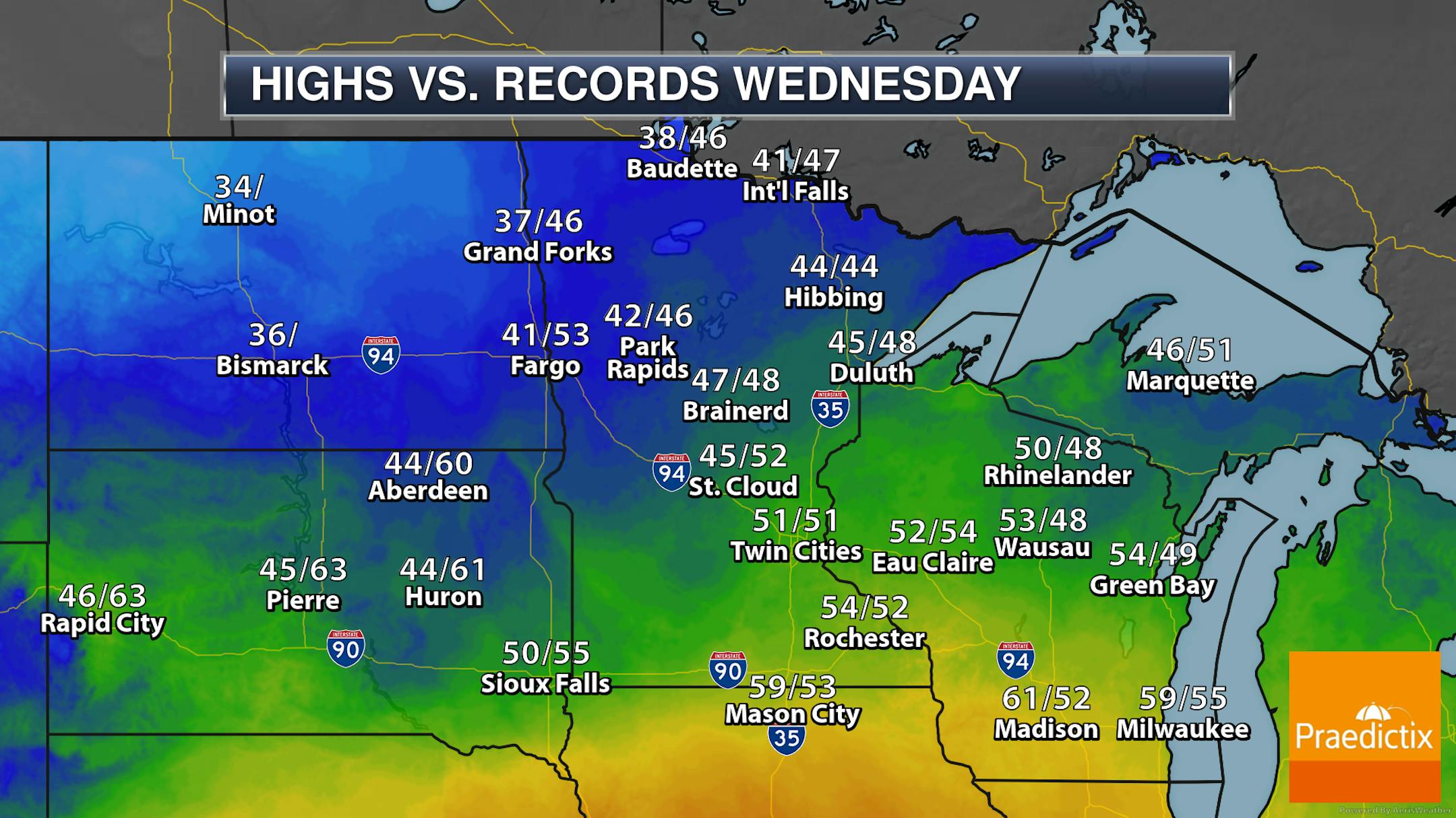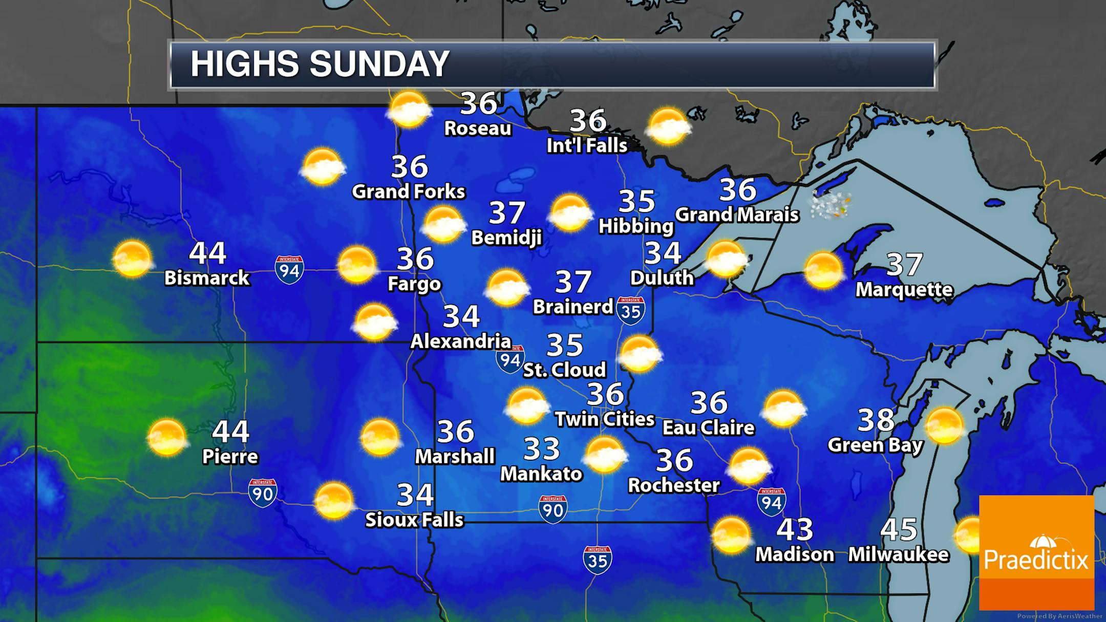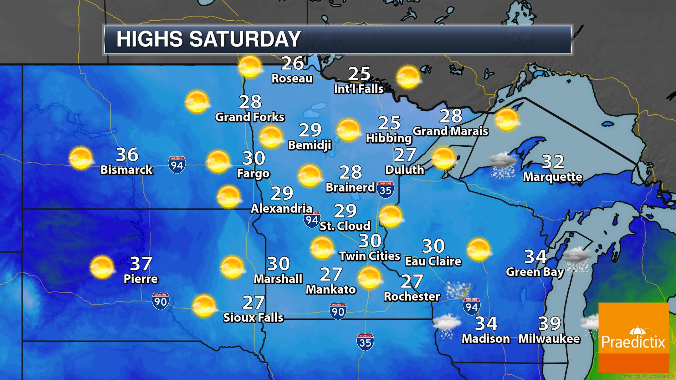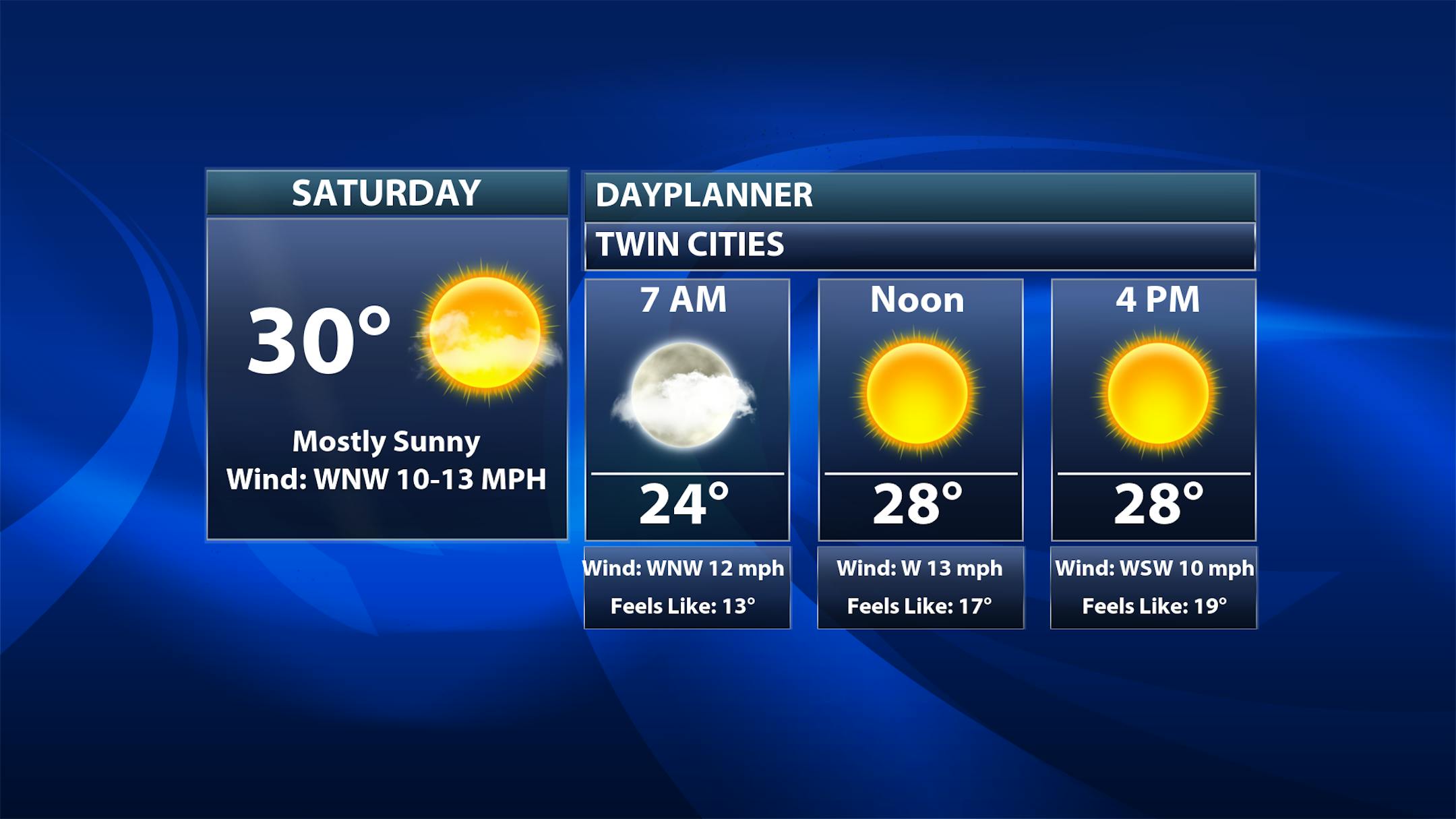 After that heavy snow across southern Minnesota Friday, Saturday will be a much quieter day with mainly sunny skies and temperatures not budging much - only climbing from the mid-20s in the morning to around 30F for a high in the Twin Cities.