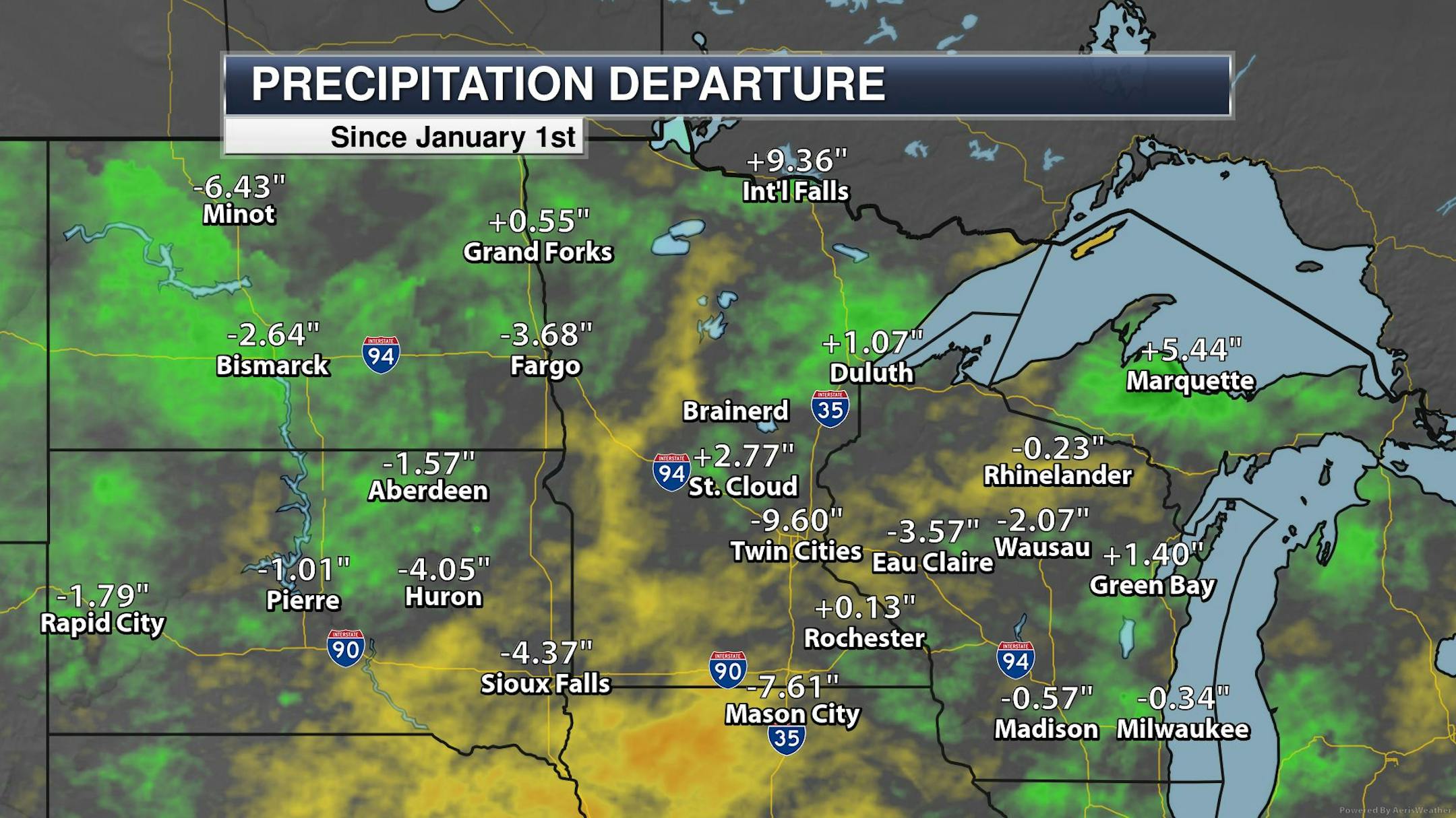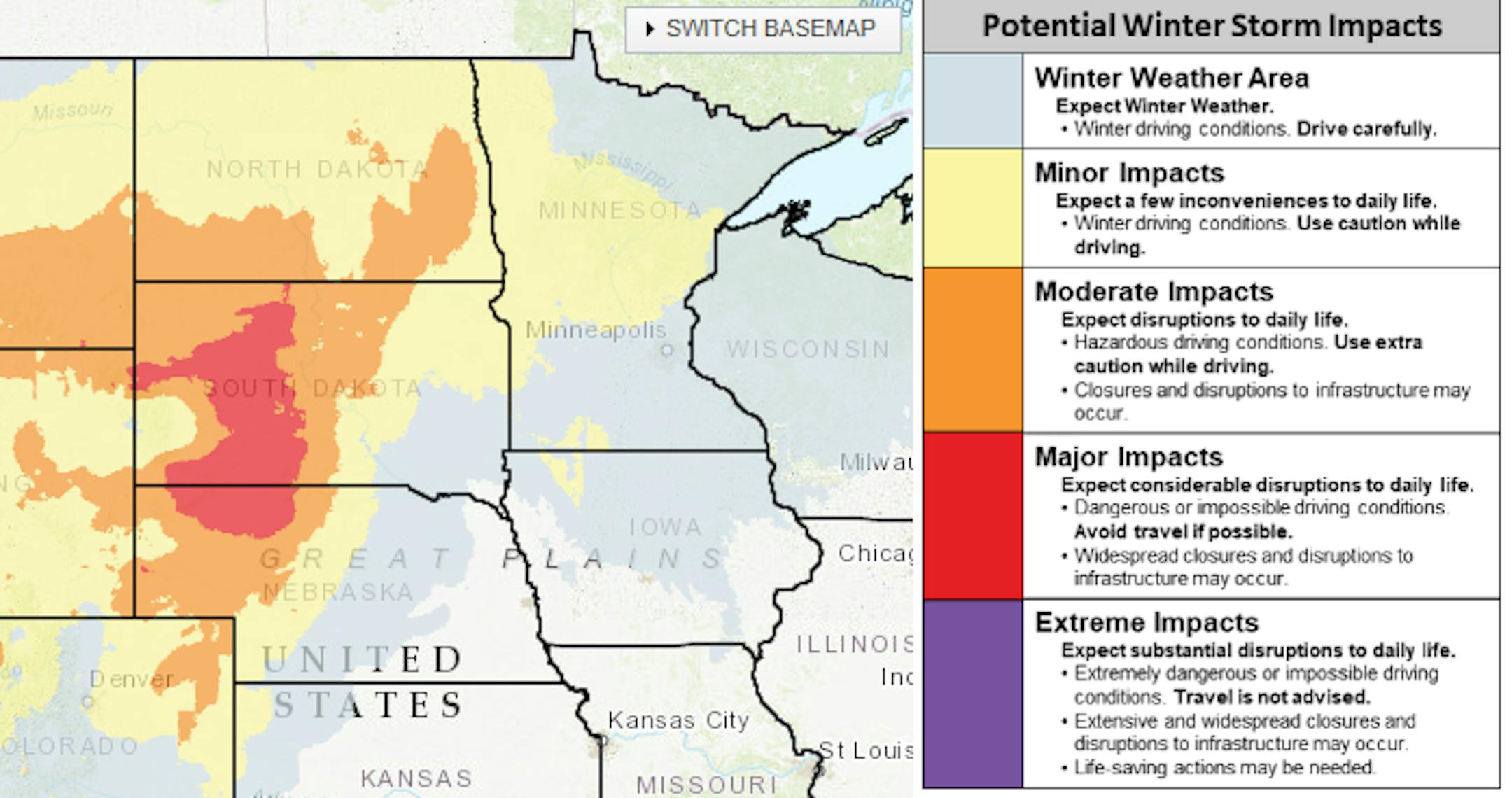 According to NOAA's WPC, the worst of the weather impacts will be across the Dakotas through midday Wednesday. However, there will still be significant impacts across Central MN through midweek.