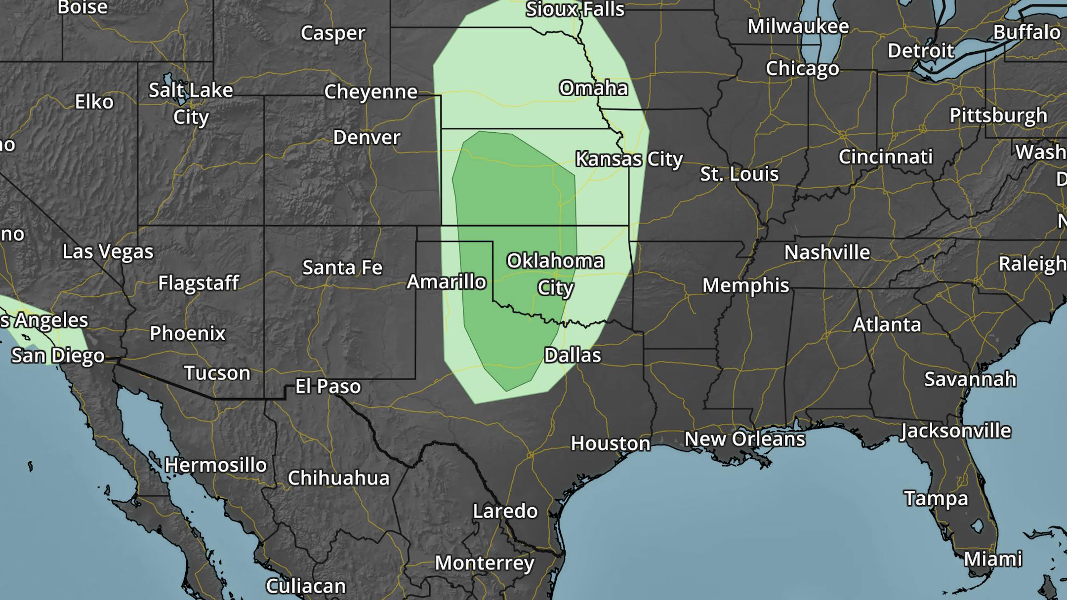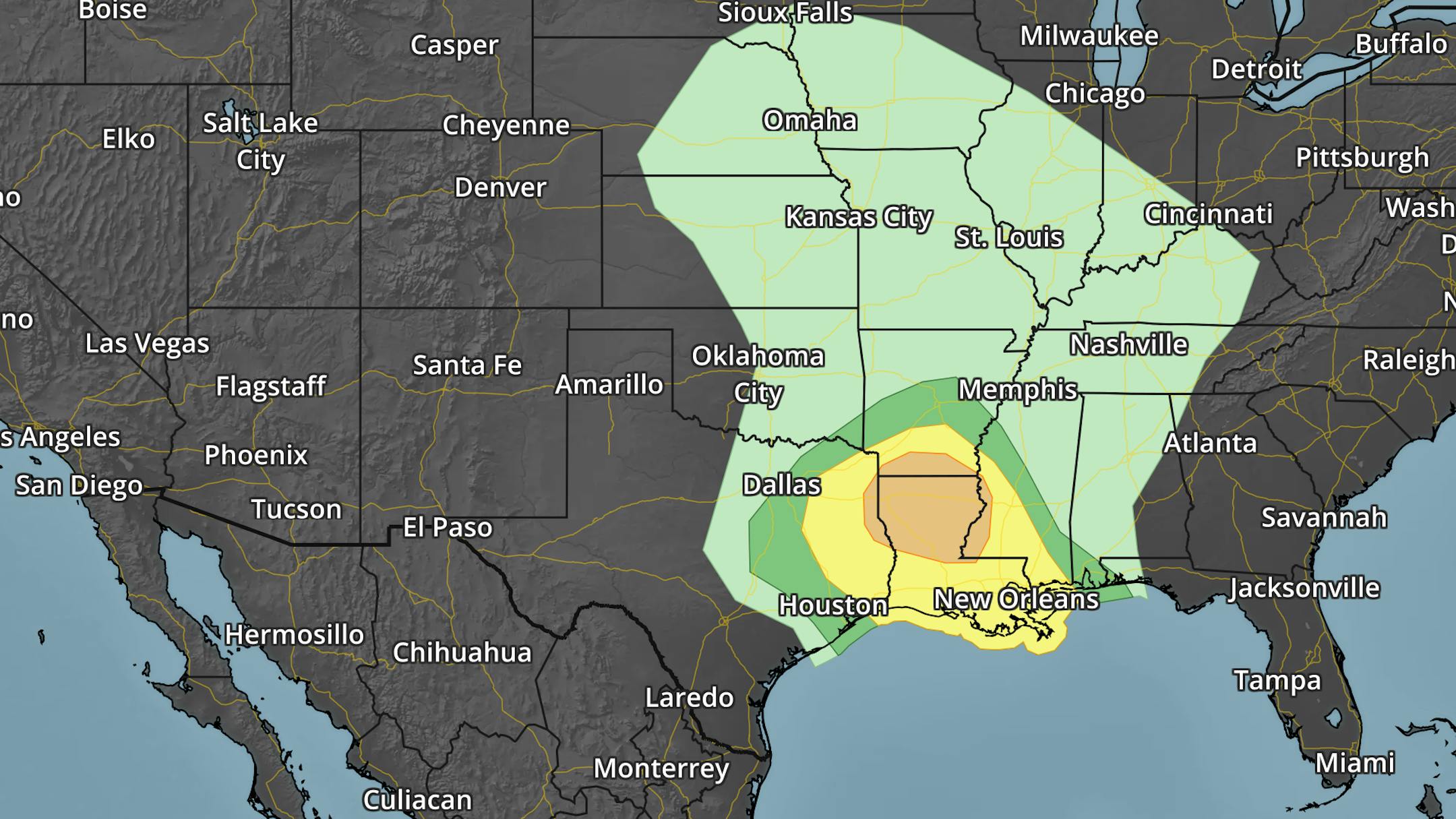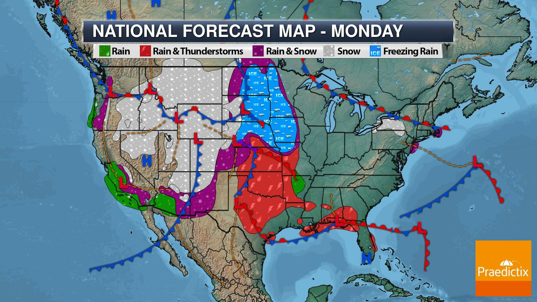 This will be a dynamic storm system with isolated strong to severe storms across the Plains Monday. According to NOAA's SPC, there is a Marginal Risk or severe storms across the Plains, which produce large hail and gusty winds. However, the threat of strong to severe winds and tornadoes increases on Tuesday across the Lower Mississippi Valley as NOAA's SPC has issued an Enhanced risk of severe storms.