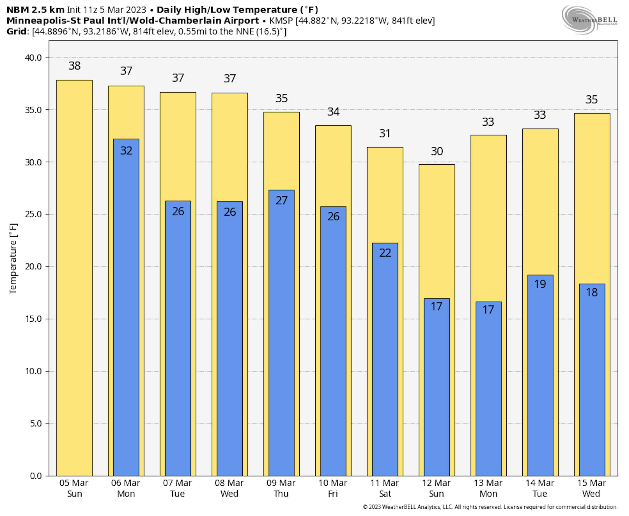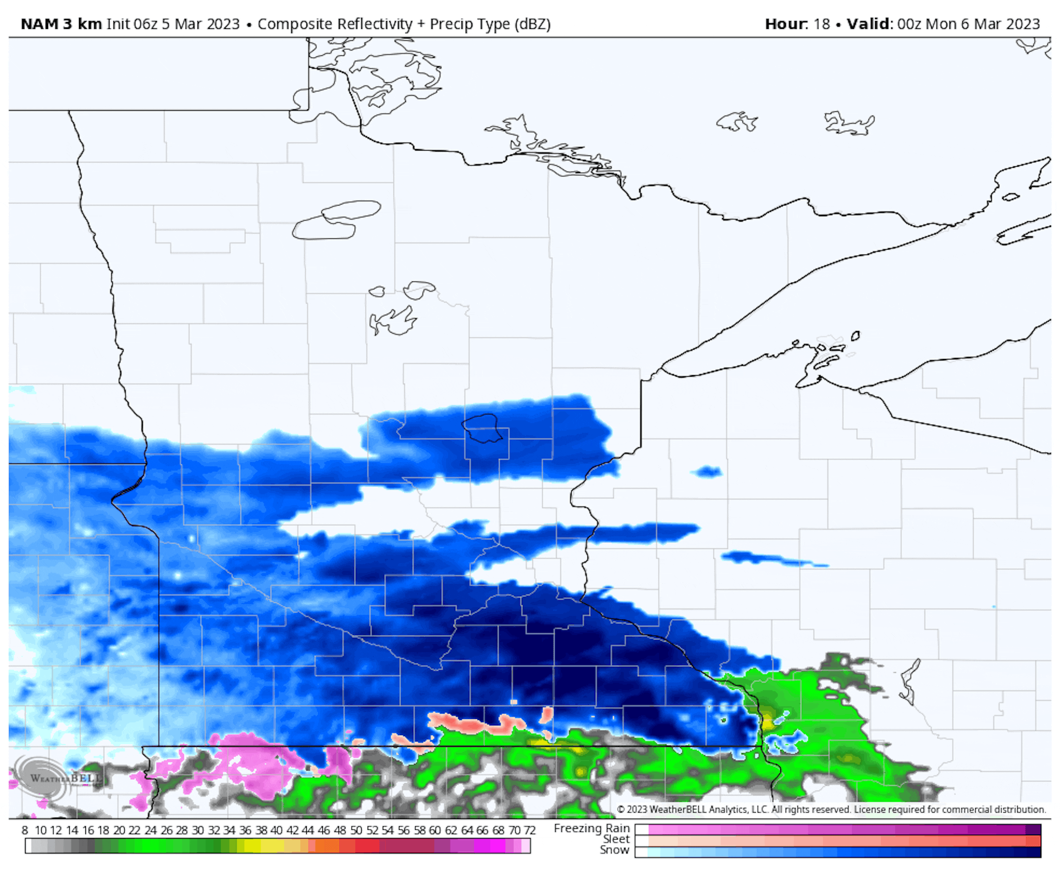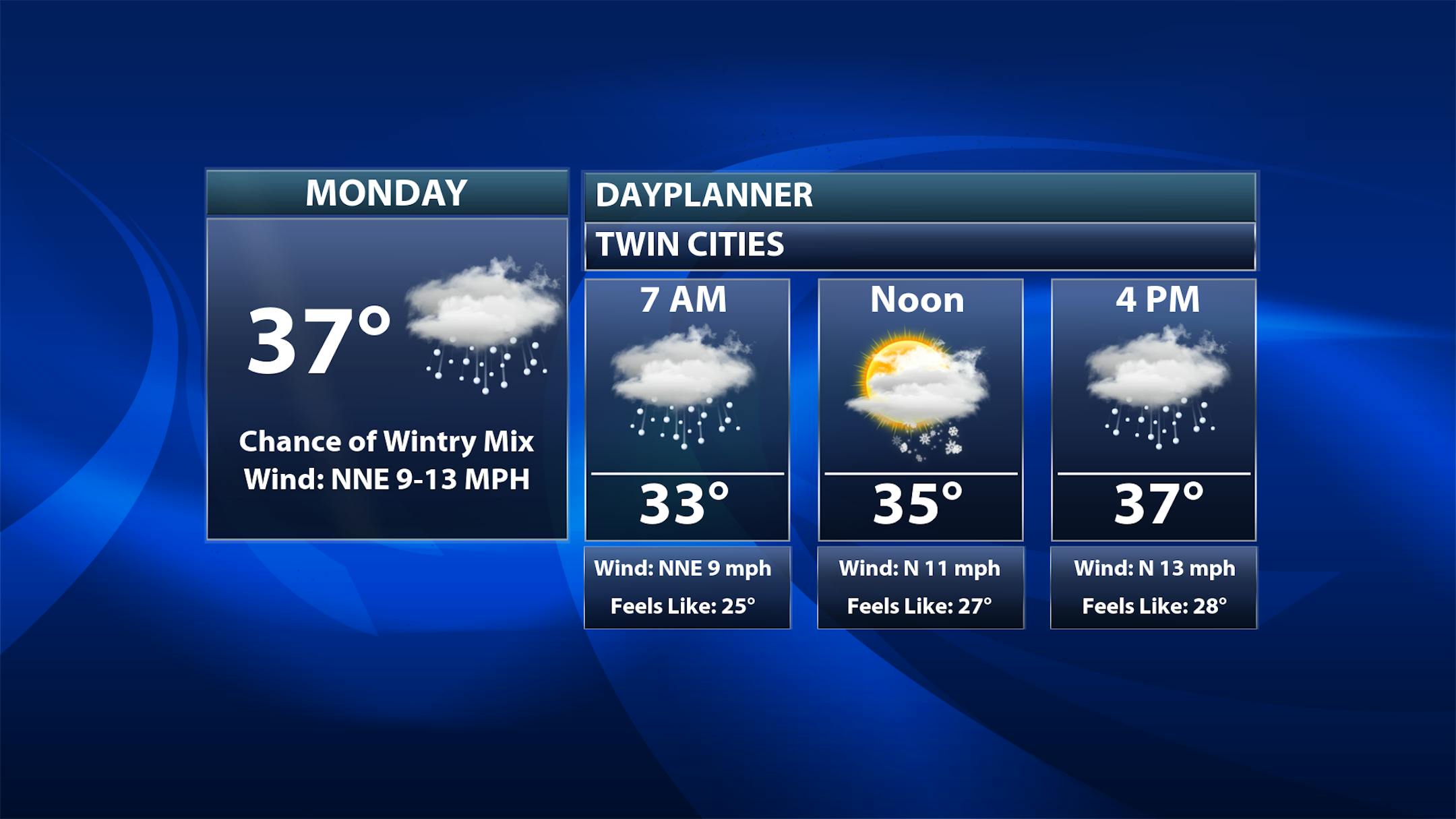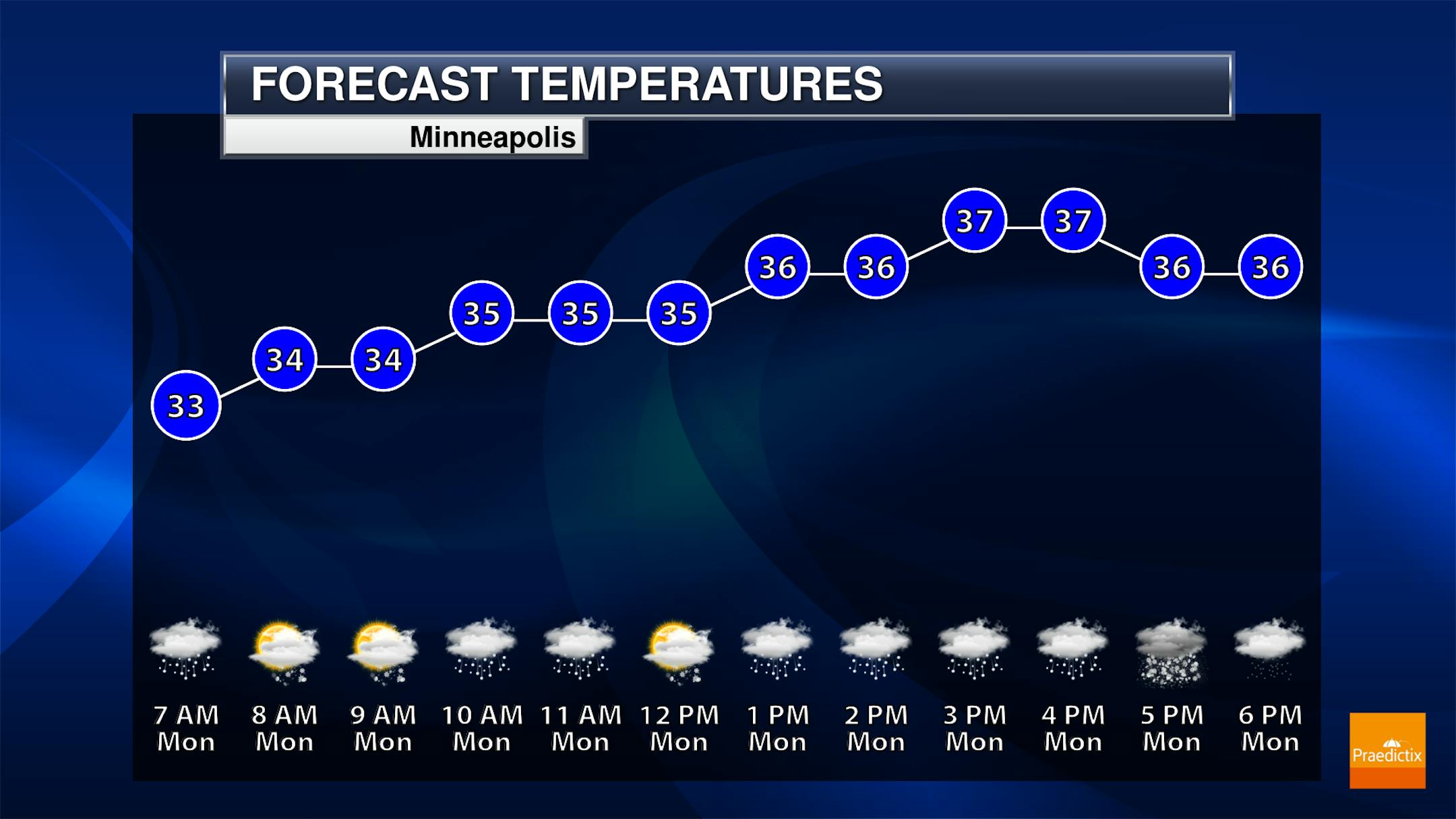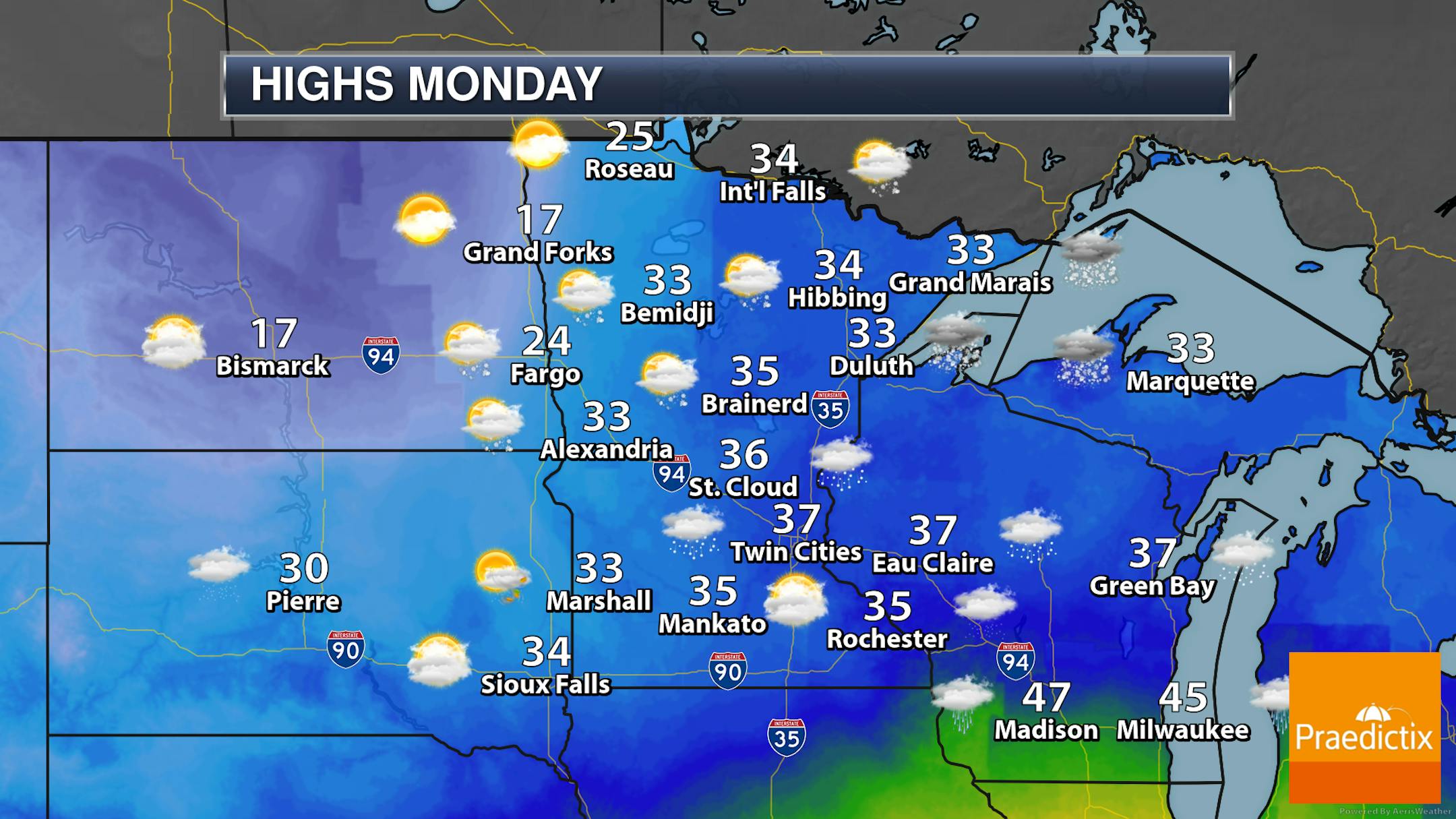 Temperatures will range from the teens up along the Red River Valley to the 30s across much of the state on Monday as we watch those continuing snow/mixed precipitation chances. By late in the day, some sunnier skies will be possible up in northwestern Minnesota.