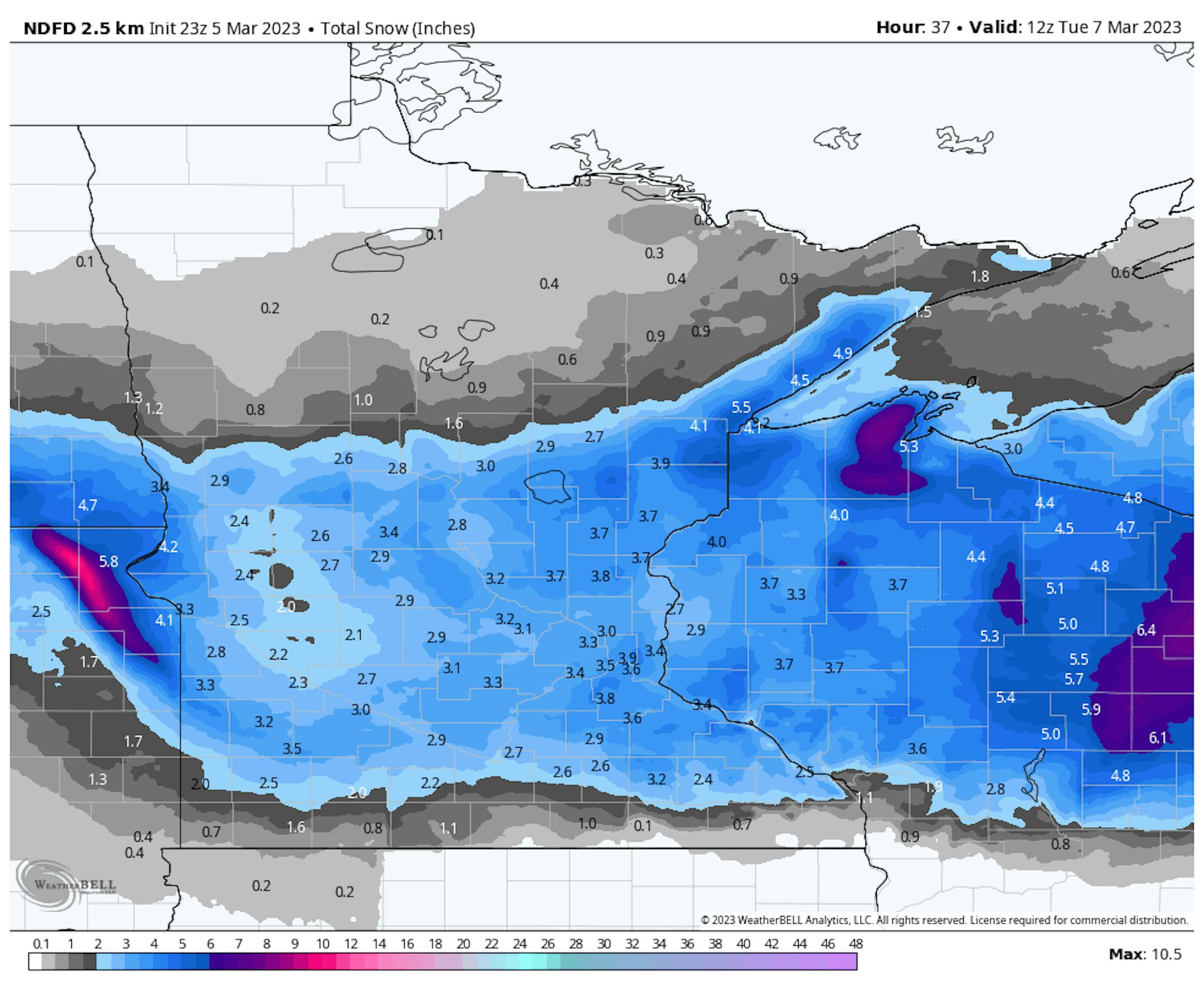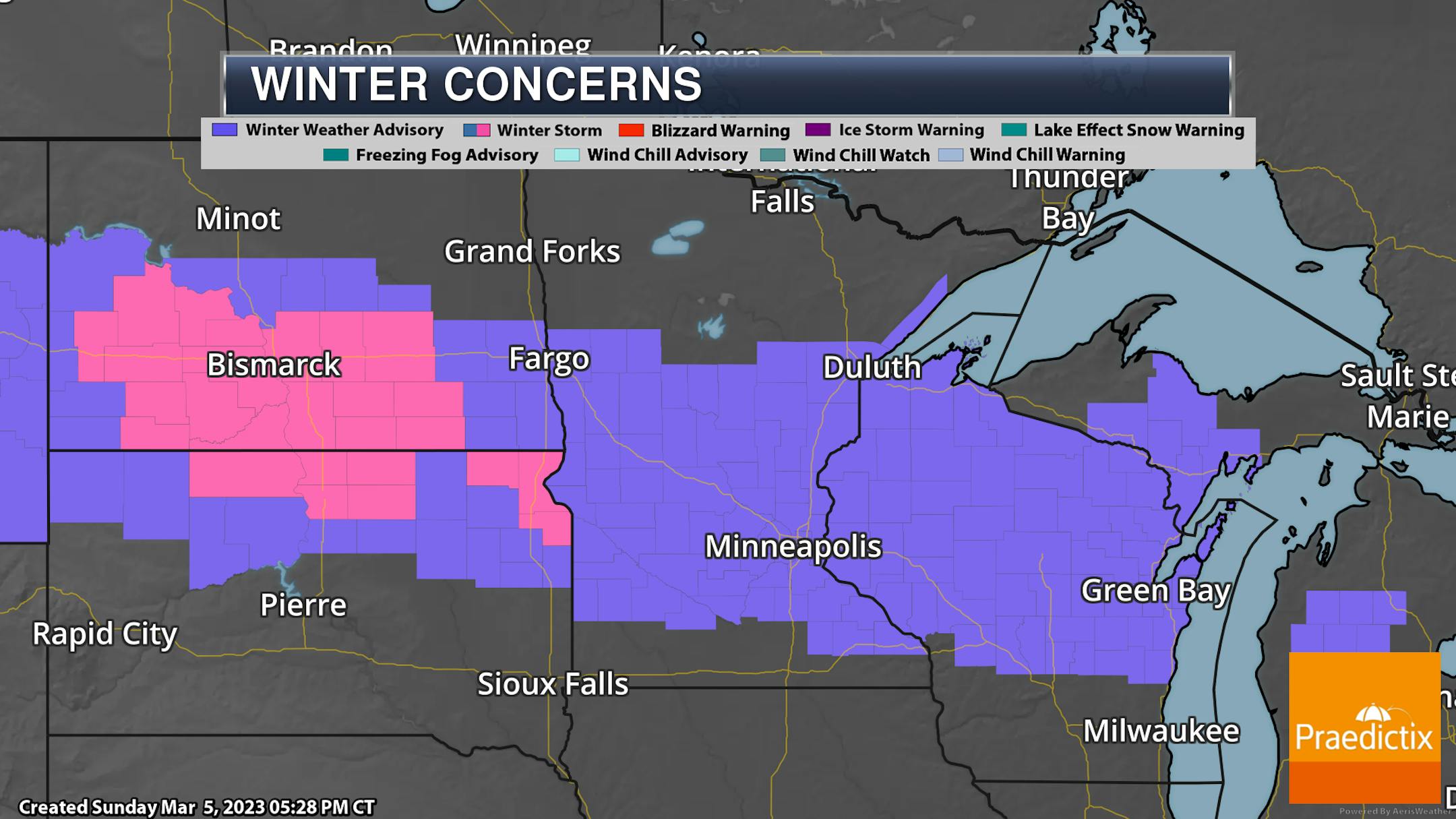 A widespread 1-5" of snow is expected across central and southern Minnesota to the North Shore with this system pushing through Sunday into Monday, with isolated heavier totals along the North Shore and in parts of central Minnesota - including potentially the metro.