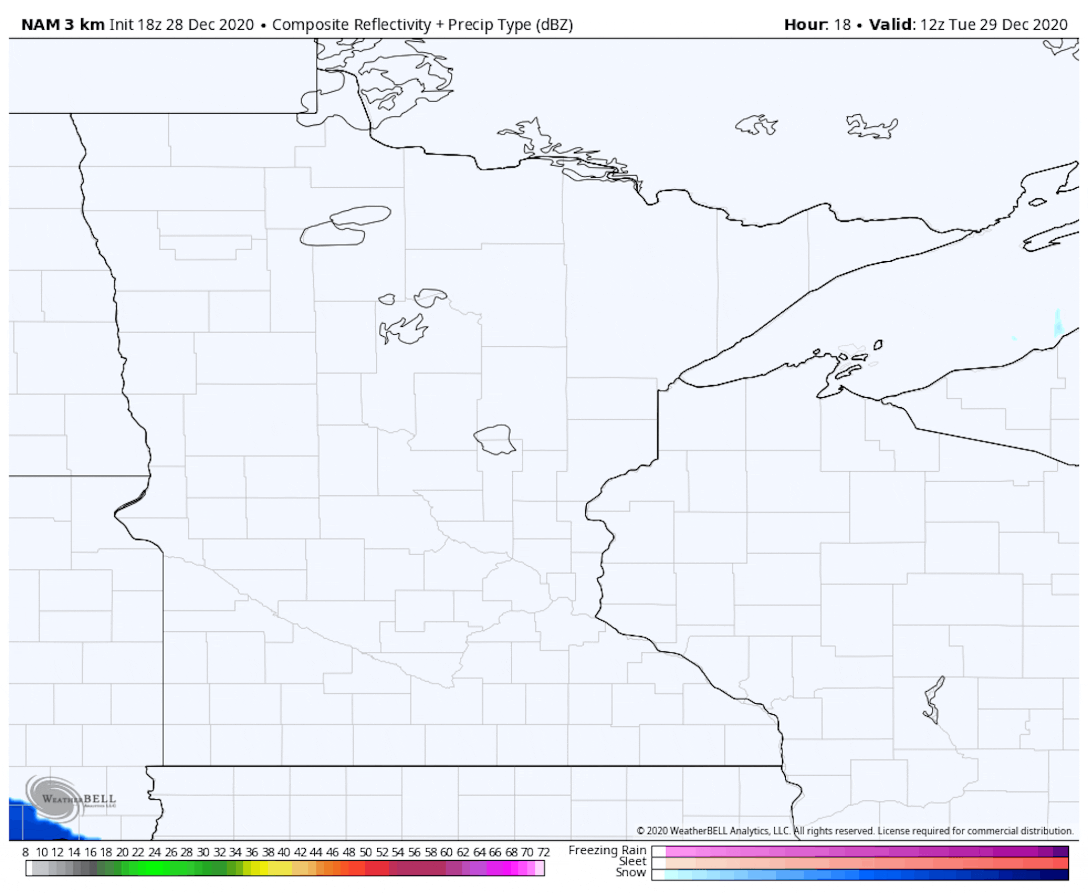 Looks like Mother Nature has one more round of snow in the cards before the end of 2020. This snow will move in during the day on Tuesday from southwest to northeast, with snow expected to start in the Twin Cities around 1-3 PM. Snow will continue to move through during the overnight hours, ending before the morning commute Wednesday in the Twin Cities but lingering in northern Minnesota during the morning hours Wednesday. (Forecast loop: precipitation between 6 AM Tuesday and Noon Wednesday. Credit: WeatherBell).