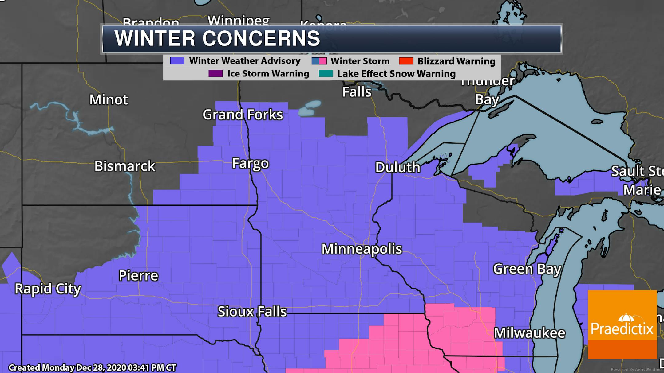 Due to the snow threat Tuesday into Wednesday, most of the state is under a Winter Weather Advisory. In the metro, it is in place from 9 AM Tuesday through 6 AM Wednesday.