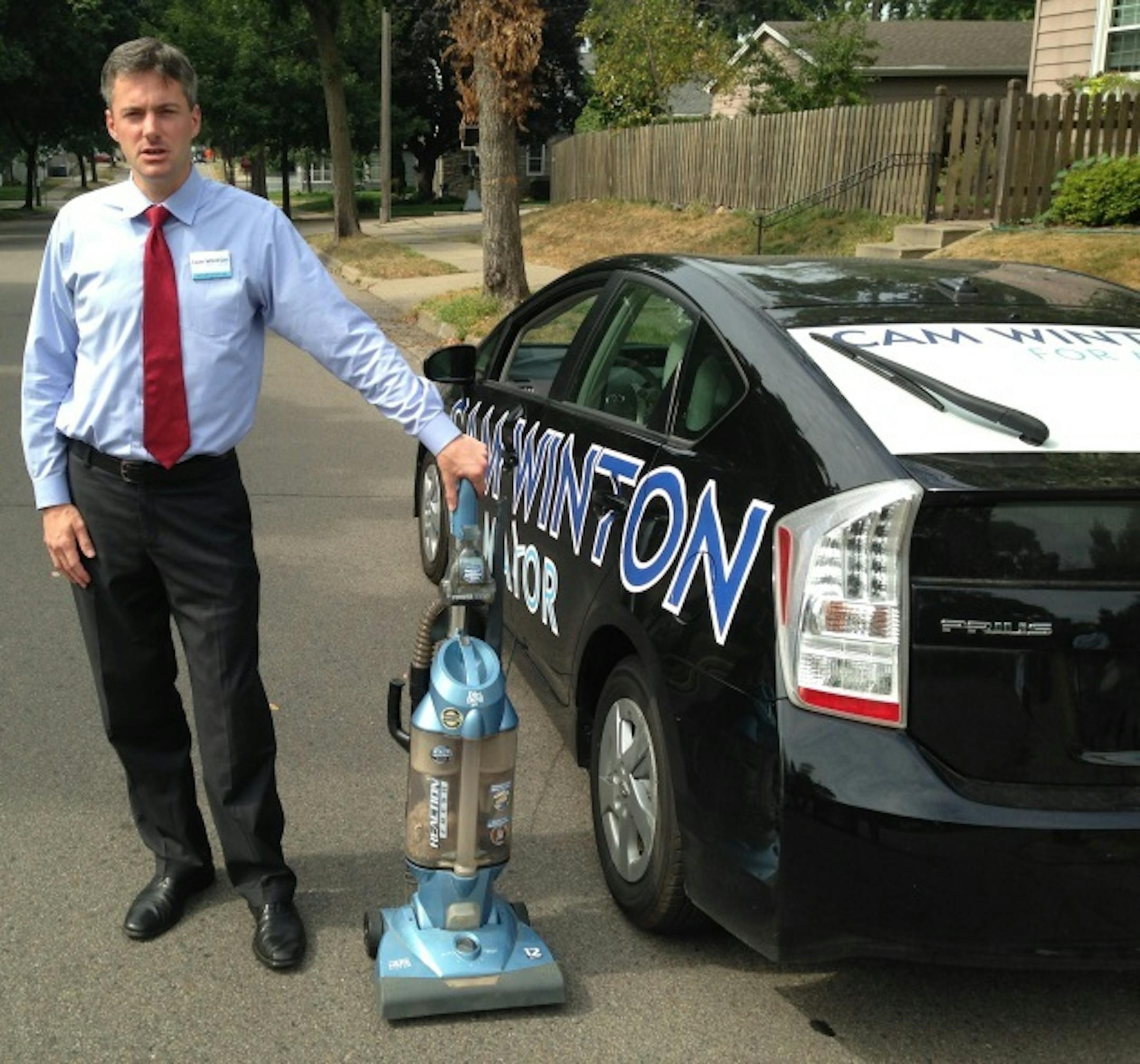 Mayoral candidate Cam Winton hauled a vacuum out to South Minneapolis Monday to illustrate the noise some homeowners endure from airplanes overhead.