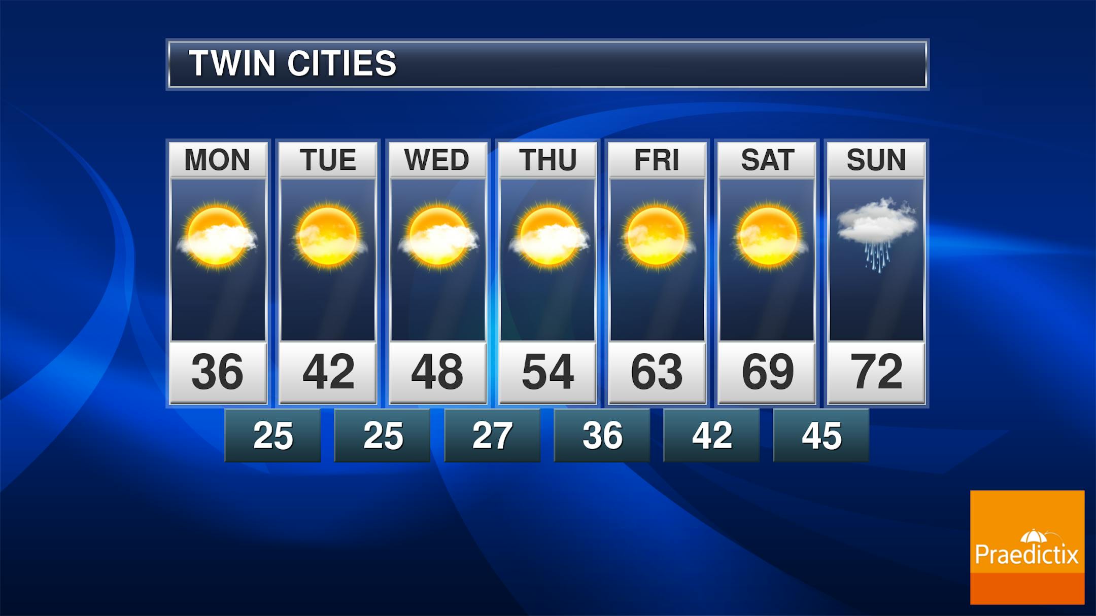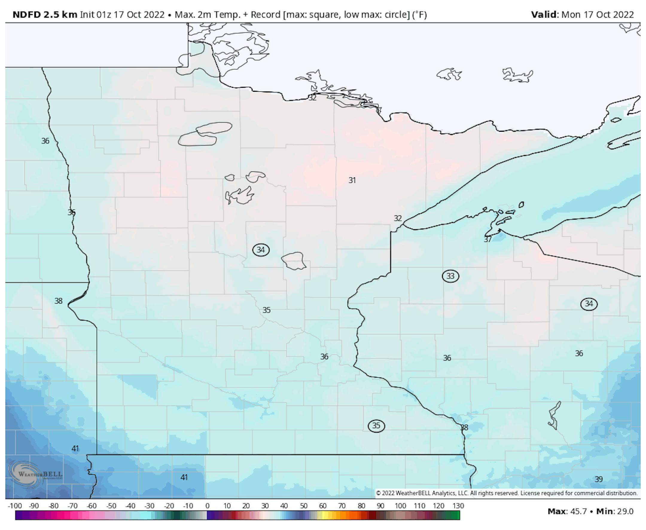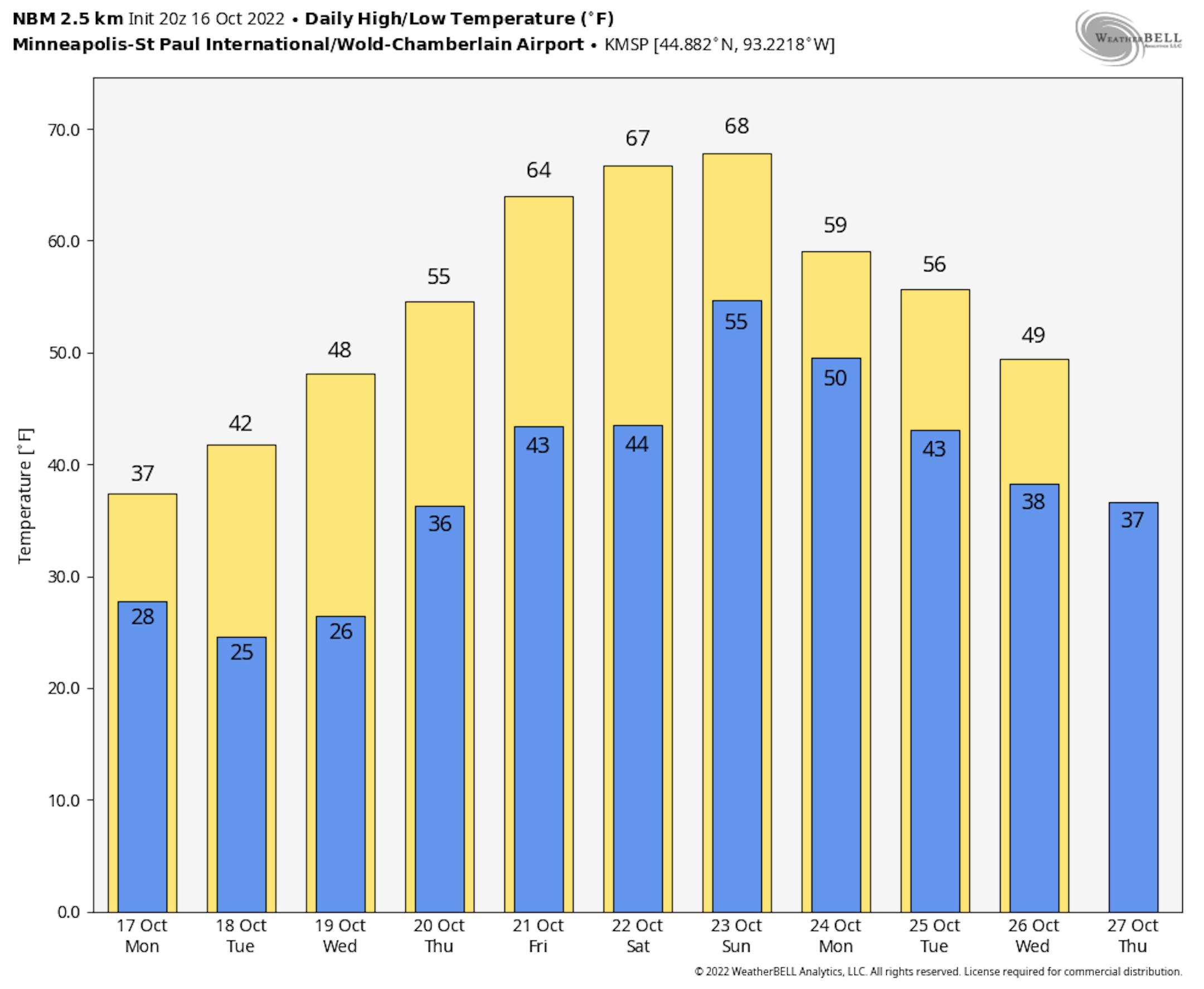 Here's the extended temperature outlook for Minneapolis through the end of the month. Note that readings will be very chilly through the first half of the week with a gradual warming trend by the weekend. We could be near 70F again this weekend before another cool snap arrives for the last full week of October.