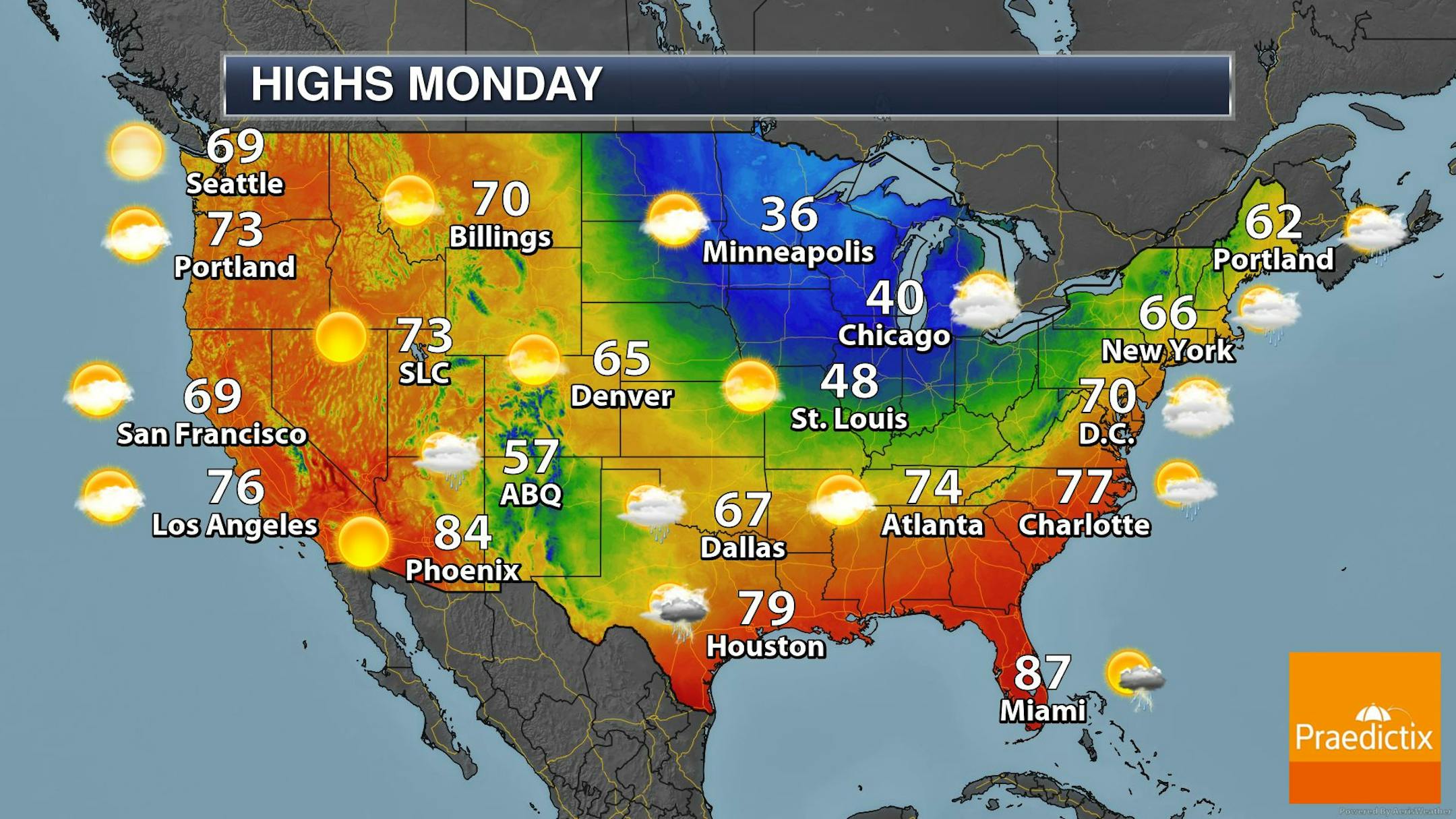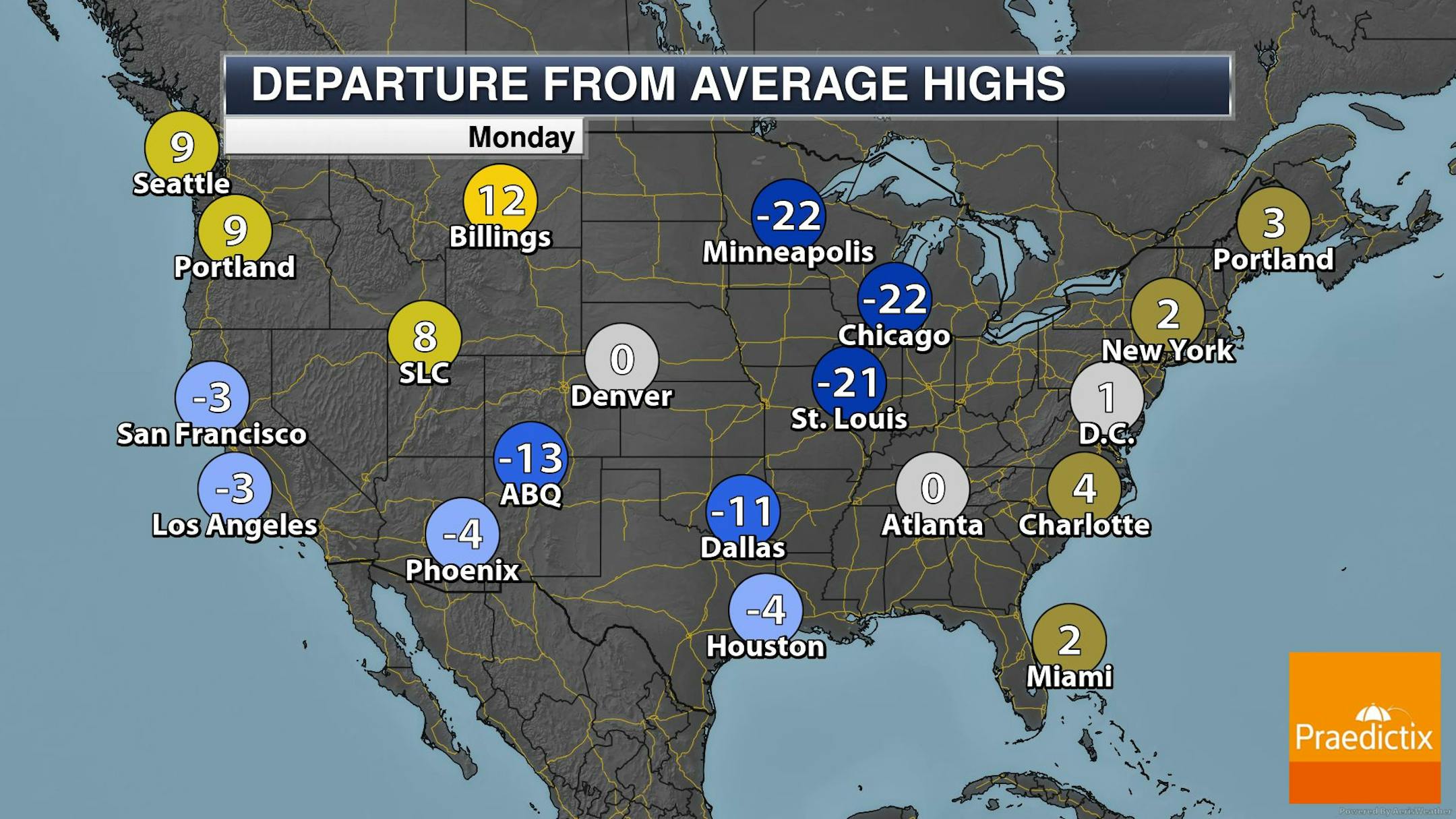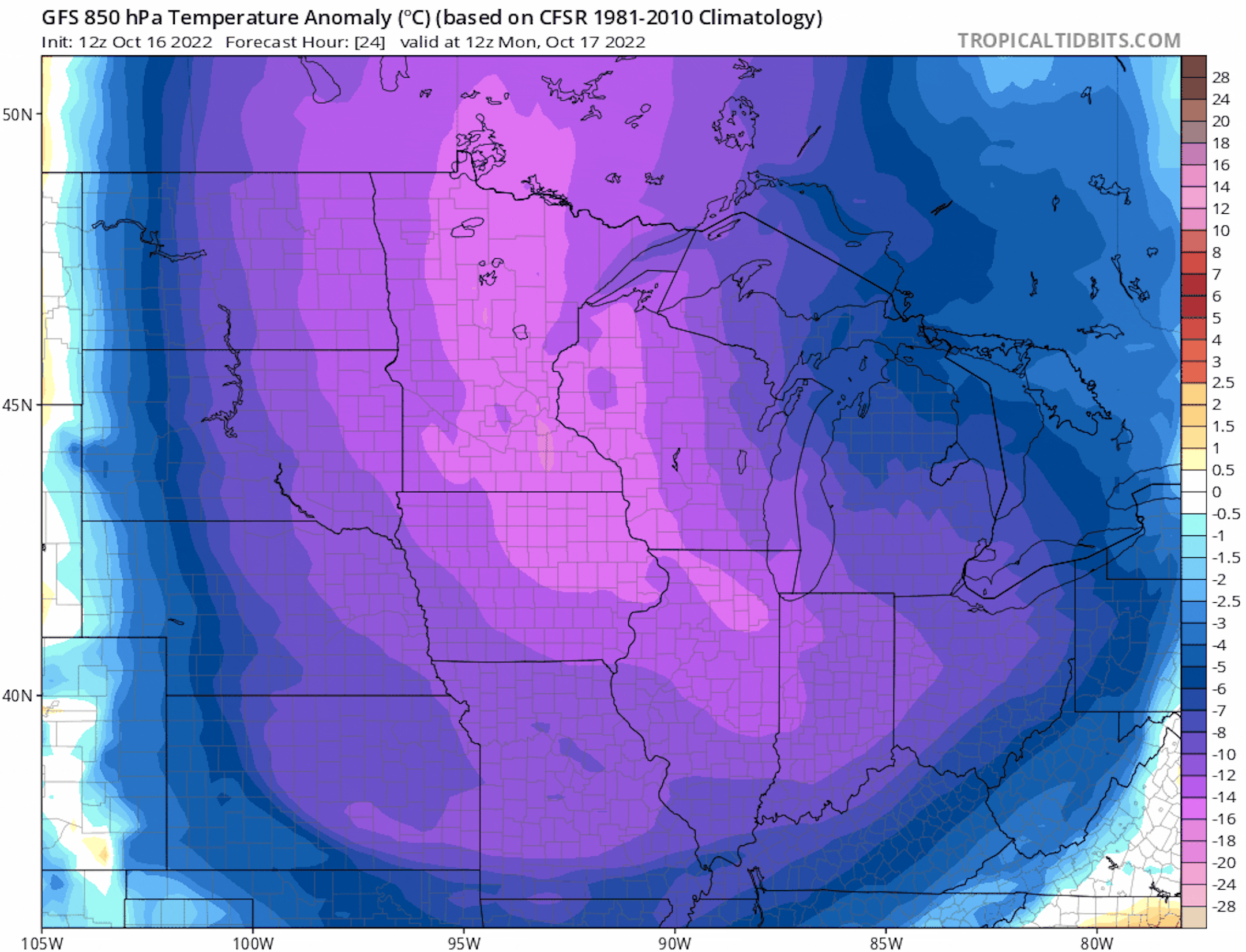 The 850mb temp anomaly through the week ahead shows chilly temps in place over the next several days. However, the 2nd half of the week looks to be warmer with highs nearing 70F once again by the weekend.