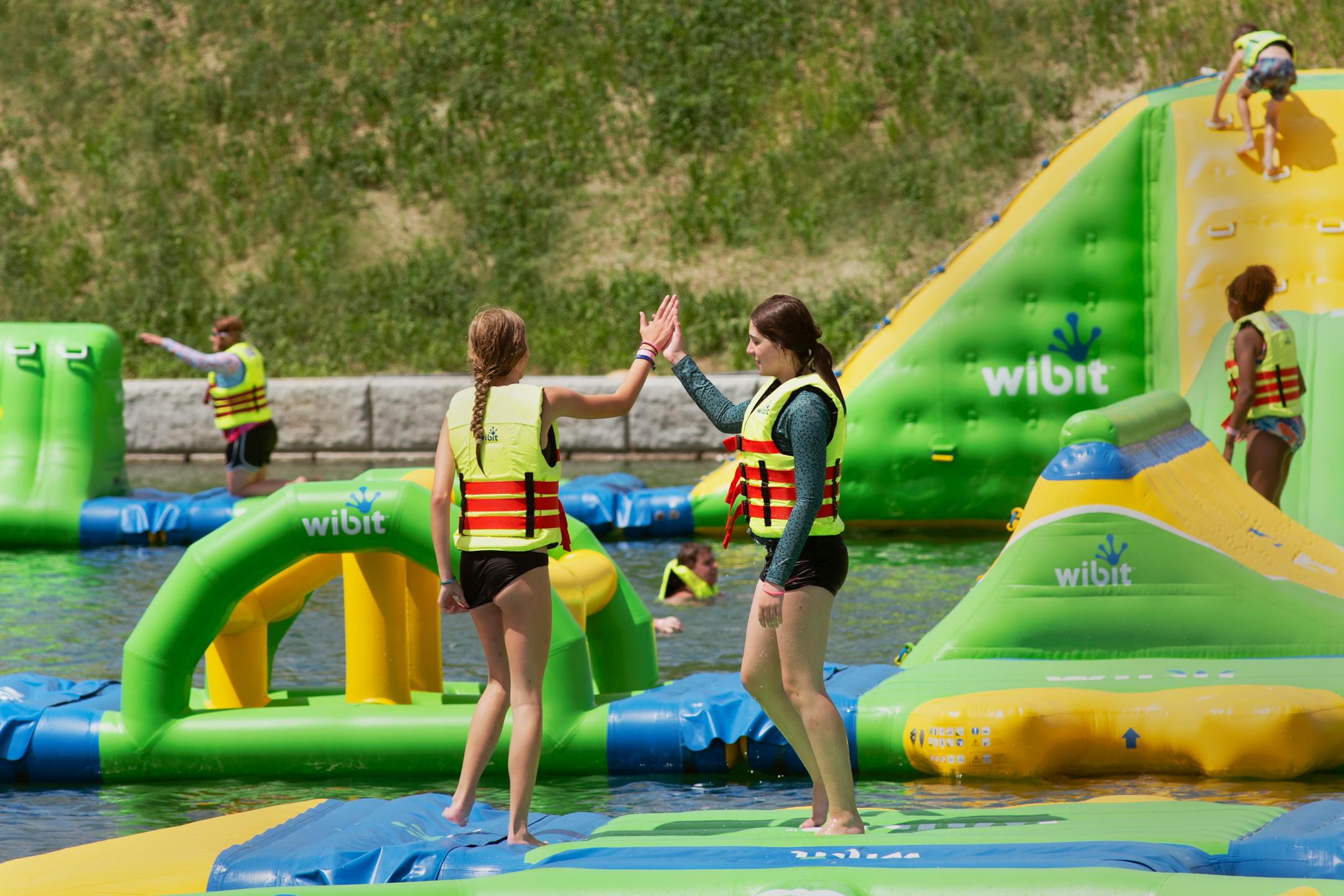 A family of three is contemplating the large inflatable ship's wheel floating in front of them on Lake Wisconsin Dells. It's one of several dozen obstacles in what claims to be the largest inflatable waterpark in the nation. In addition to the wheel, obstacles include bridges, trampolines, climbing walls and pyramids, all stitched together by floating mats.