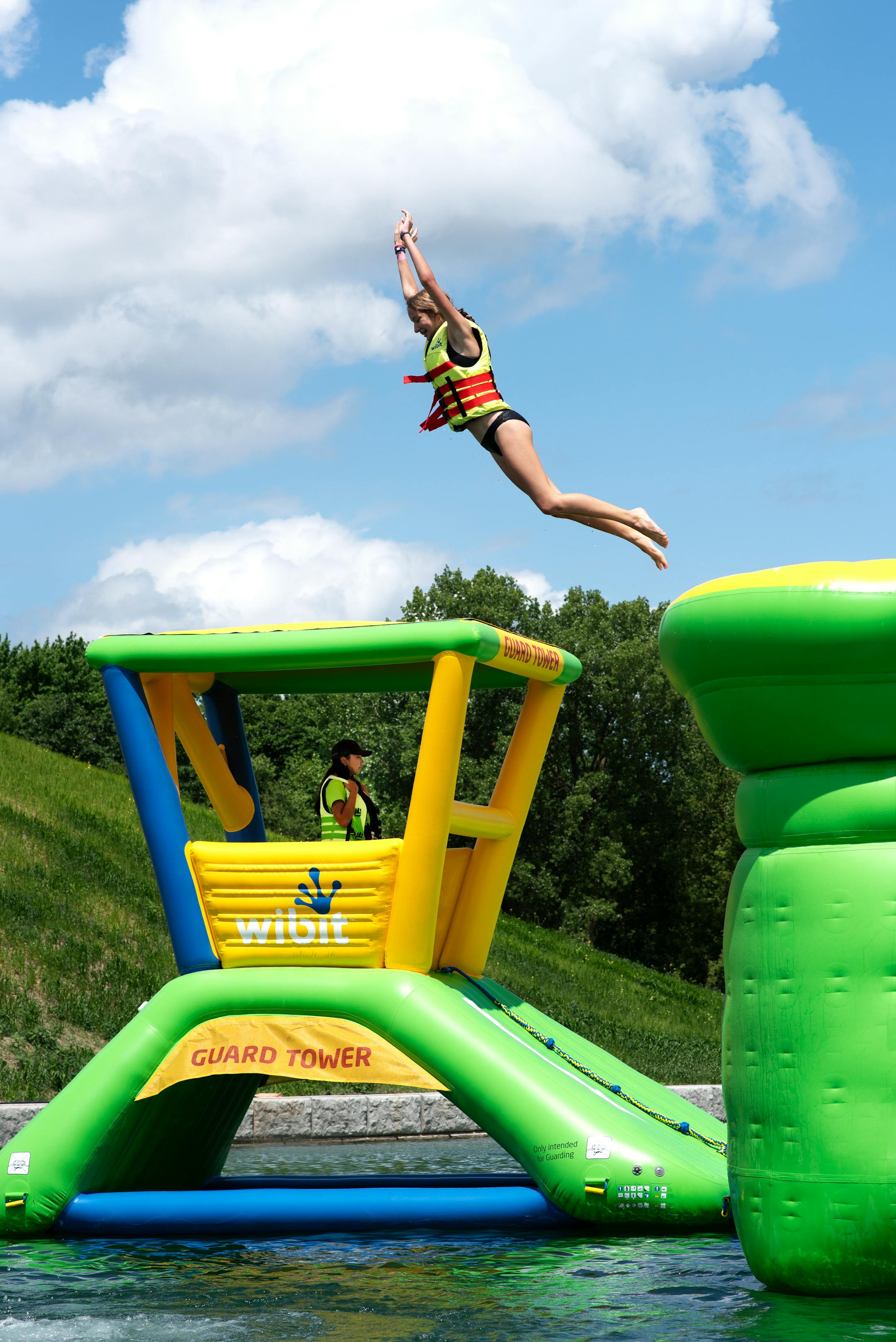 The inflatable waterpark, called Waterworld, is the central feature at the Land of Natura, one of the newest attractions in the vacation mecca of Wisconsin Dells. It includes a separate Mini-Waterworld for tots, floating cabanas and two inflated waterslides (30 and 60 feet long) affixed to the side of Mount Natura, a manmade hill towering over the lake.