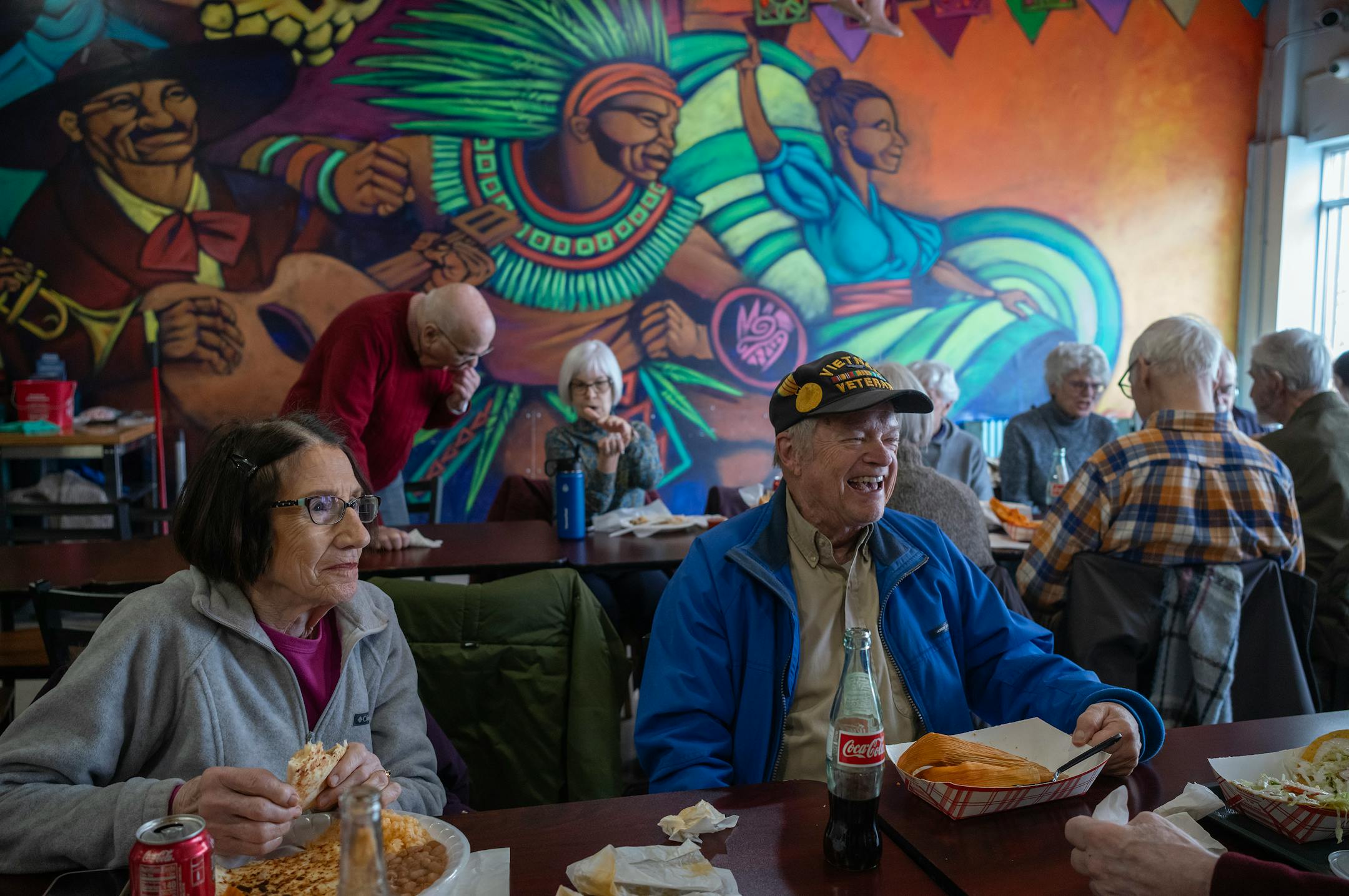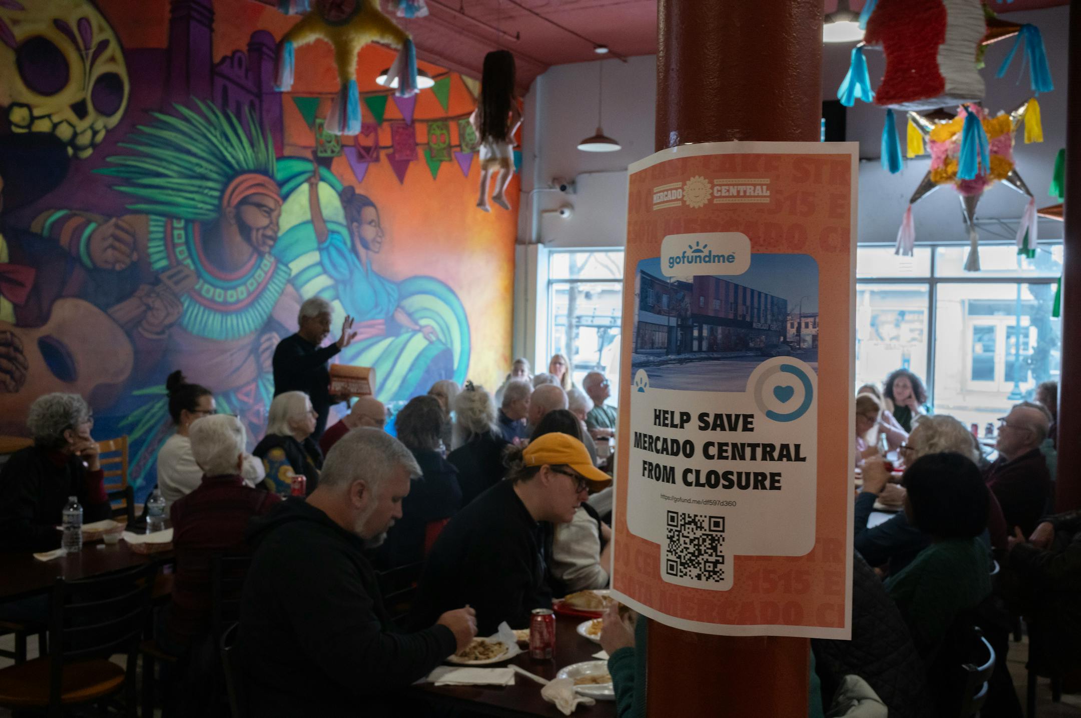 Though the Mercado is decorated for a party — bright murals wrapping around and within the building, pinatas swaying from the ceiling, salsa coming in over the sound system — customers only trickle in for bakery pastries or fresh juices by the door.