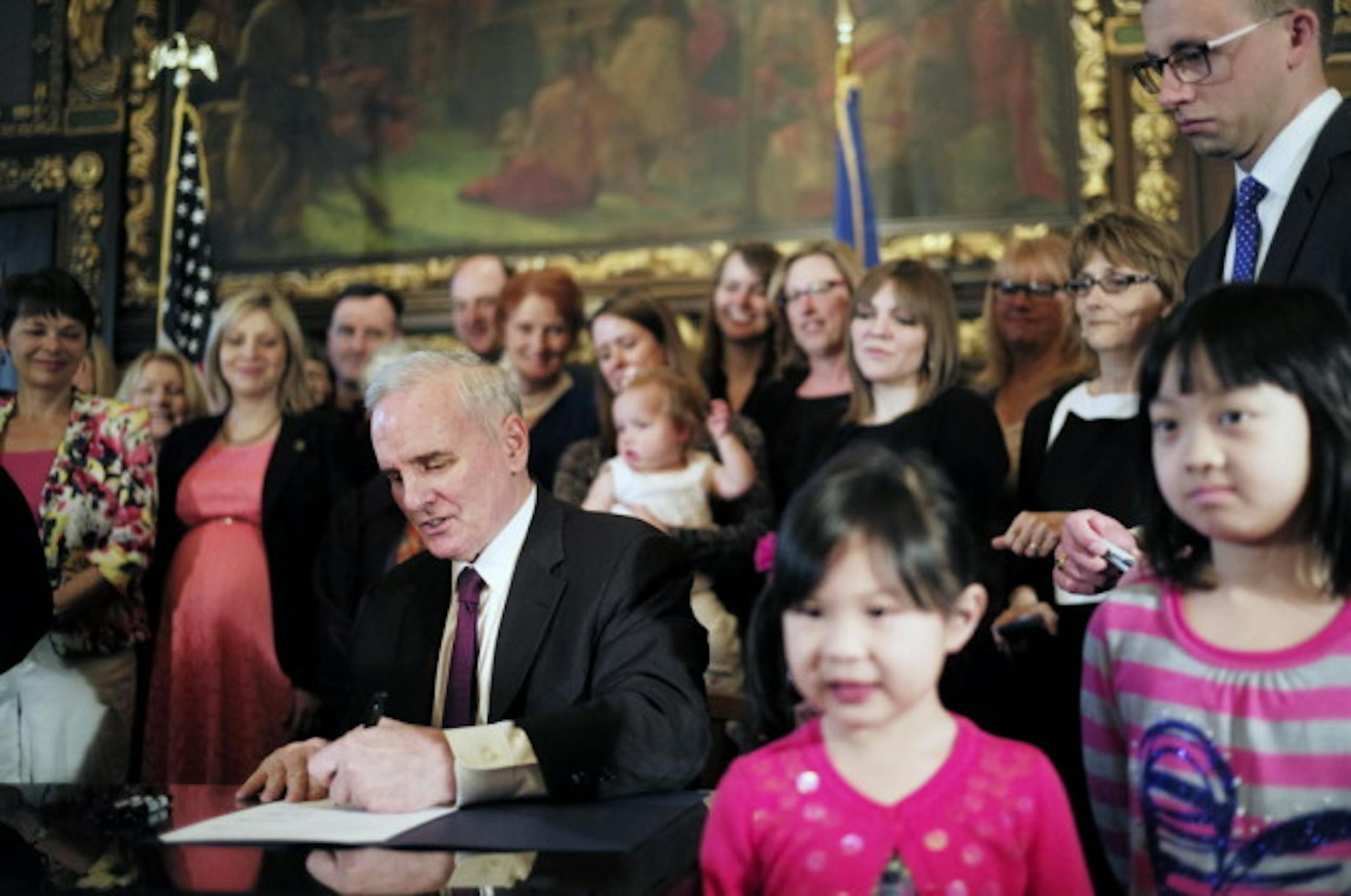 Dayton signed the bill surrounded by women at an event at the governor's reception room. Women's groups fought hard for the package.