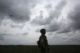 Engines throbbing, C-47 transport planes dropped string after string of parachutists, a couple of hundred in all - including Rice, who jumped strapped to a partner, not alone and laden with weapons as he did on June 6, 1944.