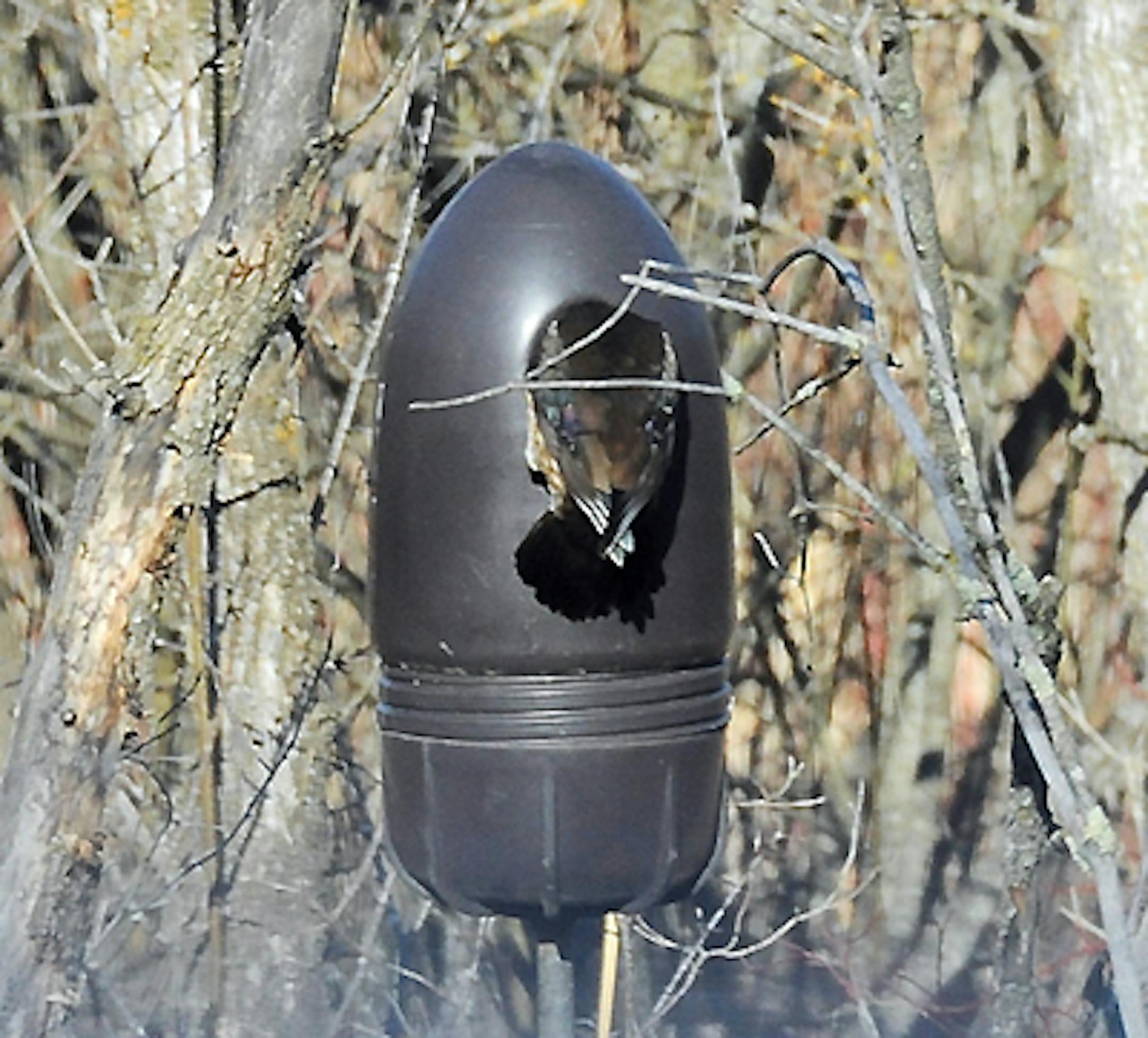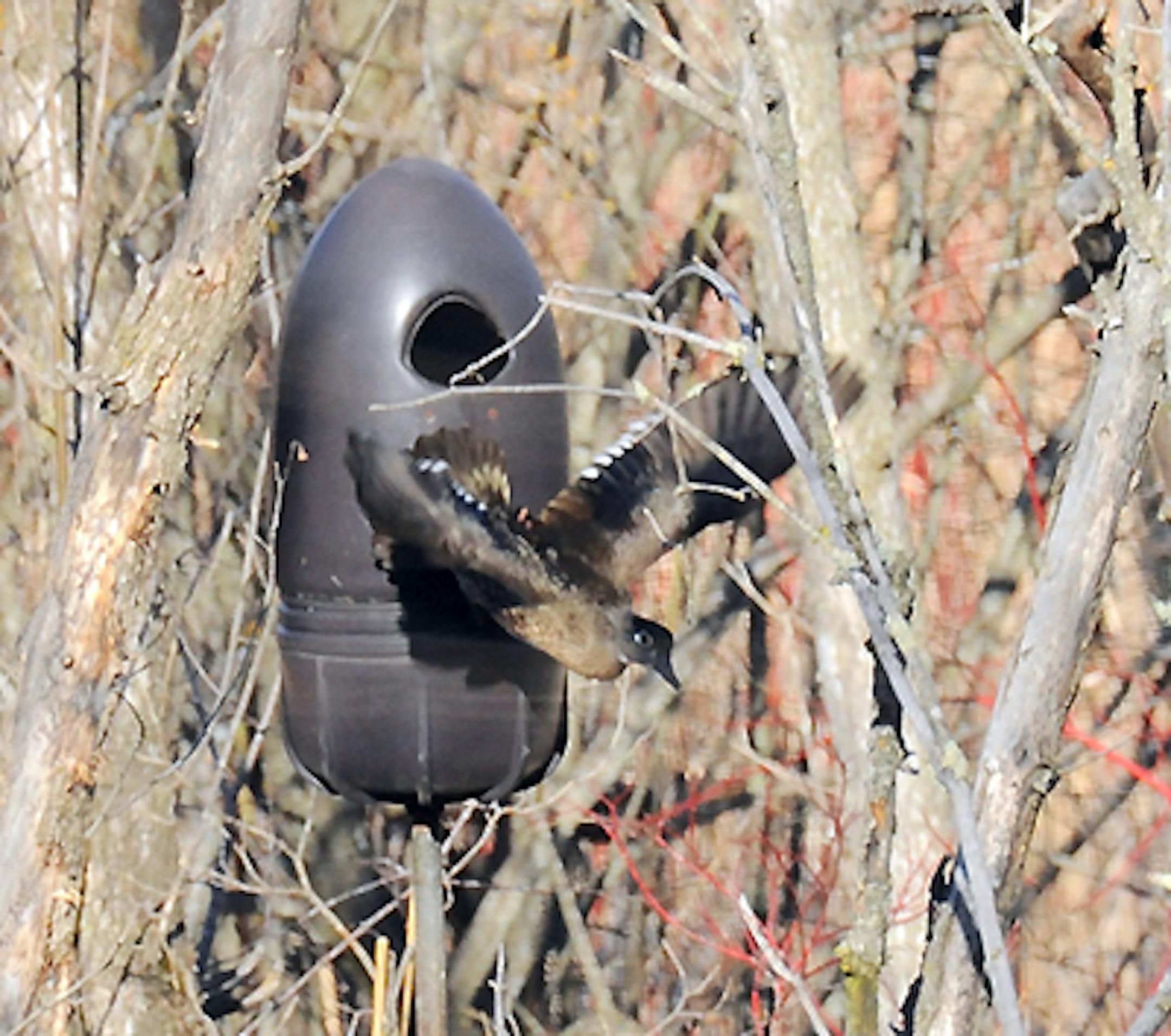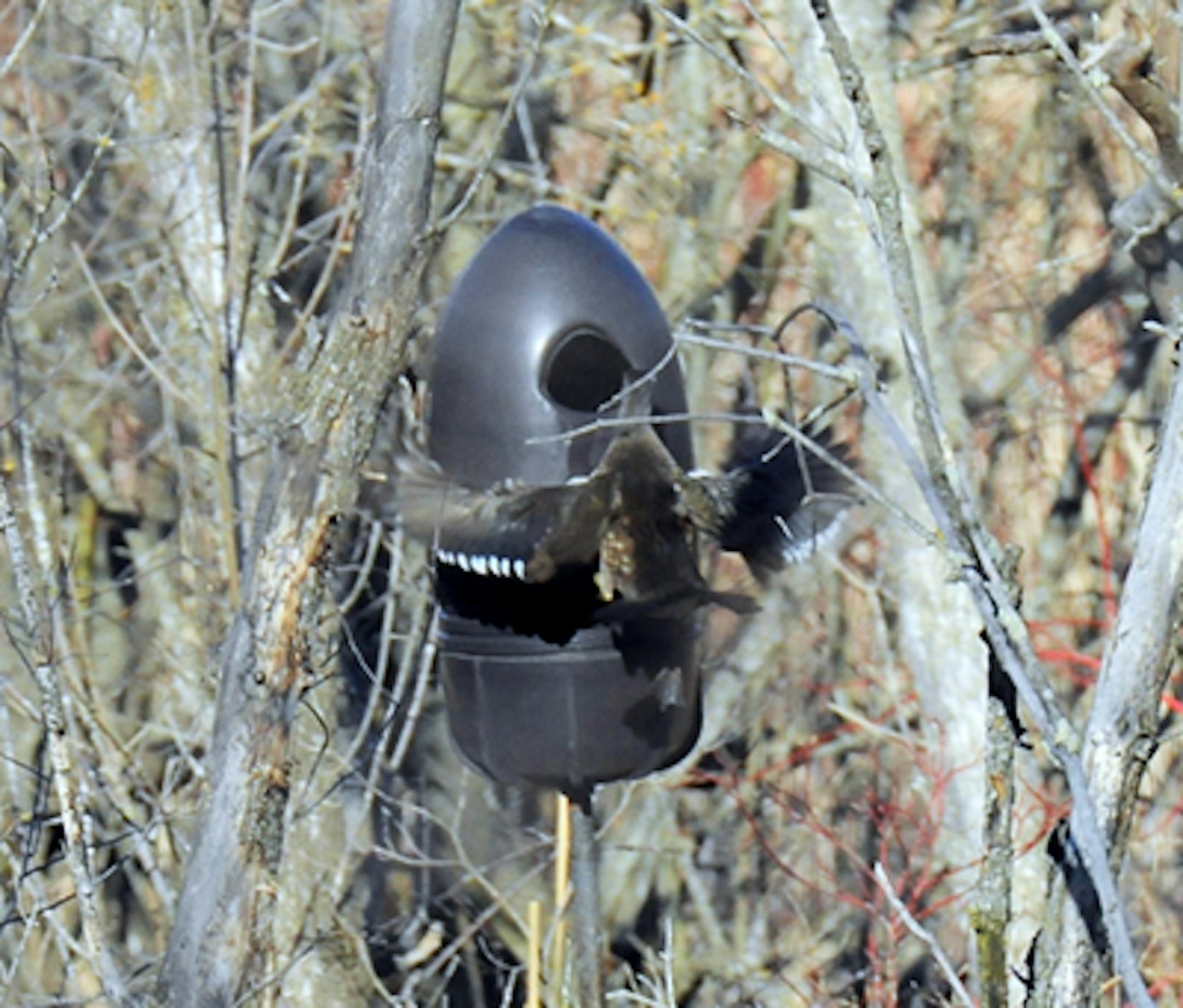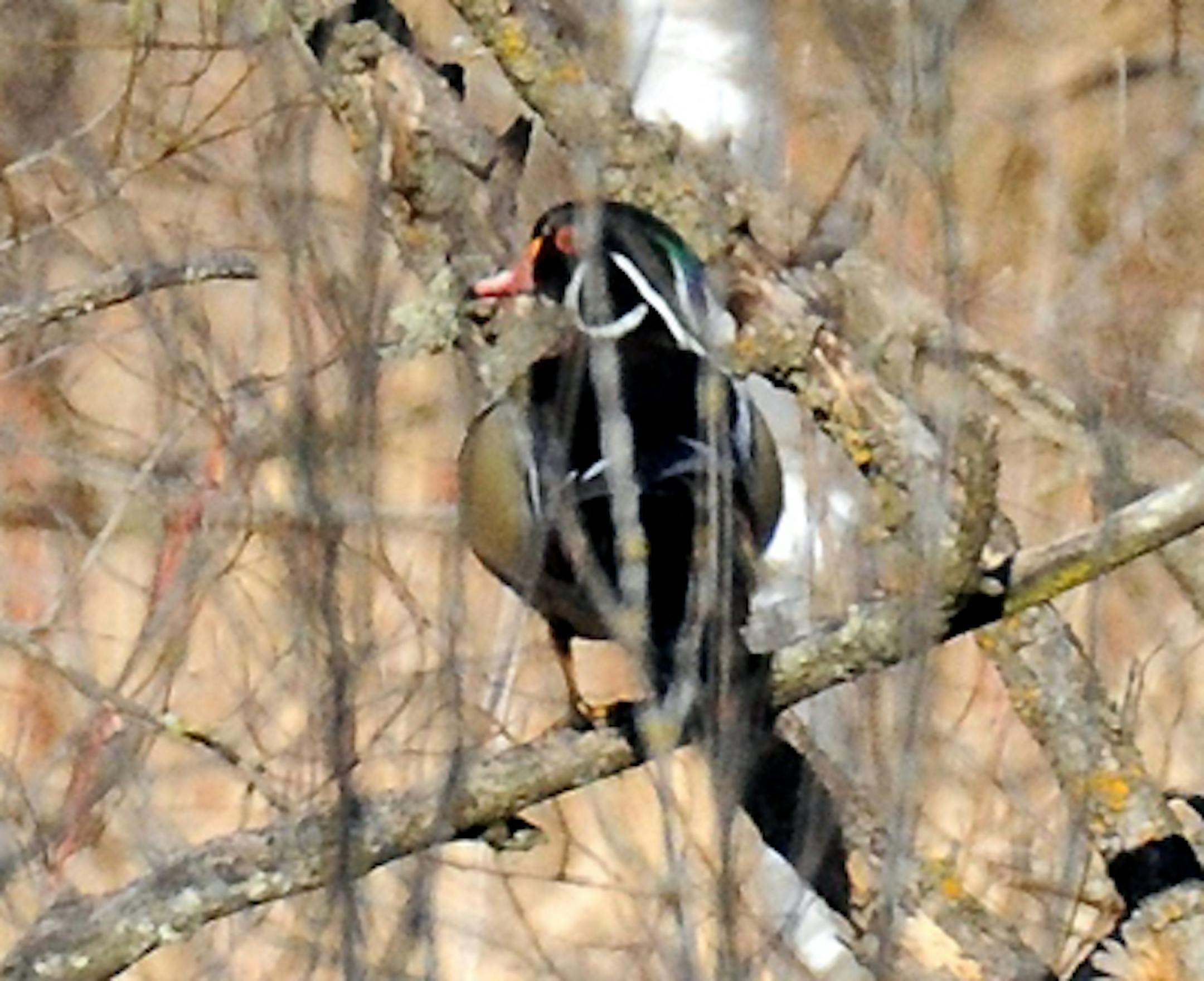 Female wood ducks are beginning to look for nesting cavaties. We have as many as 11, five pairs and a single drake, on our pond late each afternoon. Thursday morning a hen made a visit to one of the four nesting boxes we have, while her mate watched from a nearby tree. She was in and out in about two minutes. We hope she liked what she saw.