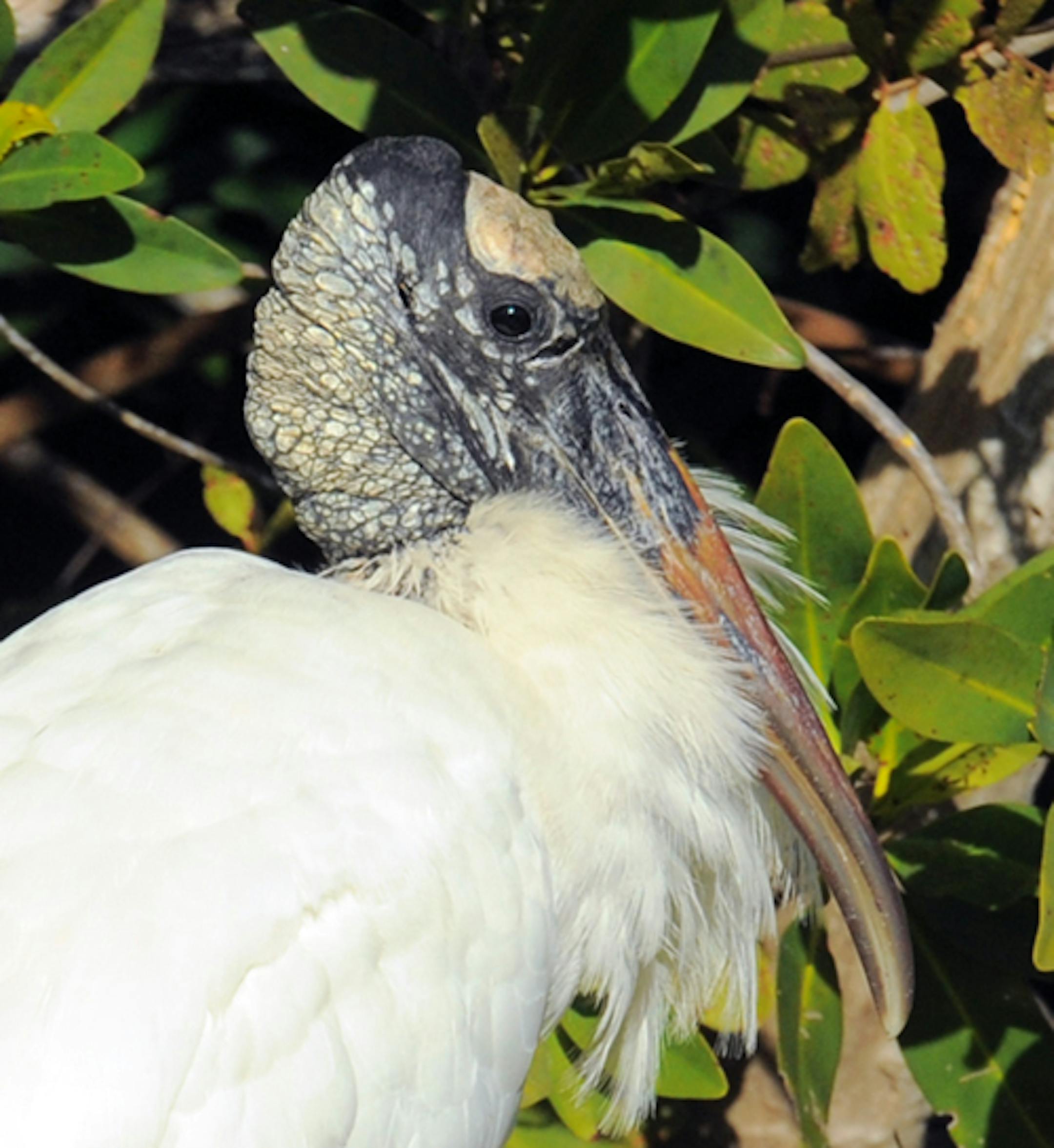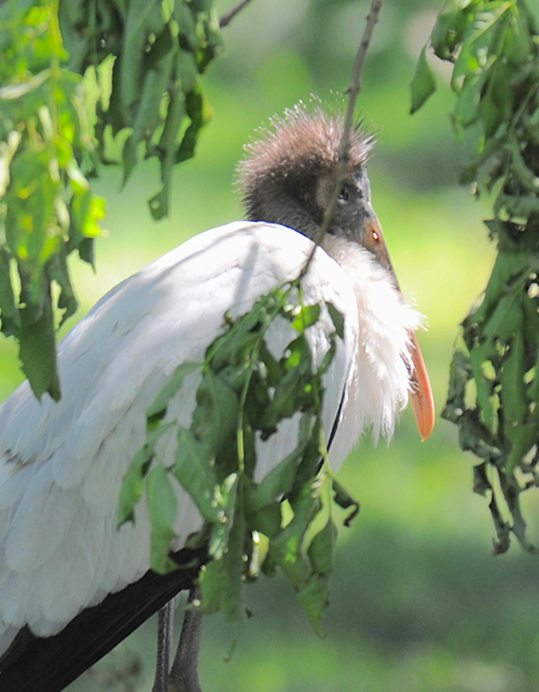 A very unusual bird has been seen for the past three days on a farm west of Blue Earth. A Wood Stork, a bird of Florida and the southeastern coast, has been entertaining birders since being reported to the birding community (email) on June 19. This is a juvenile bird, as indicated by its very pronounced head feathers. The Minnesota visitor is shown in the first photo. The second photo shows an adult Wood Stork, with its typical featherless head. Note also the difference in bill color. The Birds of North America monograph on this species explains that fledglings disperse widely after leaving the nesting colony. There are records for this species as far west as California and up the east coast into Canada. One other Wood Stork has been reported here, in Grand Marais several years ago. Both Dakotas, Iowa, and Wisconsin have records. In its usual habitat Wood Storks eat mostly fish. The diet can include insects, snails, crayfish, frogs, snakes, birds, small mammals, as well as some plant material. The Blue Earth stork has been seen feeding in standing water in a field adjacent to the farm. No one has offered comment on what it might be eating. Nor can anyone say how long it will remain. Wood Stork is the only stork species breeding in the U.S., and is our tallest wading bird, measuring just over three feet tall. Folk names for this species include Flinthead and Ironhead. The adult bird shown here was photographed along the west coast of Florida three years ago.