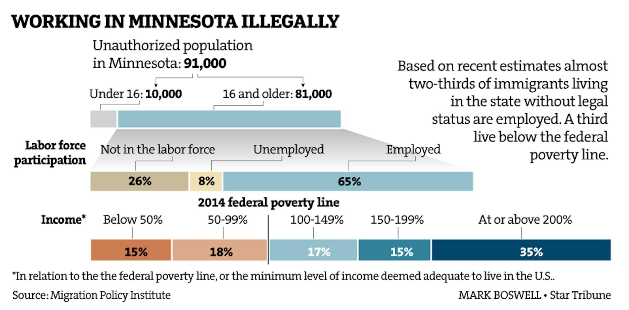 Based on recent estimates almost two-thirds of immigrants living in the state without legal status are employed. A third live below the federal poverty line.