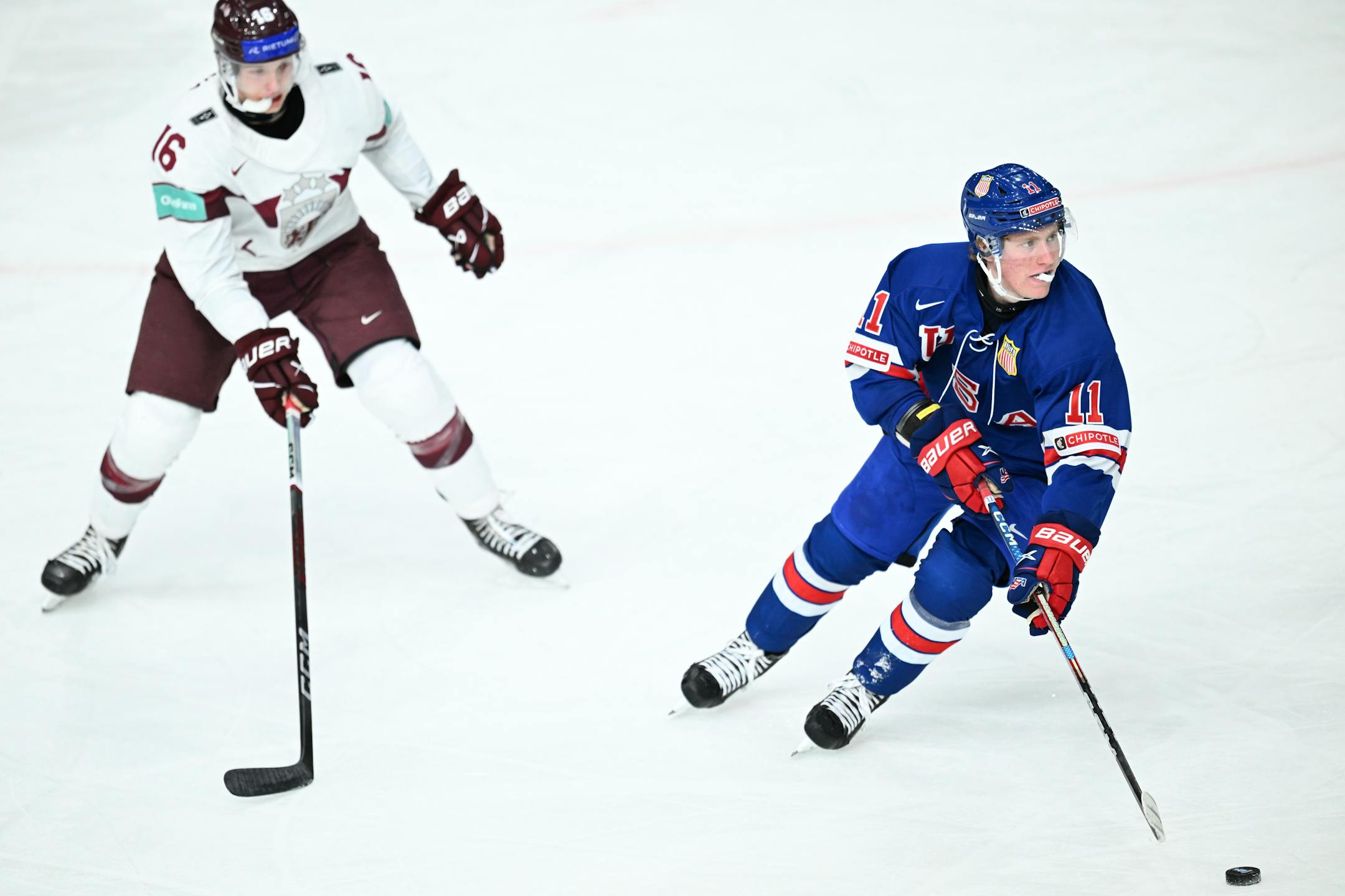 Dans Locmelis, who plays for UMass-Amherst, scored both Latvian goals. His UMass teammate, goaltender Michael Hrabel, was the hero as Czechia upset Canada earlier in the day.