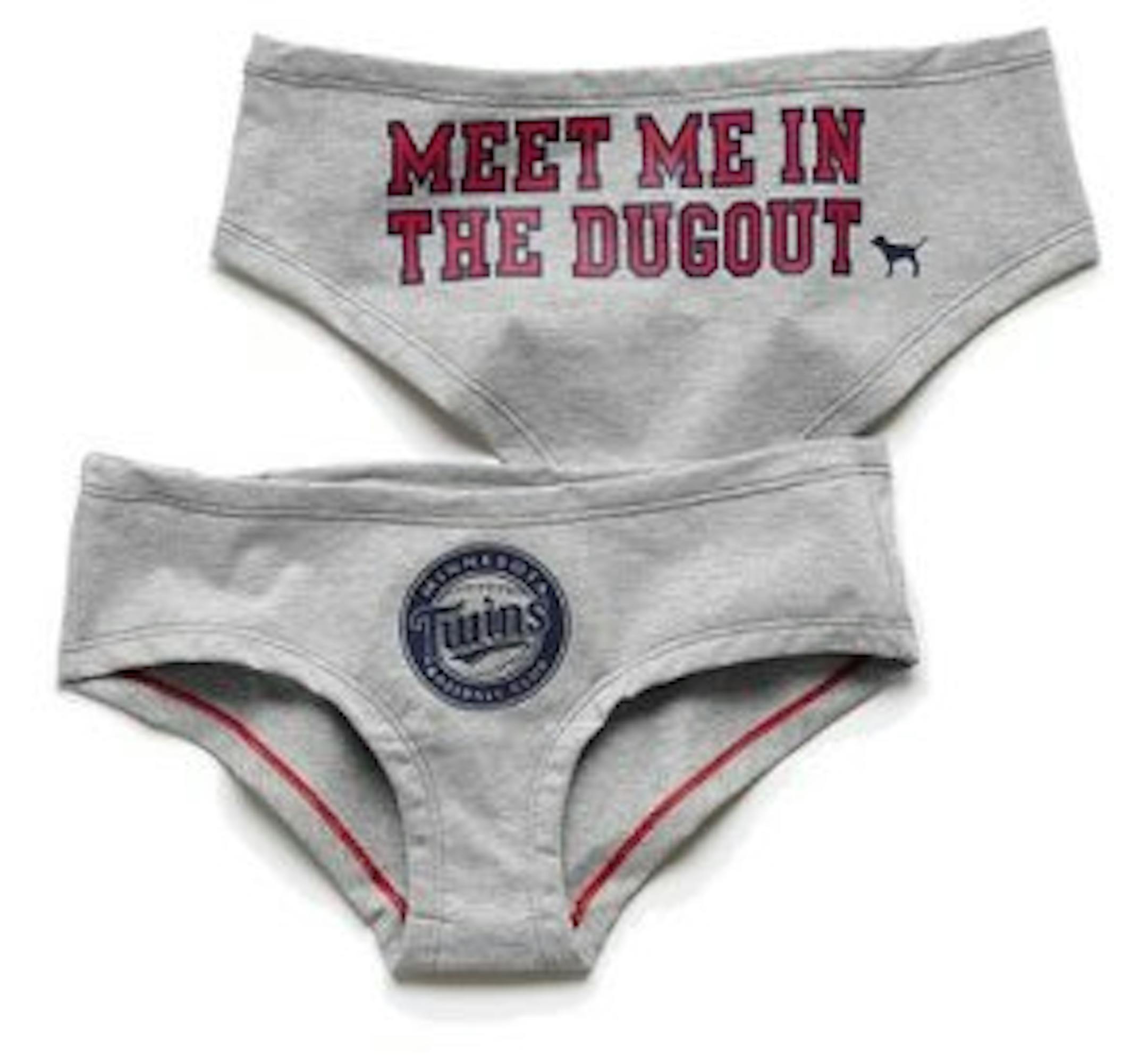 Commenter Fasolamatt, who spends anywhere from 2-3 hours on the Victoria's Secret web site every day (he did not really say that), passes on a link that Twins fans -- or Twins fans with special lady friends -- might like. Apparently you can buy Twins "hipster" undies (picture to the right). The design is pretty clear, and the double-meaning is believed to be intentional. They are also available with a "caught looking" message on the hind quarters.